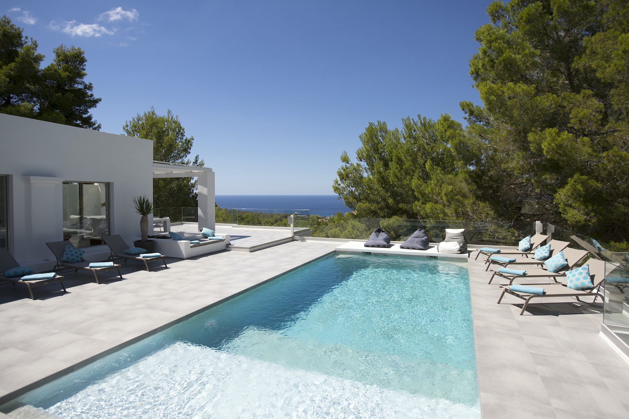 From the pool terrace, outdoor dining area and private terraces, guests enjoy gorgeous views of the turquoise waters of the bay to Conejera Island and beyond. Looking down the hillside, you can see boats bobbing in the water in the harbor of Cala Tarida. The beach is just four minutes away and here you’ll discover the famous Cotton Club restaurant. The hardest decision of all vacations – is the sunset from the Cotton Club’s rooftop bar better or in your own Ibiza villa?