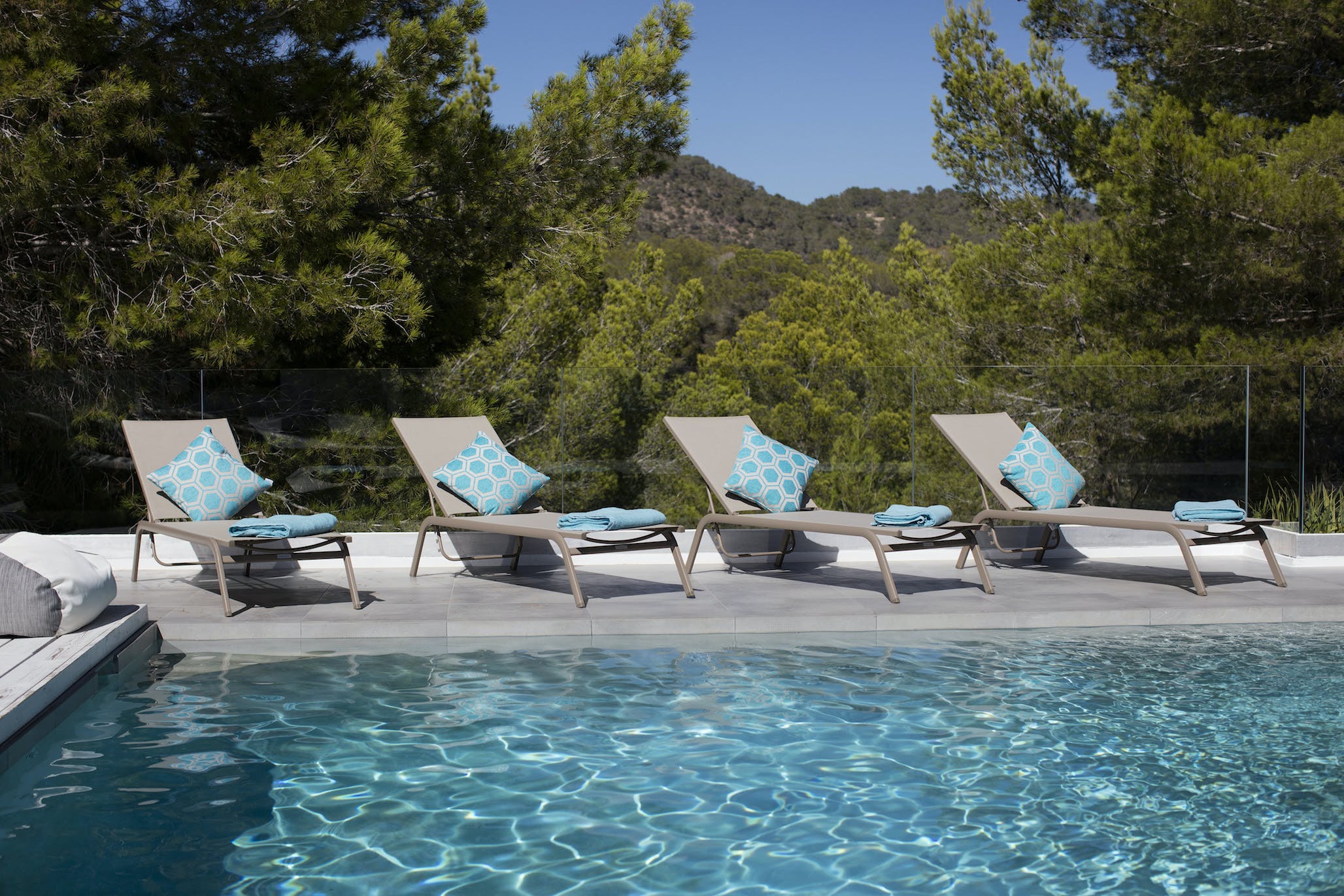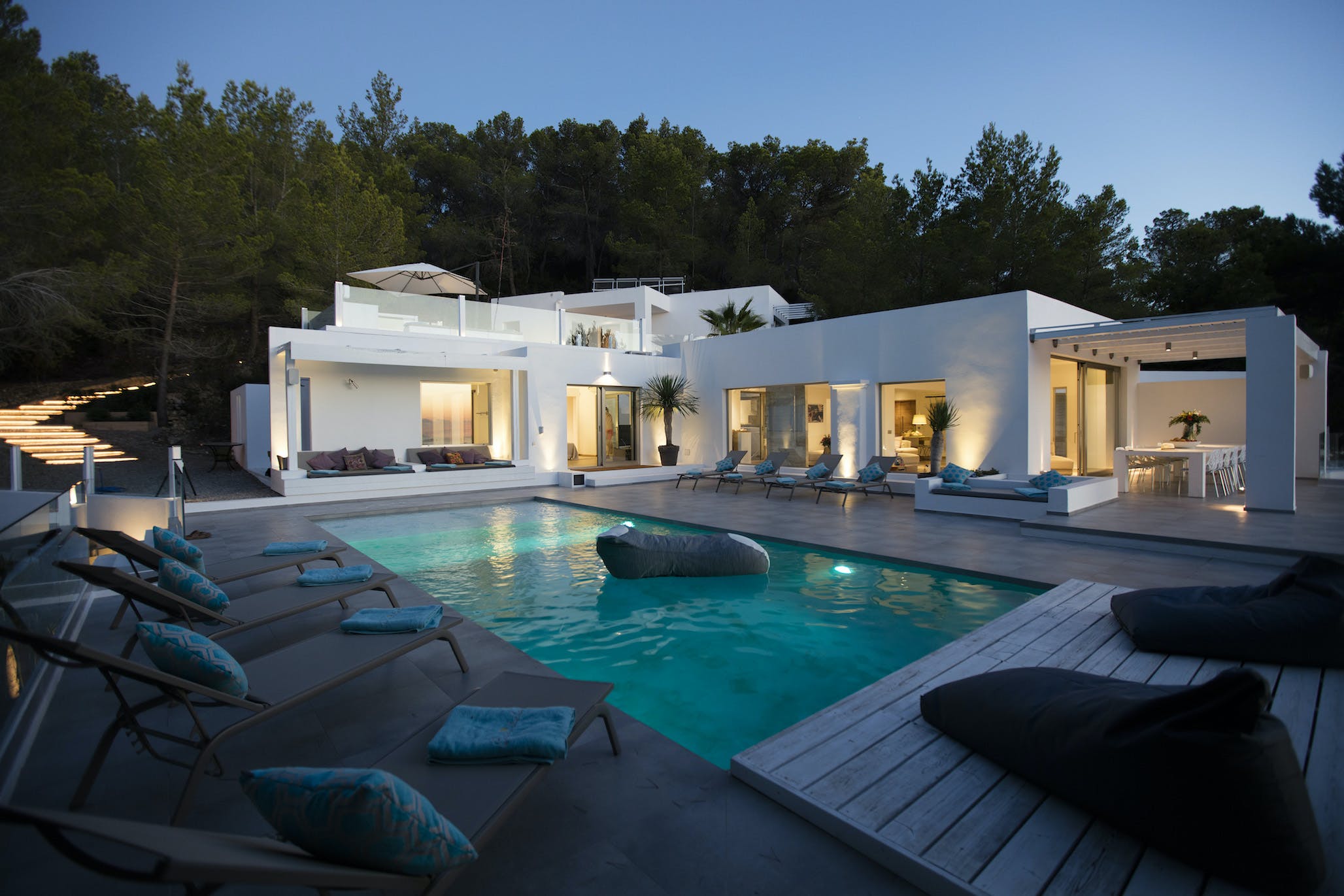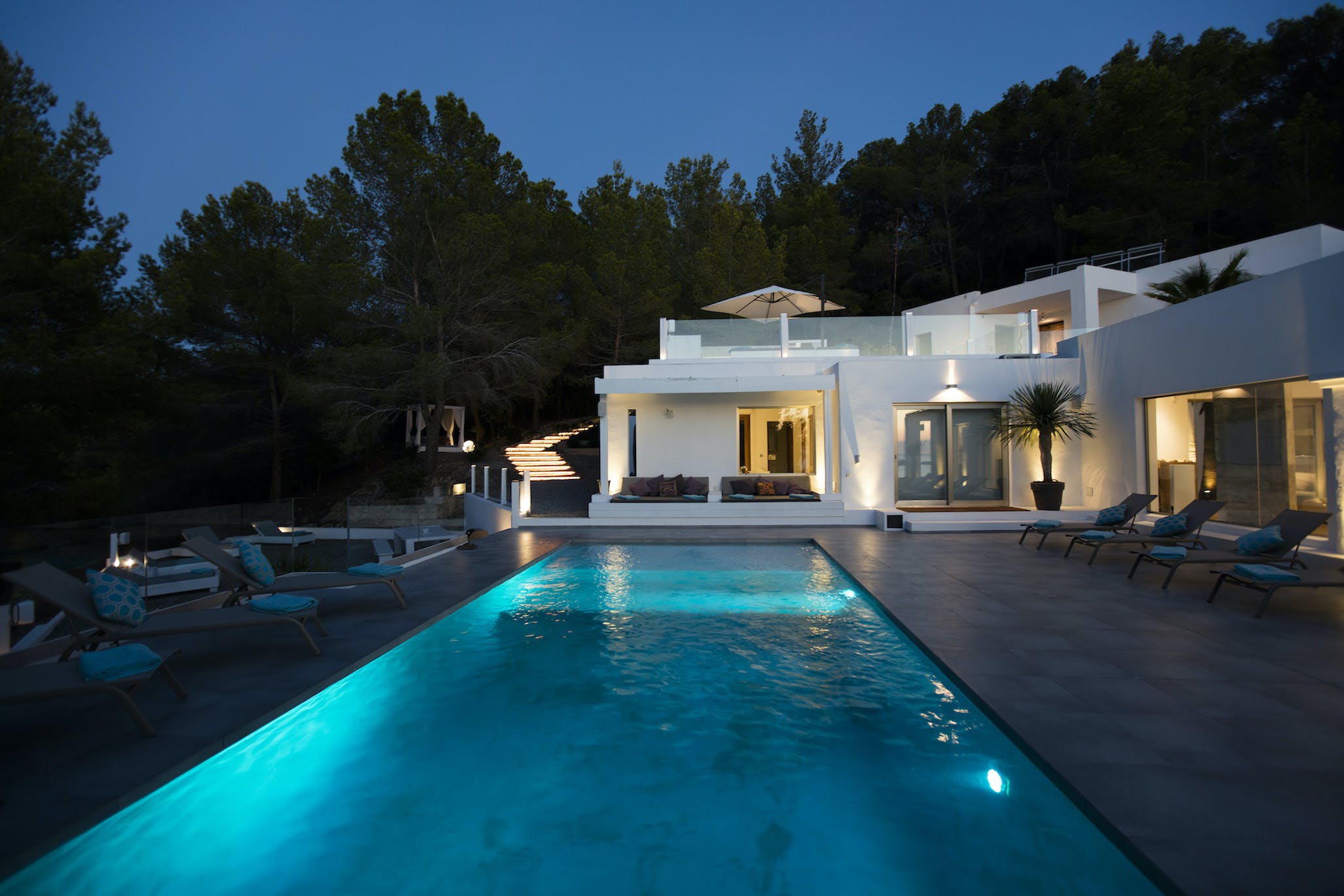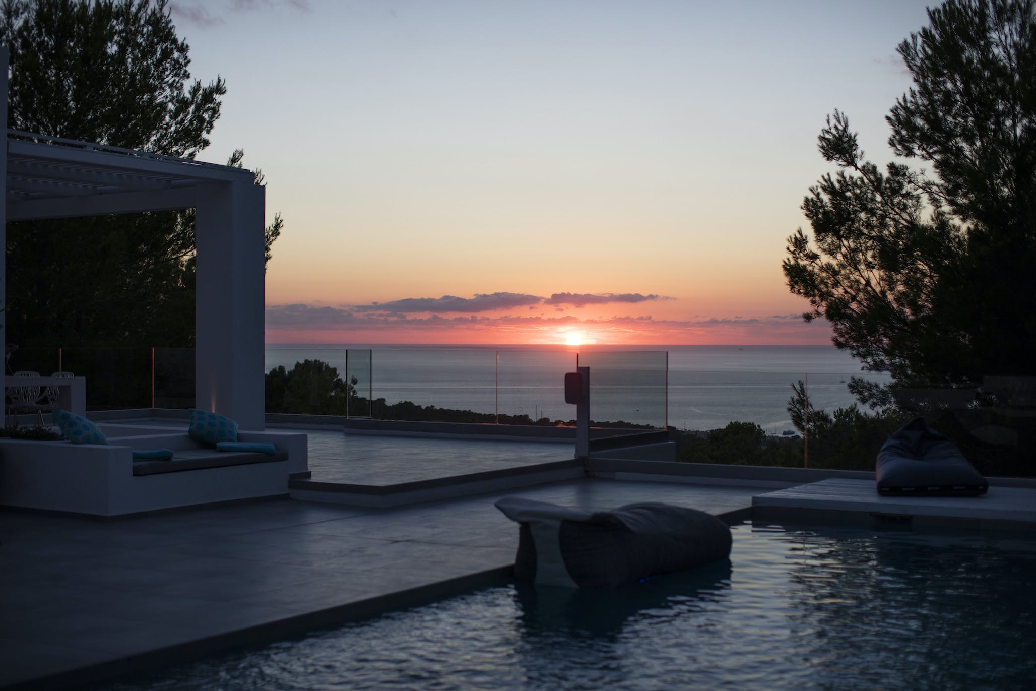 The Ibizan sun rises over the trees behind the property, lingers long in the warm blue Ibiza sky and then falls magnificently into the sea, bathing this little corner of the Mediterranean in the vibrant sunset hues for which this island is known.