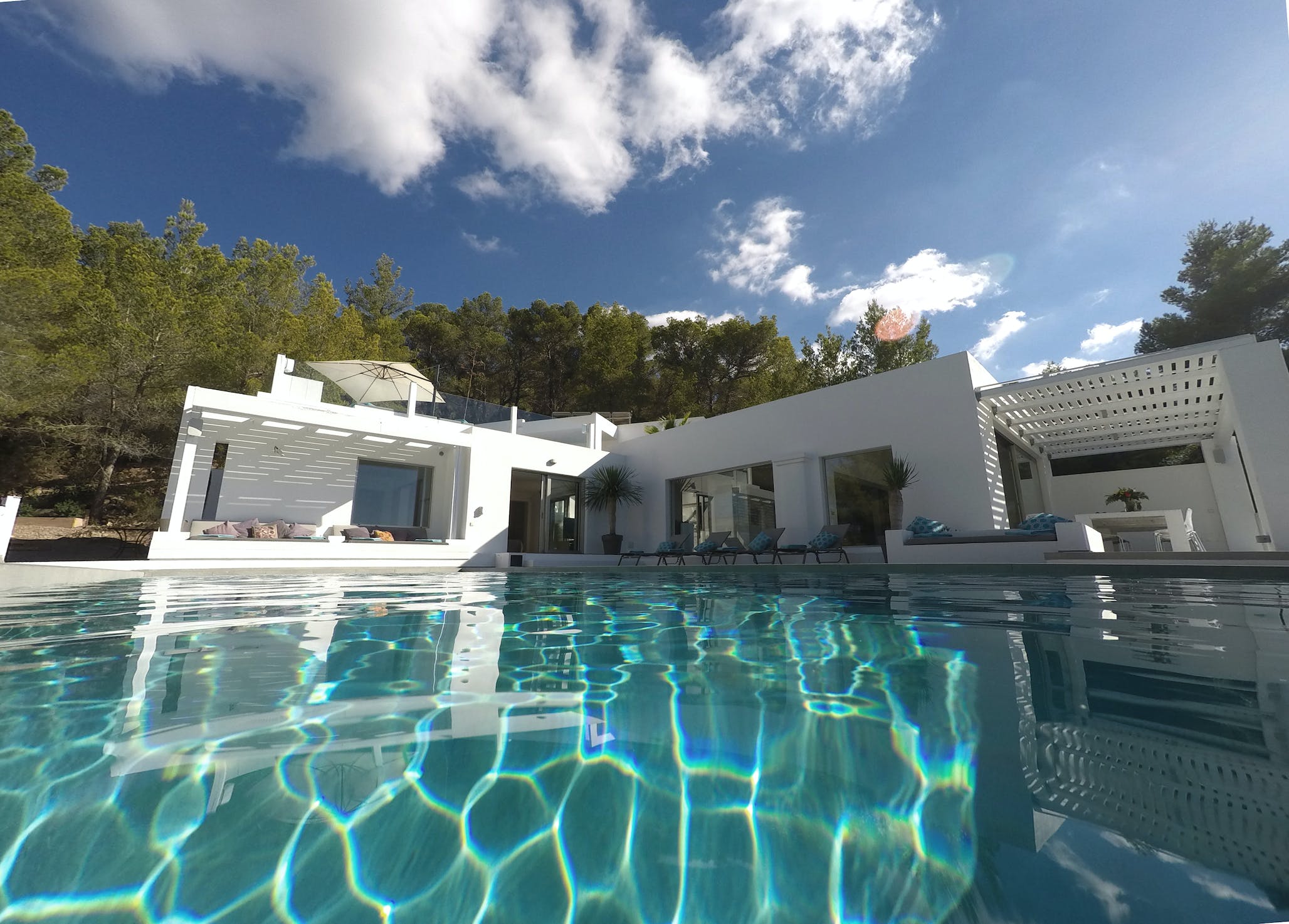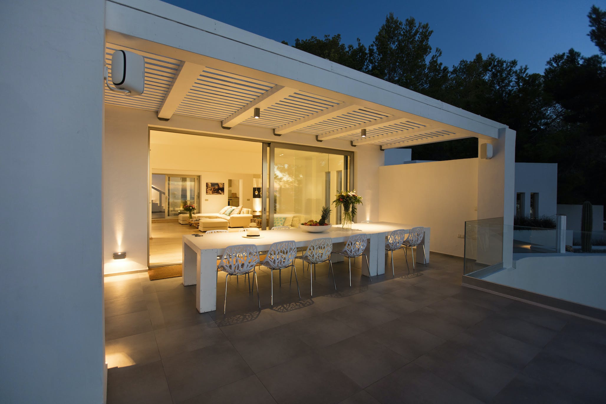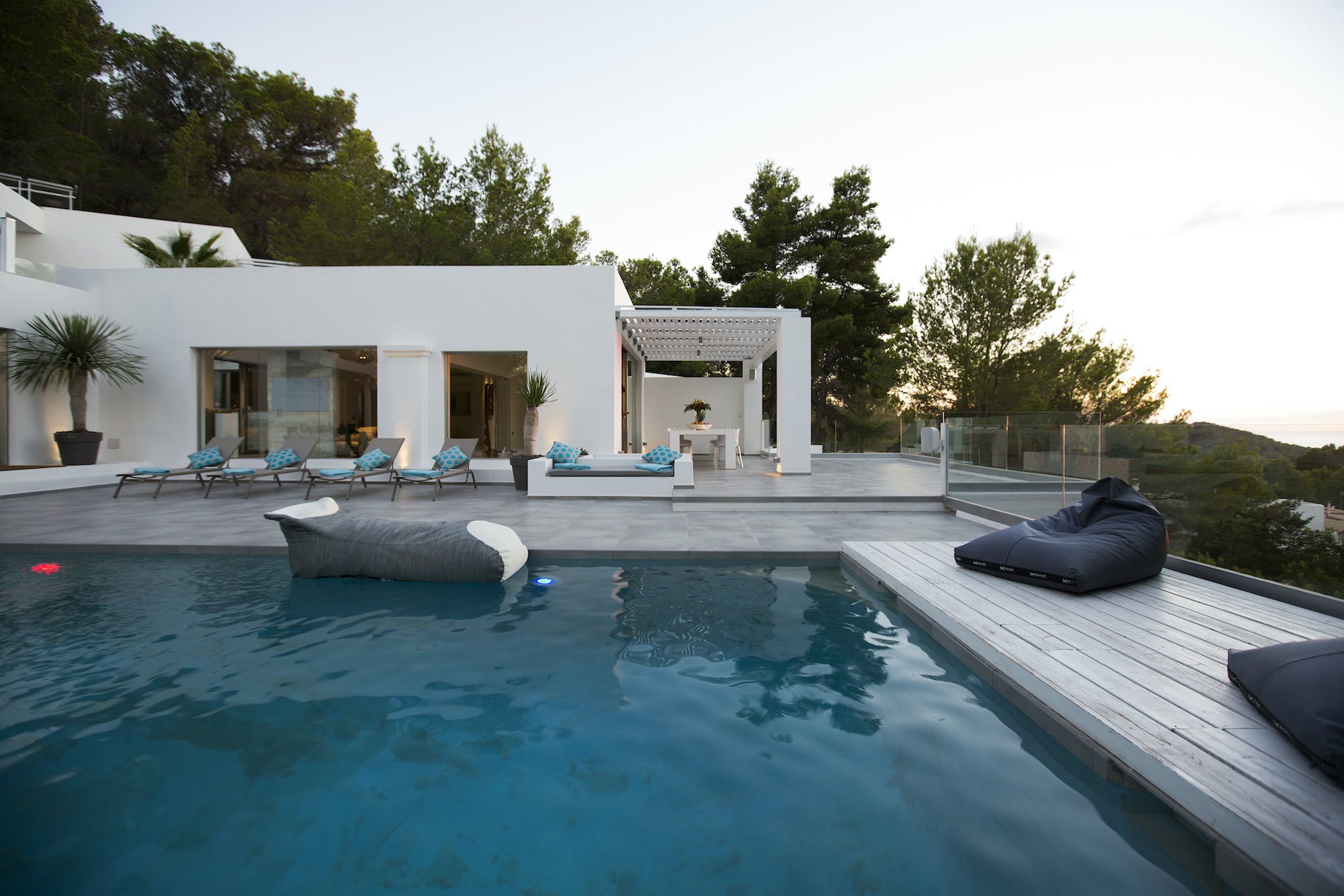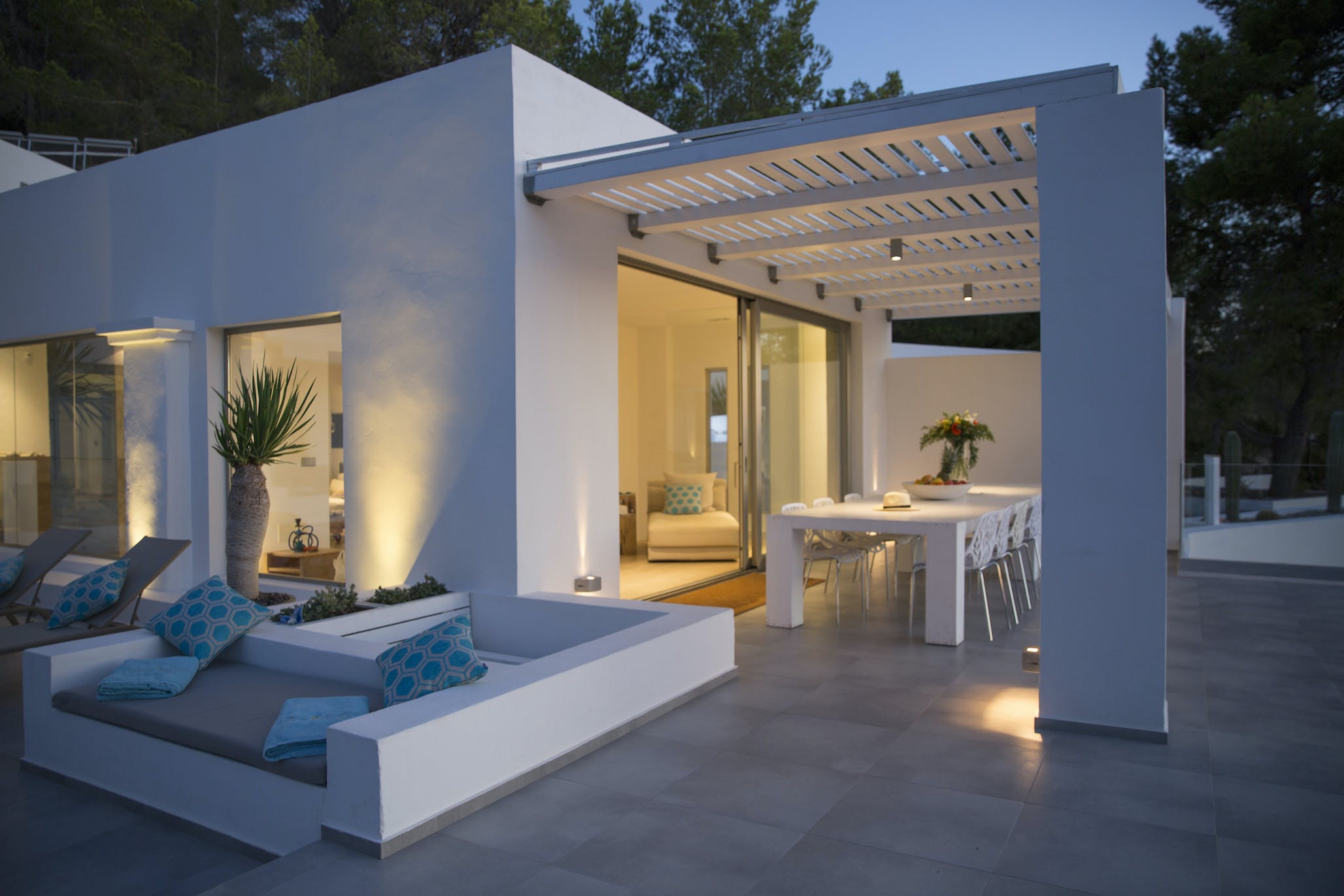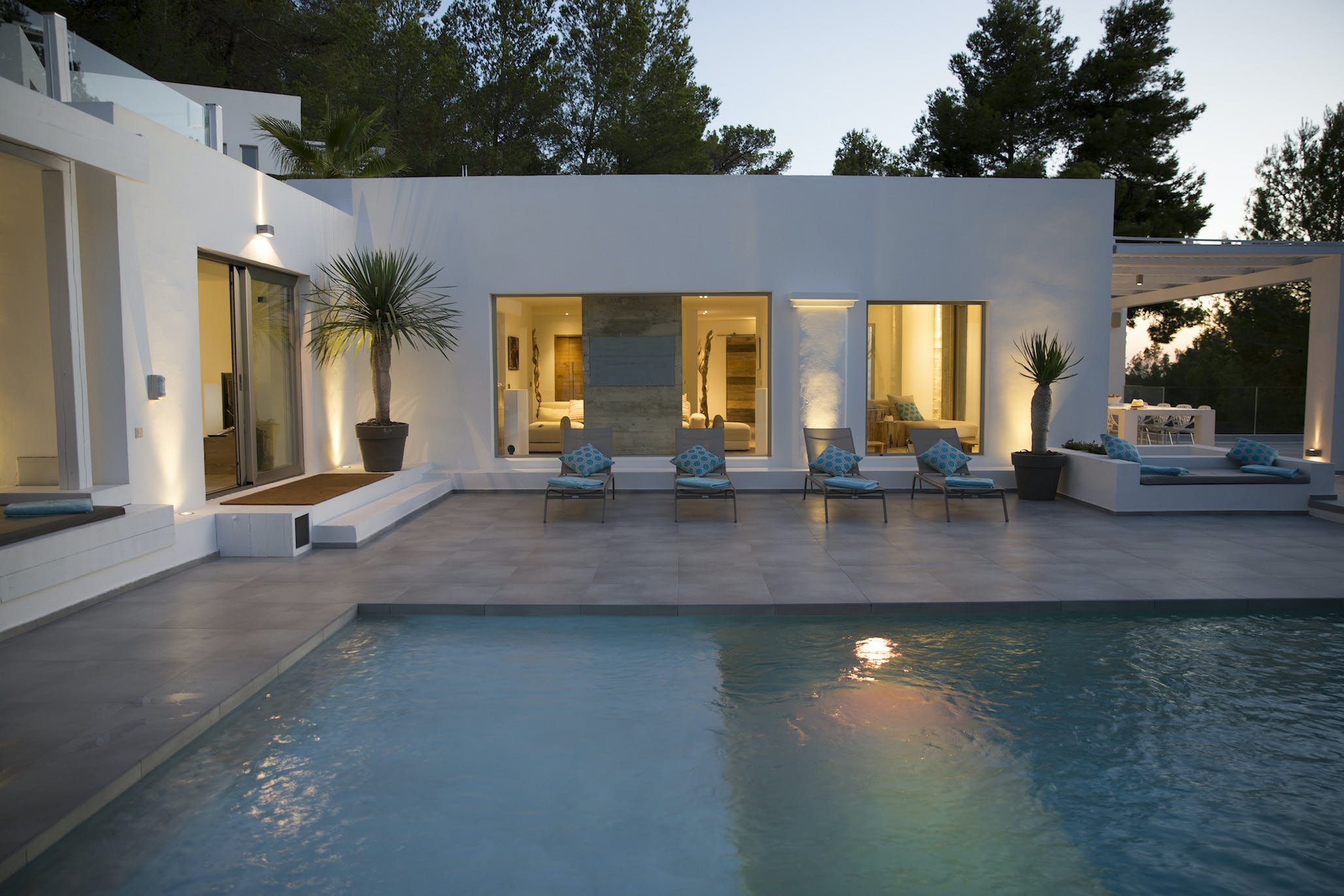 The Ibizan sun rises over the trees behind the property, lingers long in the warm blue Ibiza sky and then falls magnificently into the sea, bathing this little corner of the Mediterranean in the vibrant sunset hues for which this island is known.