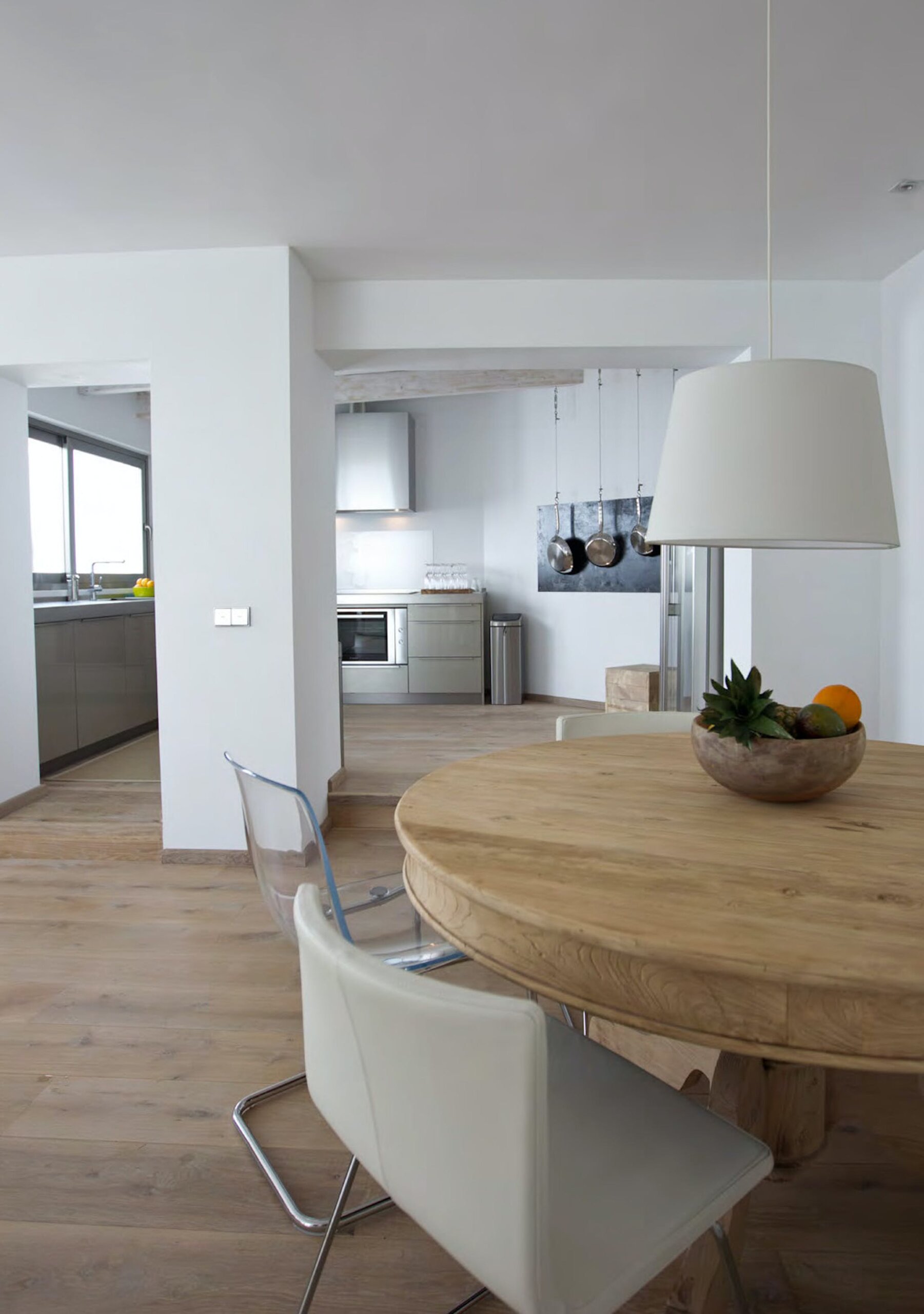 Inside, cool cottons and bleached wood create a contemporary coastal ambiance. Sleek stainless steel fixtures and furnishings make for a professional kitchen, open to the indoor dining area to create a relaxed and sociable atmosphere.