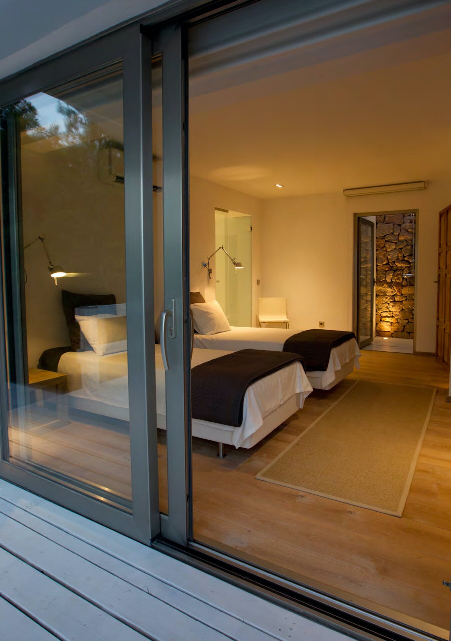 Twin beds, en suite bathroom with shower, dressing room, chill out terrace, private chill out terrace, sunset and sea views – Ground floor.