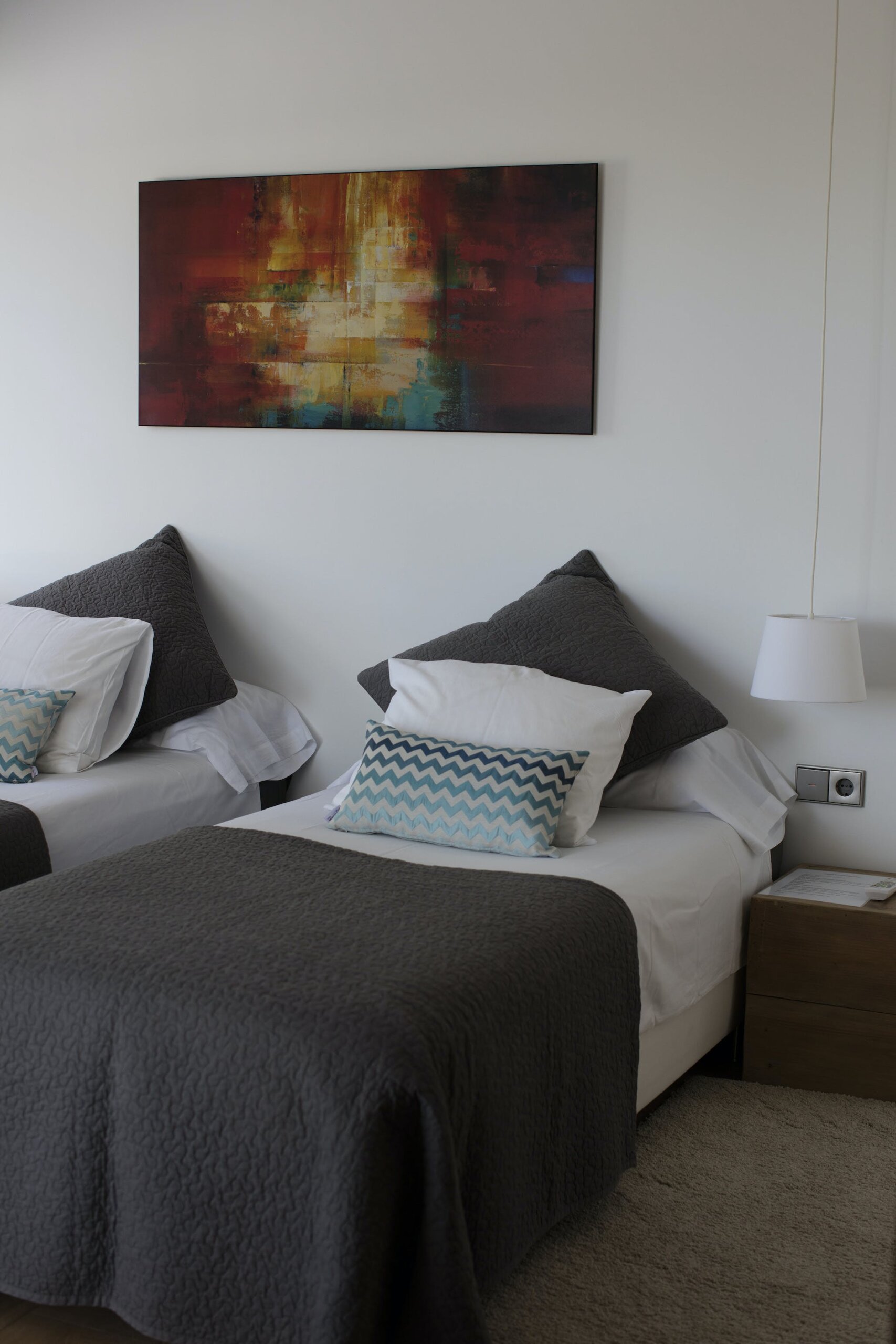 Two single beds, bathroom with shower, sea and sunset views – Guest area.