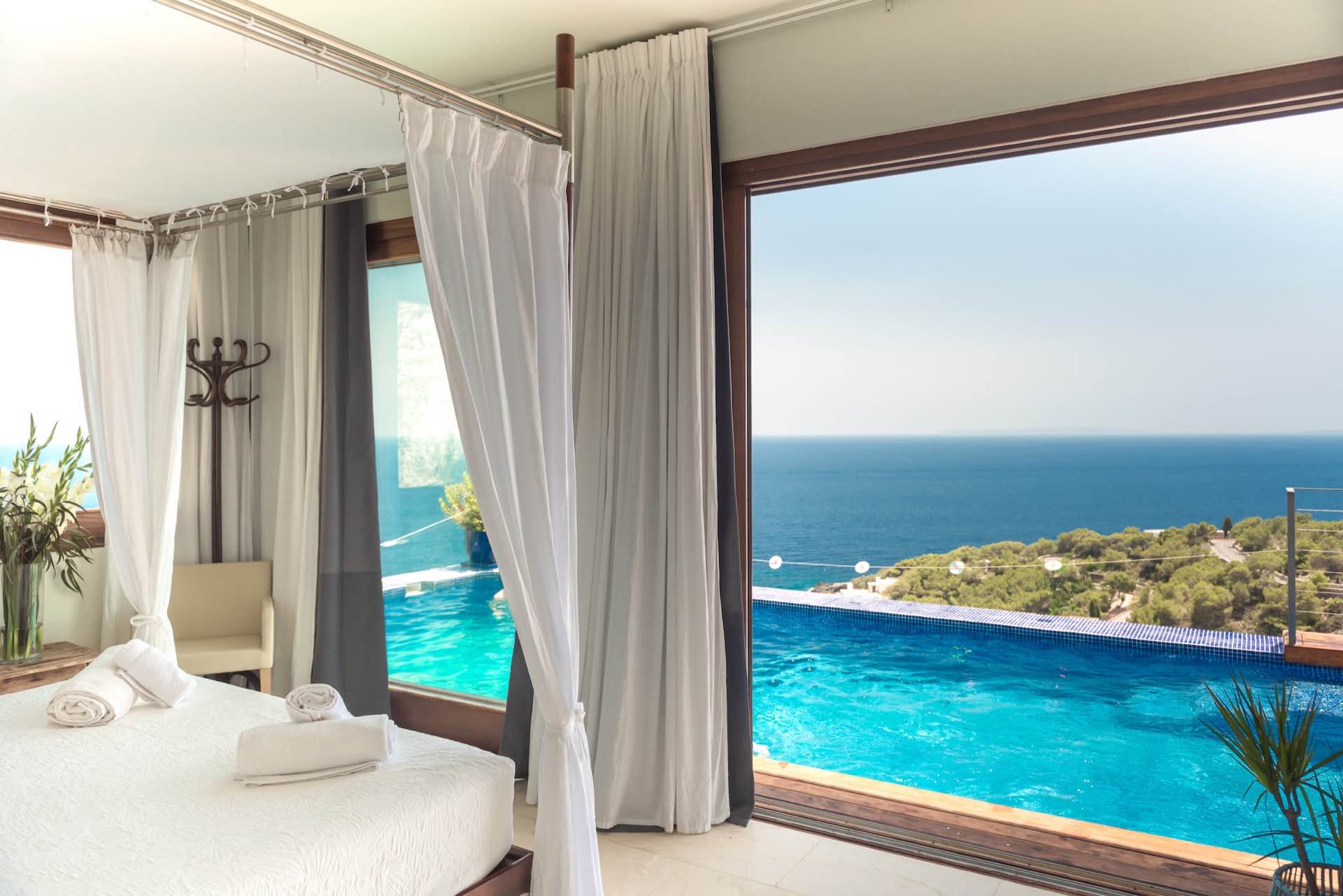 Lit king size, climatisation, vue sur la mer, accès direct à la terrasse de la piscine. Salle de bain attenante avec baignoire et douche.