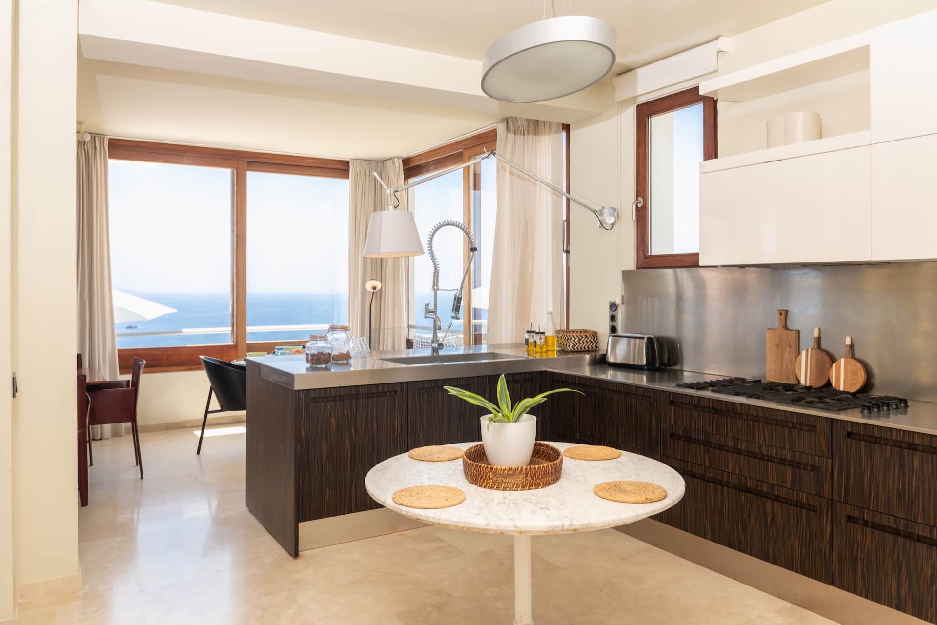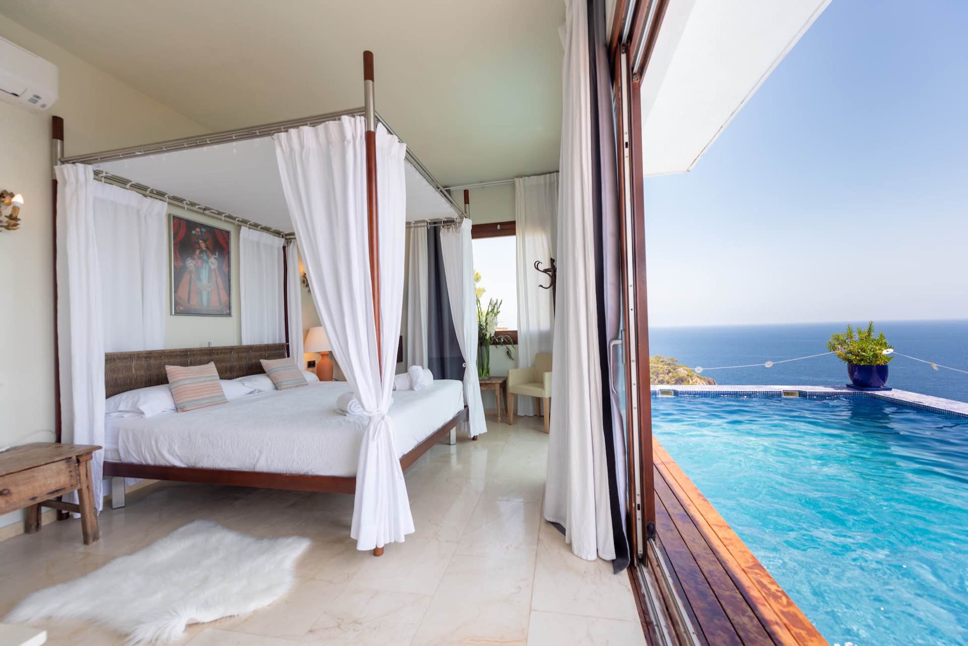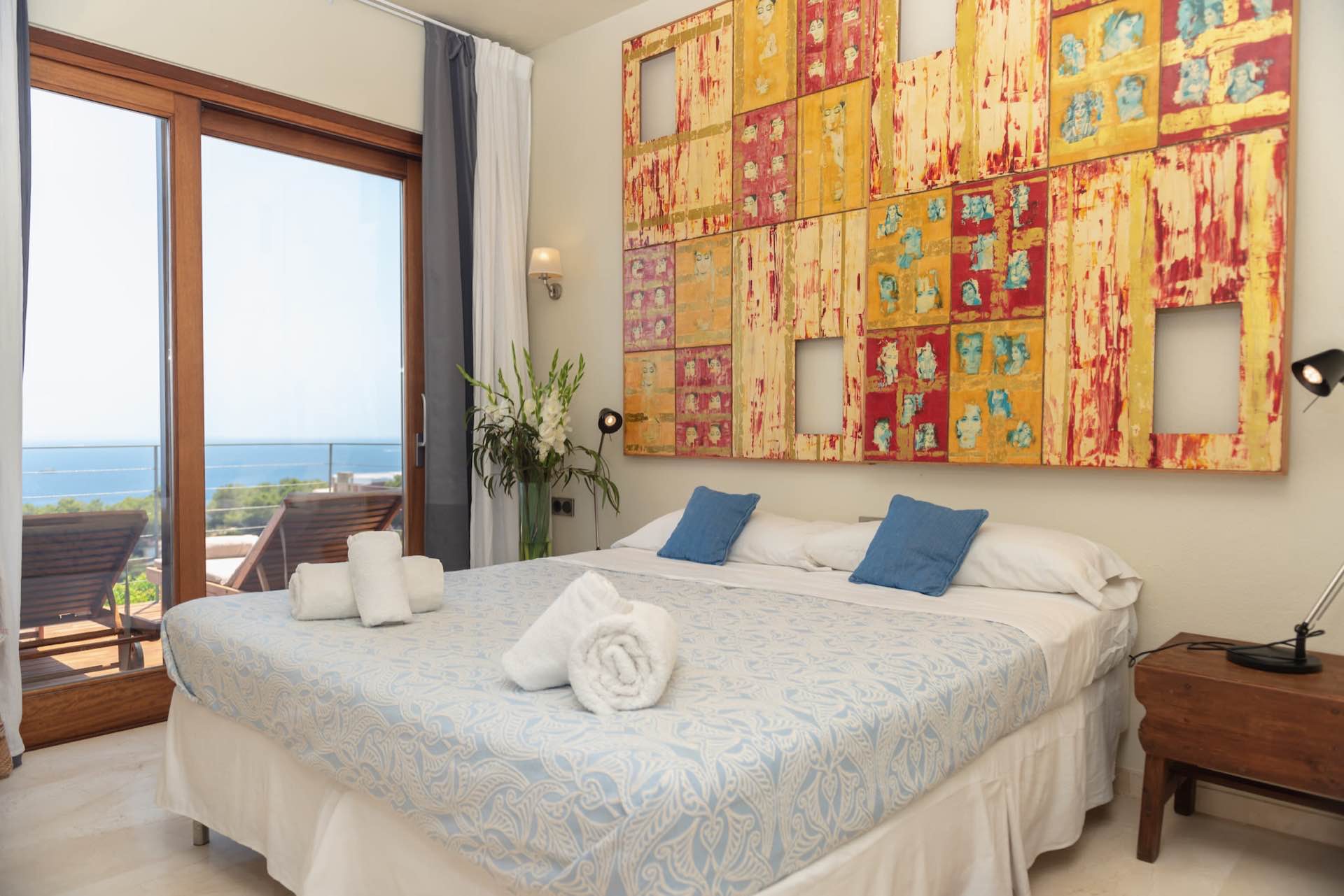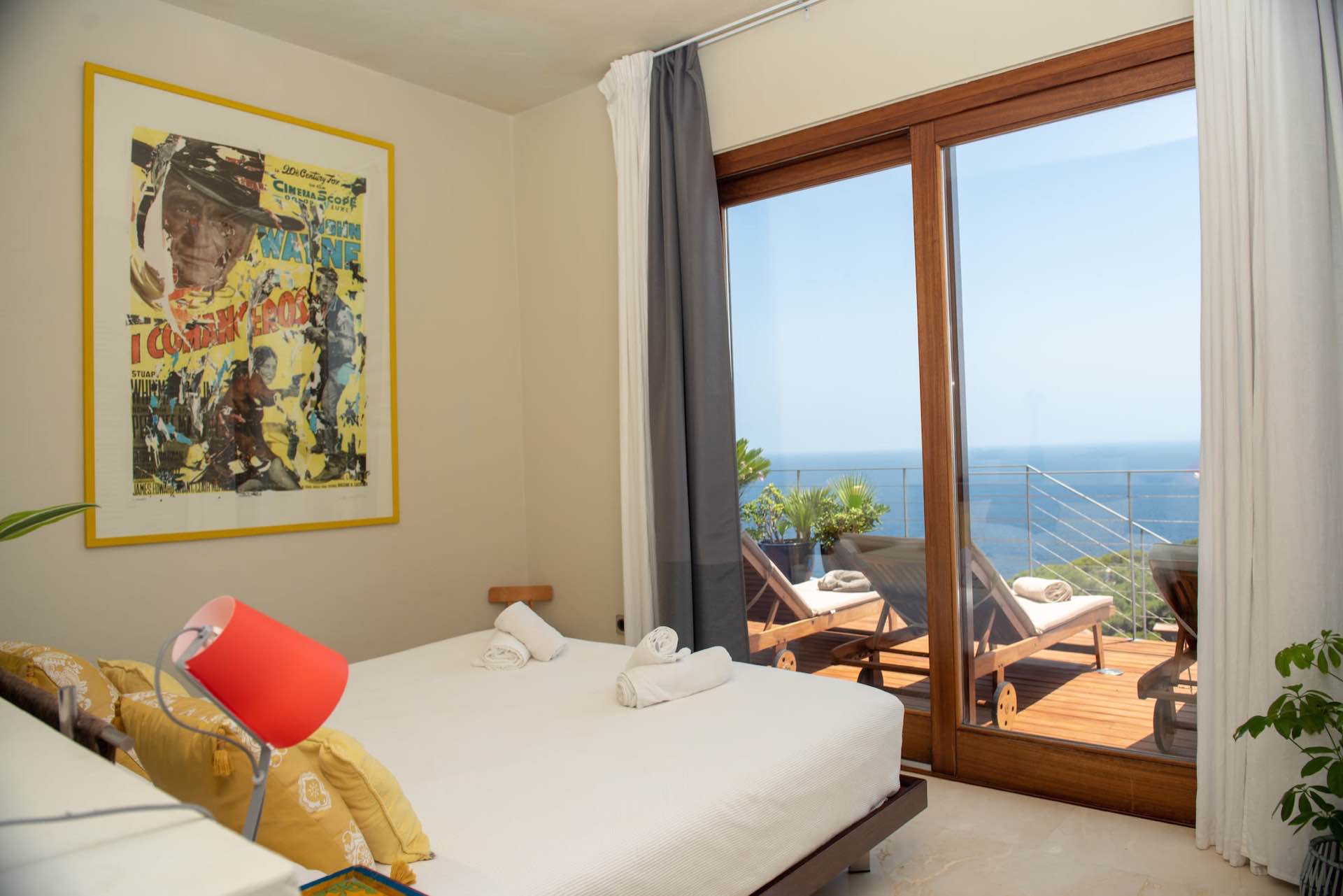 Lit double, climatisation, vue sur la mer, accès direct à la terrasse de la piscine, accès à 1 des 2 salles de bains communes.