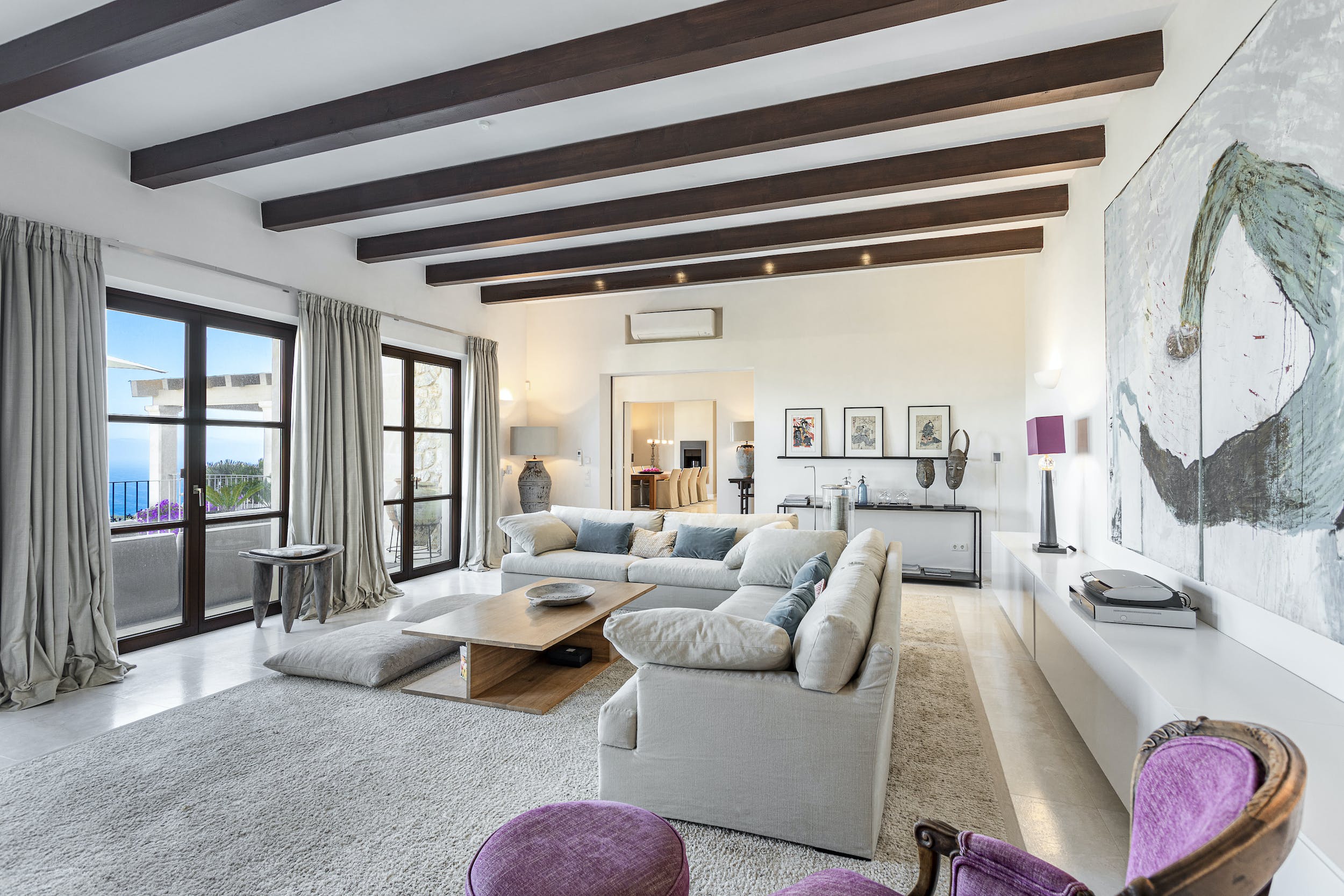 Enter through a grand hall into sunlit interiors that flow seamlessly between sophisticated dining areas, cozy lounges, and open views of the coastline. Every room is bathed in natural light and adorned with stylish furnishings, giving the entire home an atmosphere of relaxed luxury.