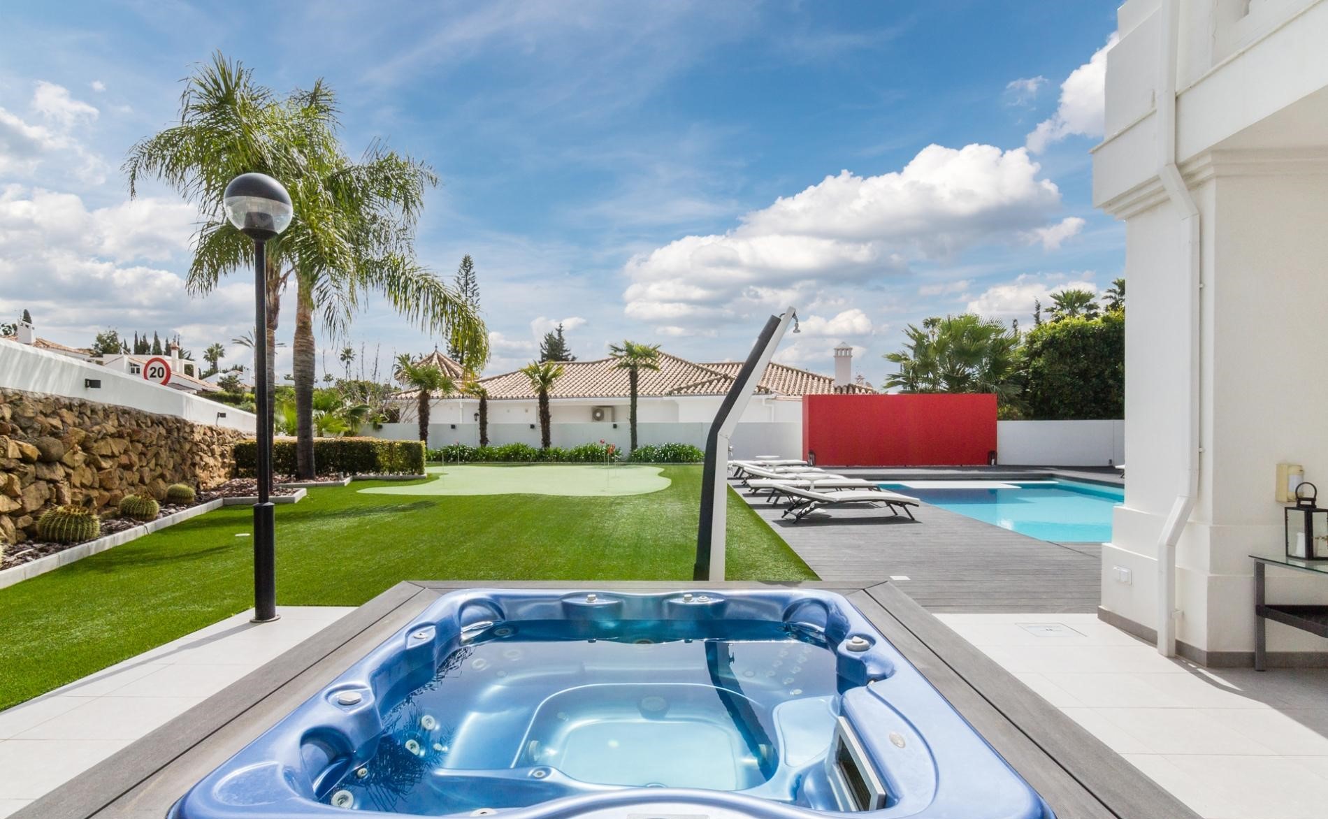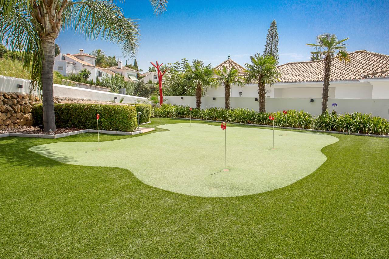 Outdoors, the villa is a haven of leisure and beauty. Lounge by the pool, enjoy sundowners in the jacuzzi, or perfect your aim on your private golf putting green and petanque court — all set against a breathtaking natural backdrop.