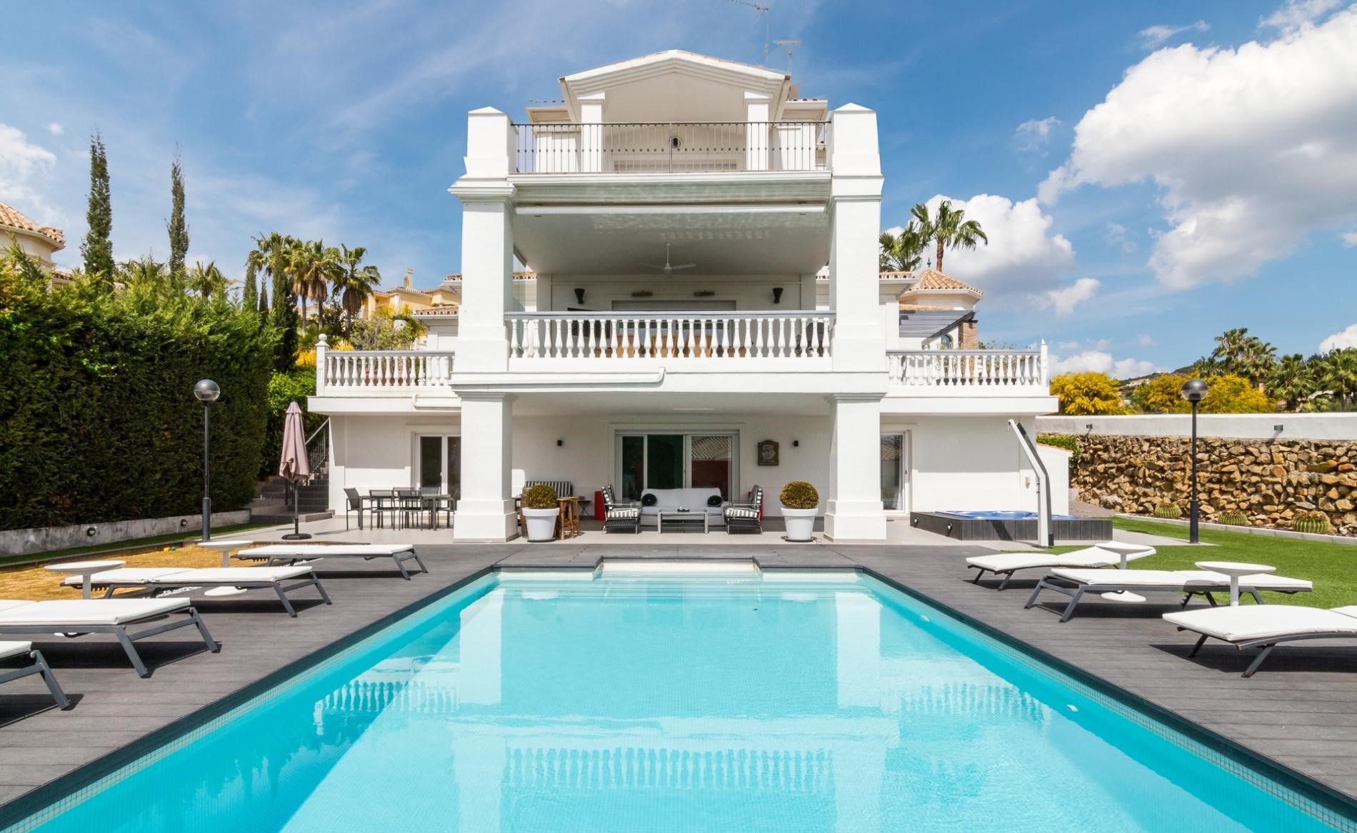Tucked within the lush landscape of Nueva Andalucía, Pearl Whitman is a radiant 6-bedroom retreat that exudes elegance, privacy and sophistication. Overlooking the rolling greens of the Golf Valley and framed by majestic mountain views, this newly built villa is a sanctuary for those who cherish quiet moments, effortless luxury, and the golden rhythm of Mediterranean living.