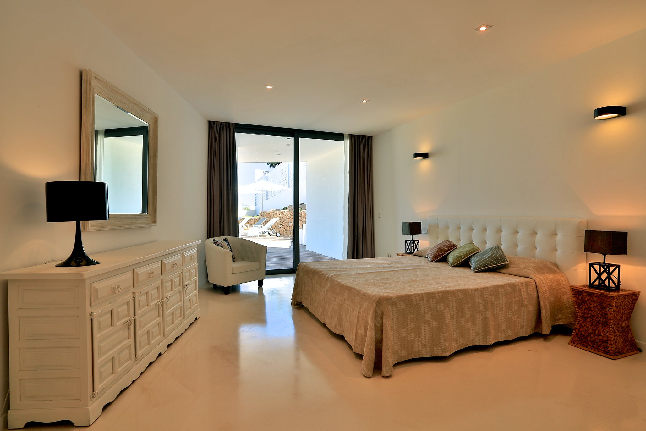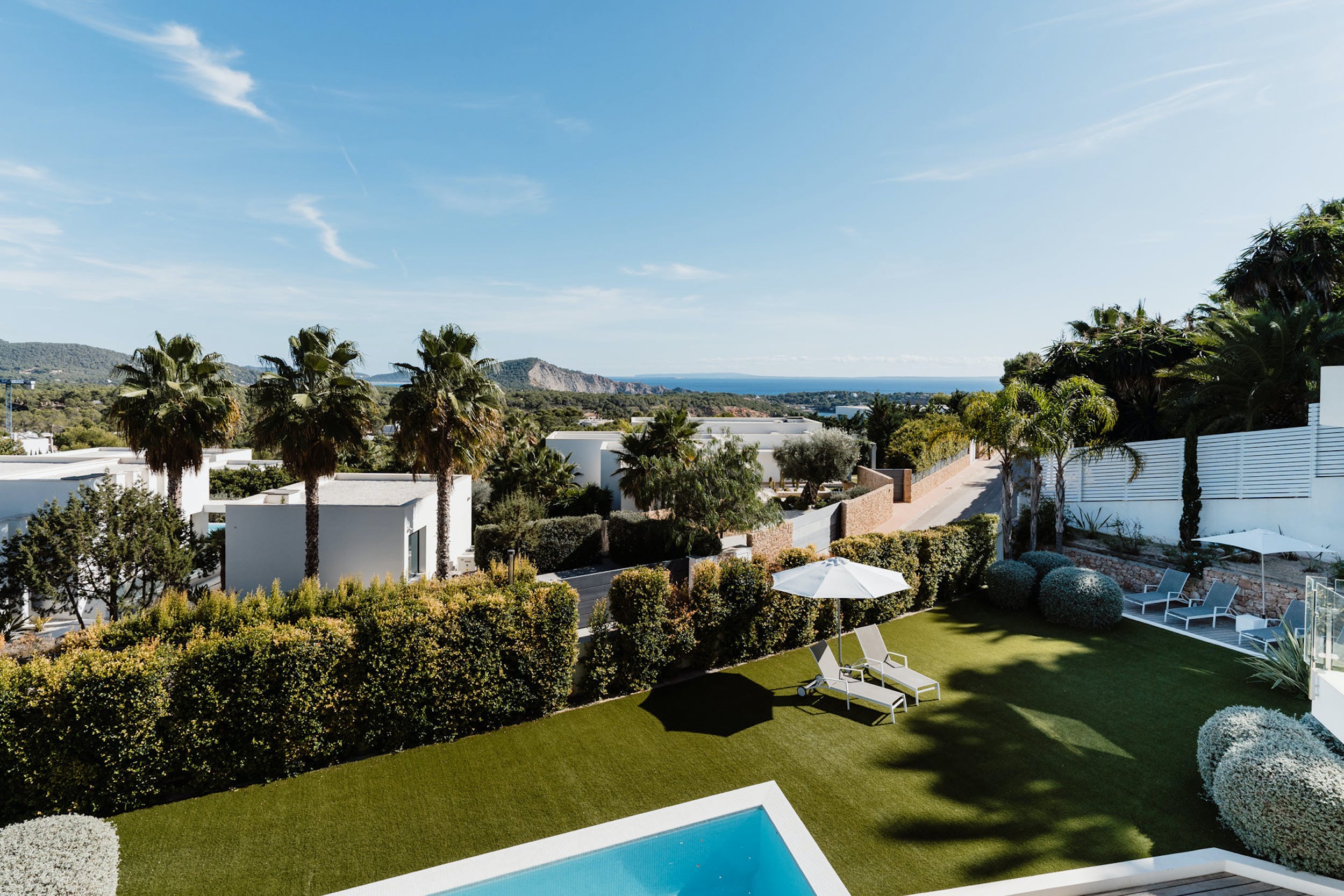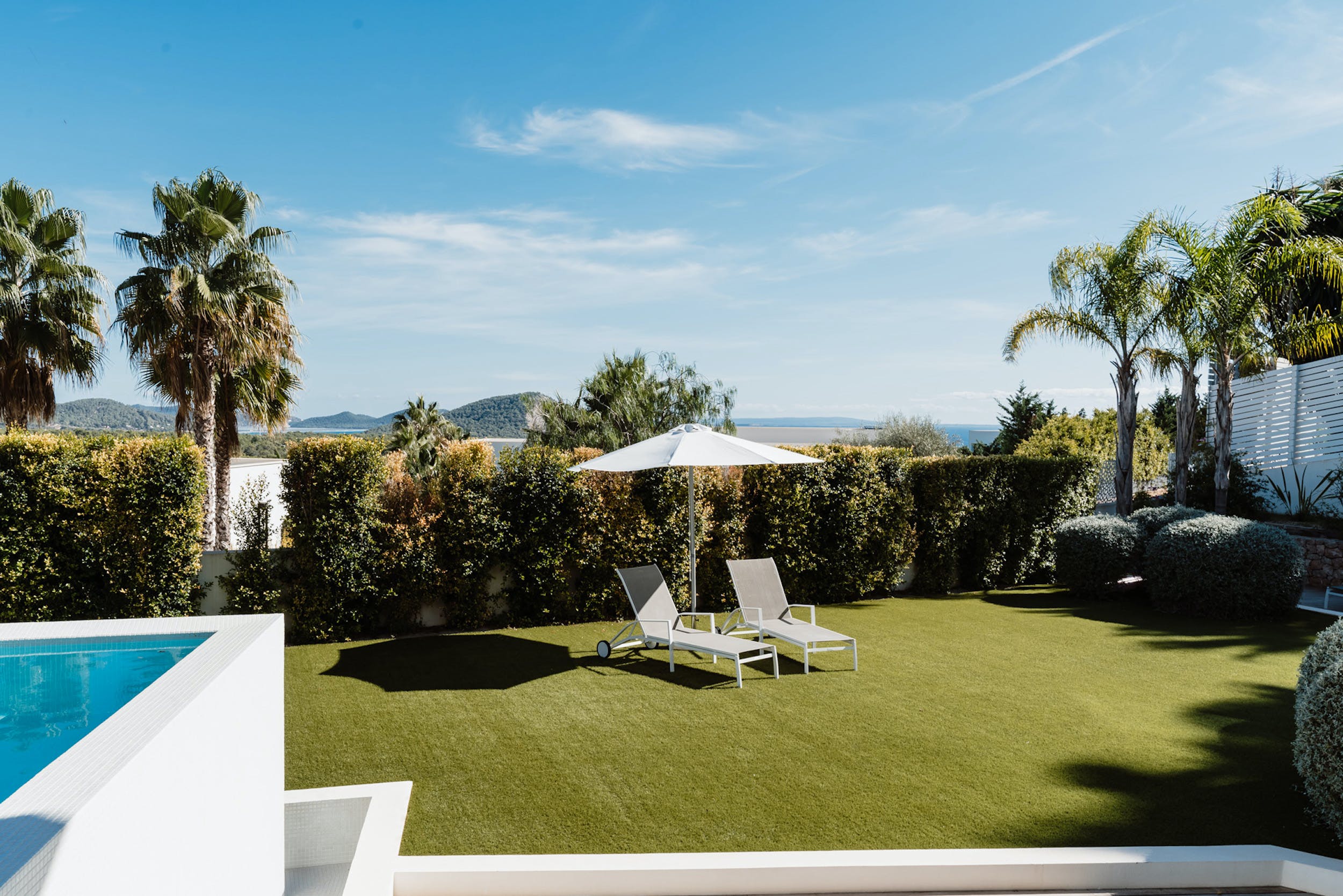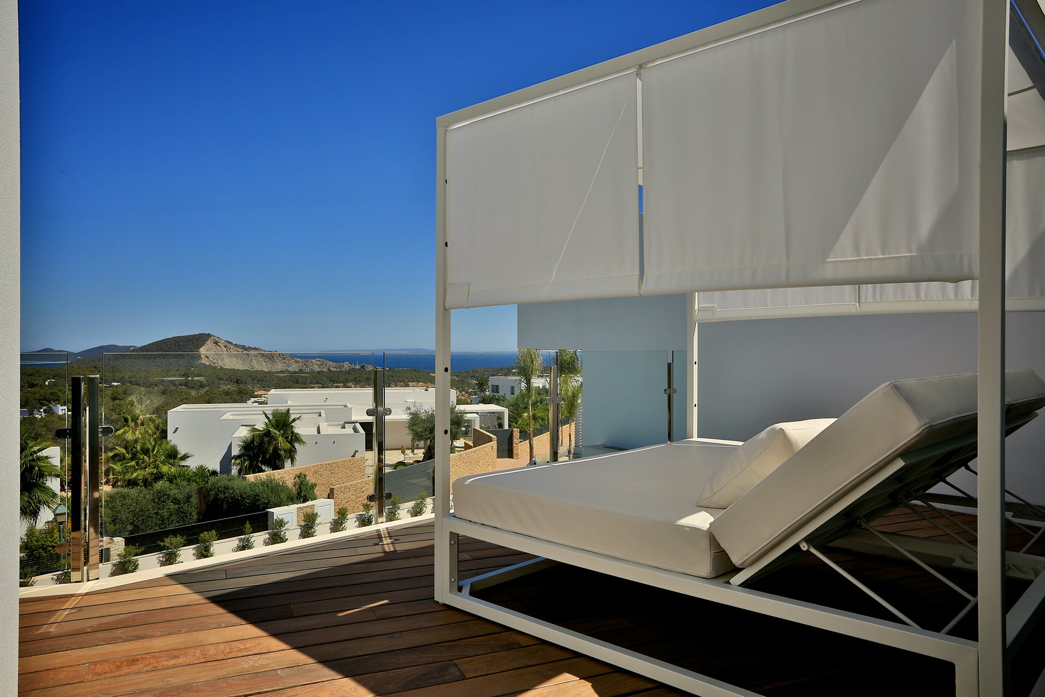 An elegant wooden terrace stretches the full width of the property, offering shaded lounging and dining spaces and sun-drenched spaces where you can take a sun lounger and enjoy the Ibizan sun or dip your toes in the stunning infinity pool.