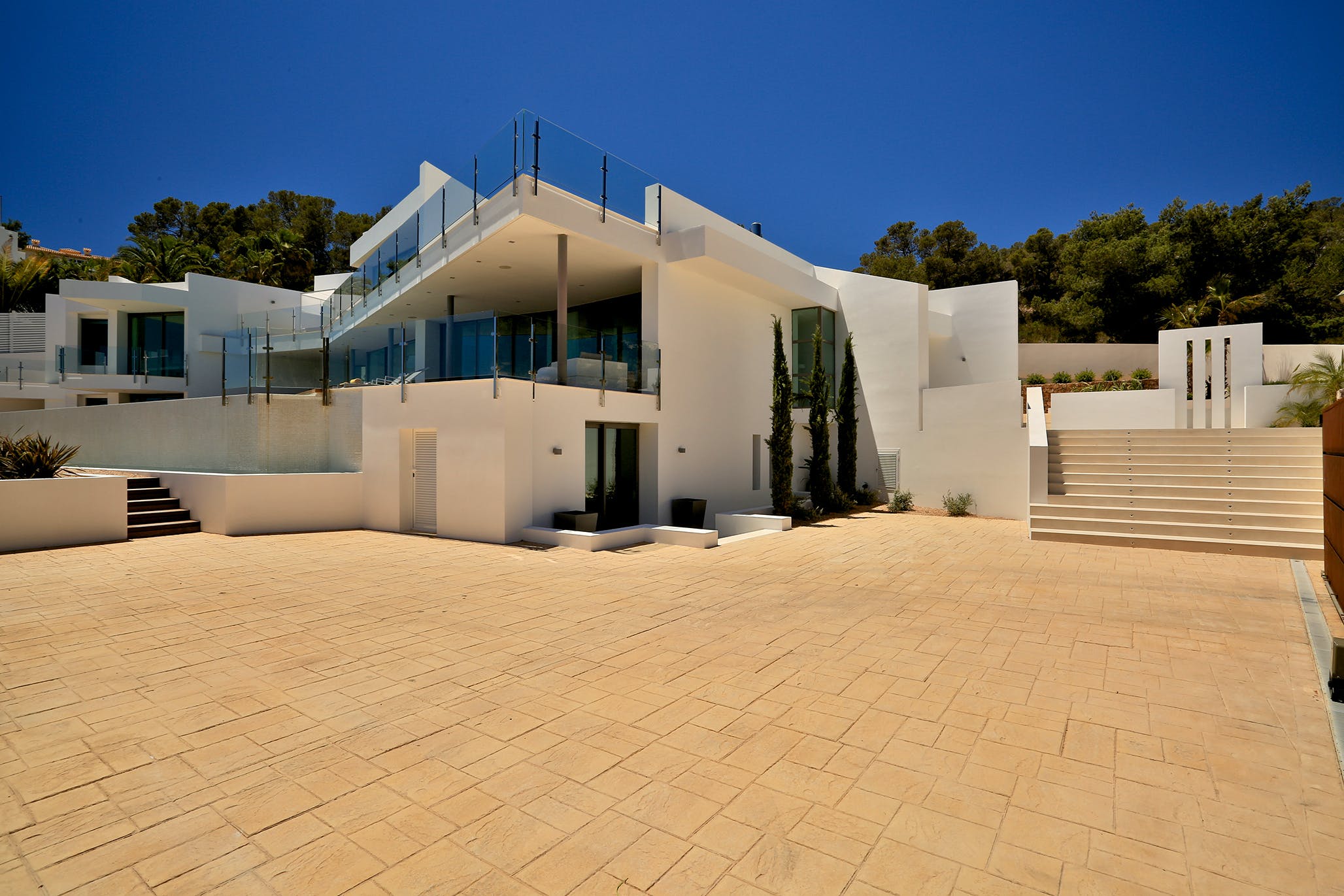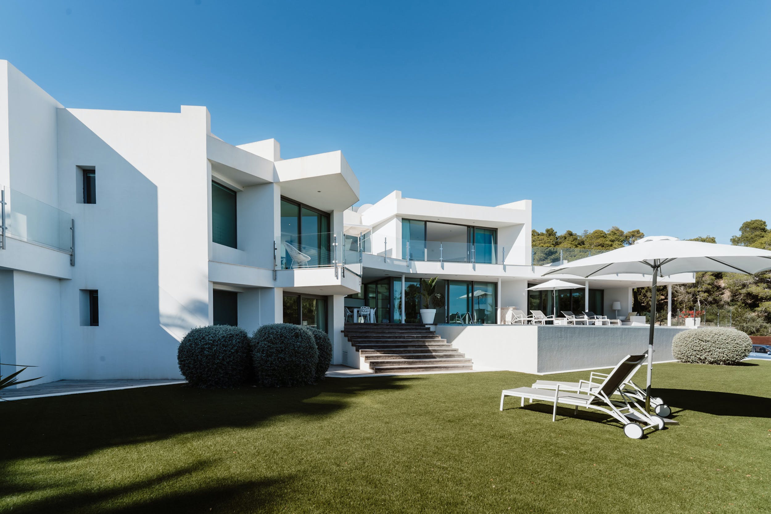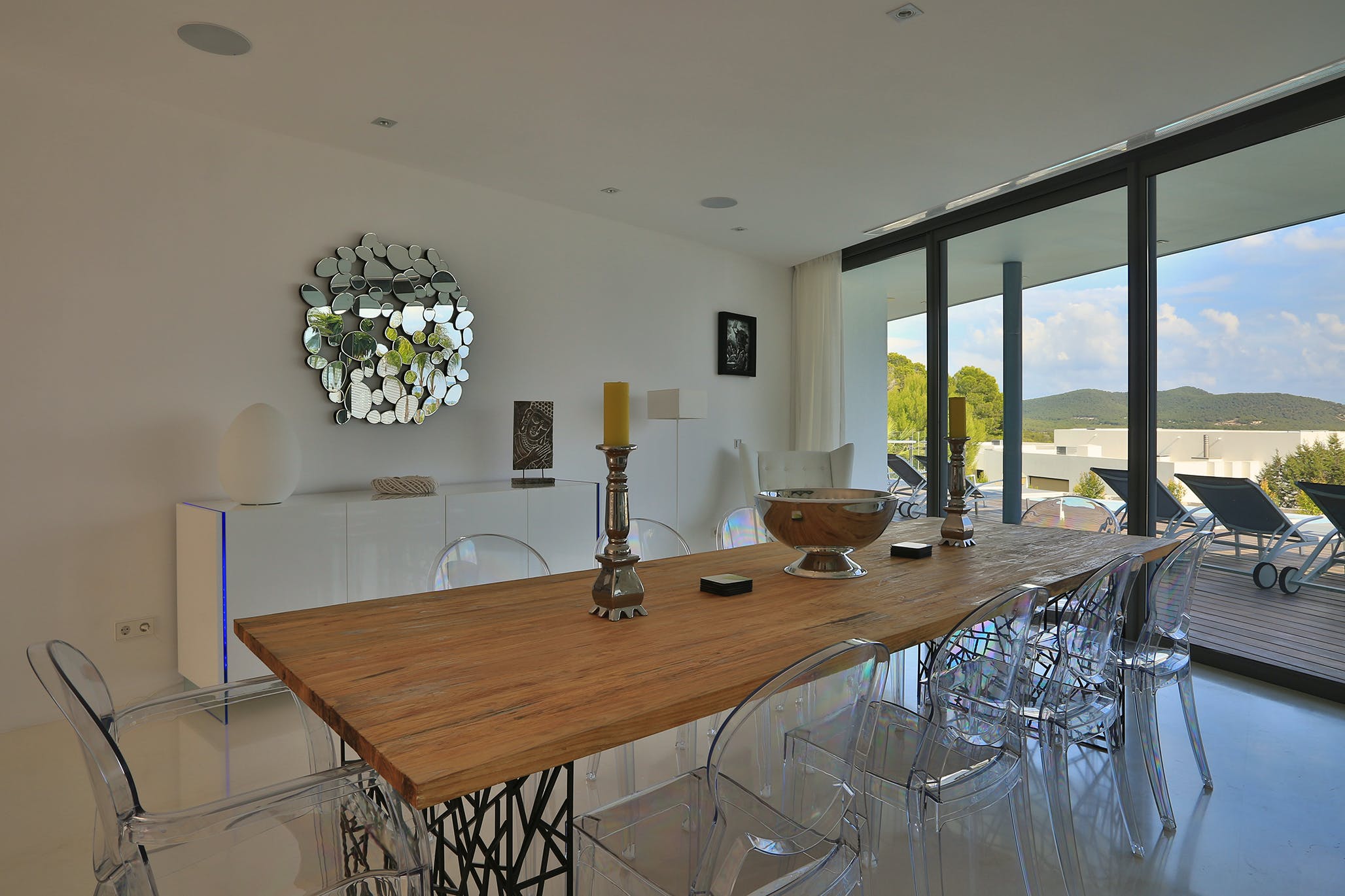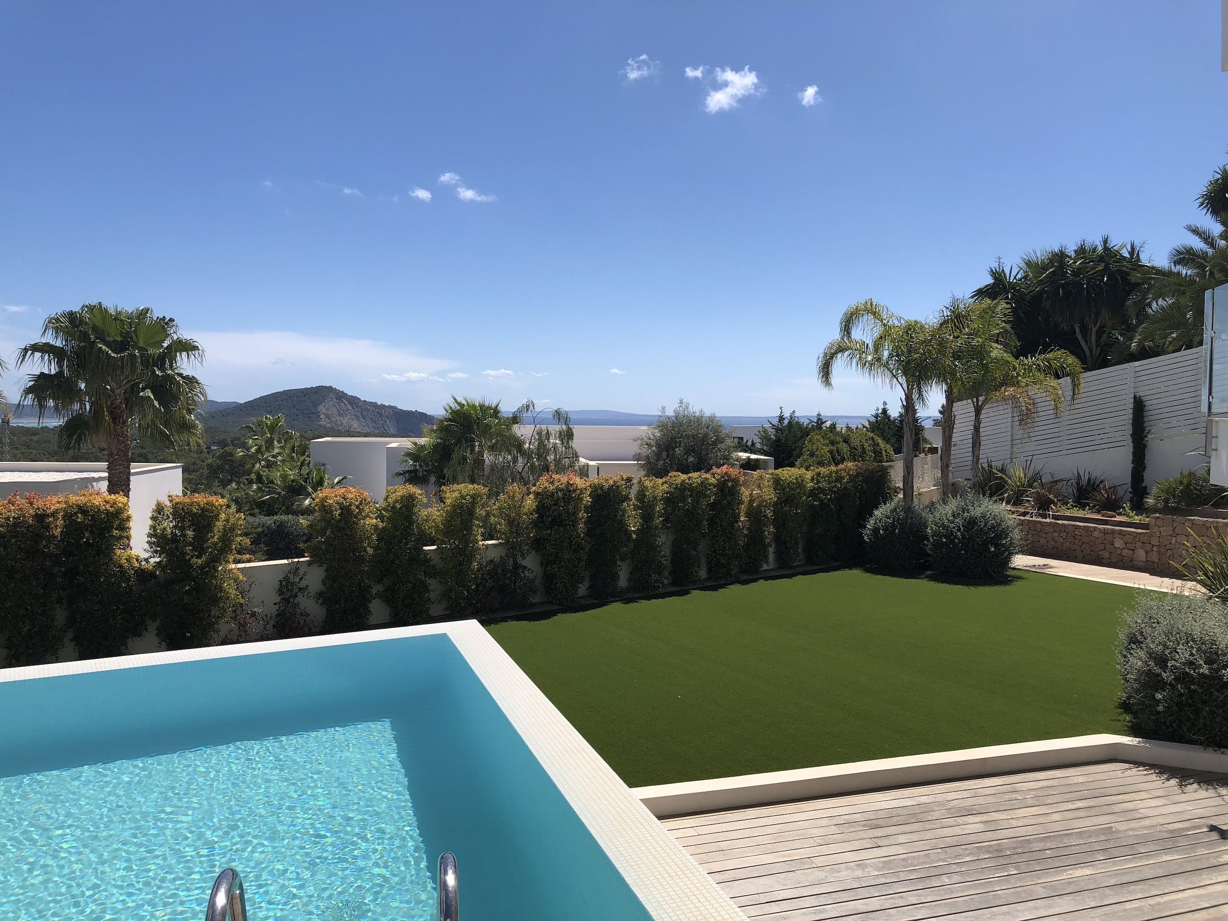 An elegant wooden terrace stretches the full width of the property, offering shaded lounging and dining spaces and sun-drenched spaces where you can take a sun lounger and enjoy the Ibizan sun or dip your toes in the stunning infinity pool.