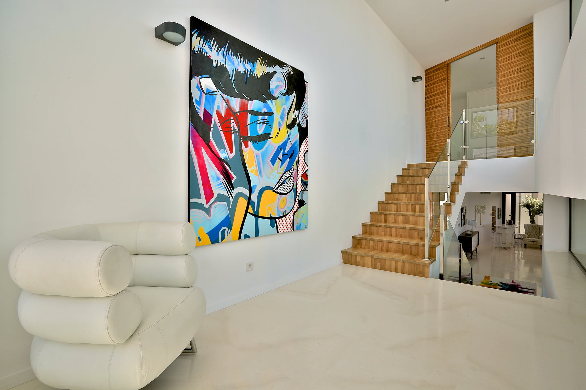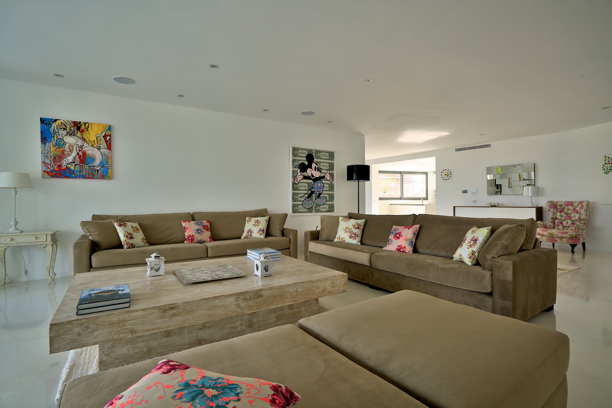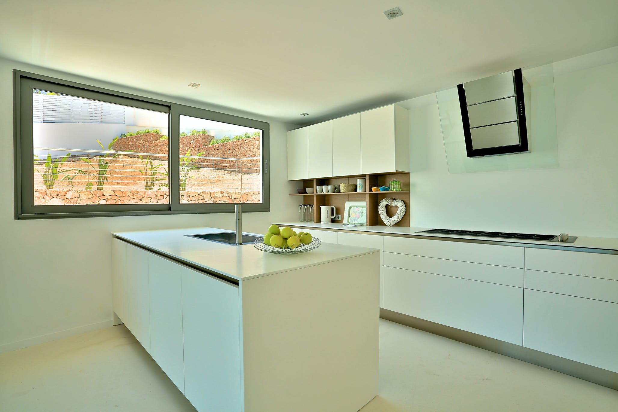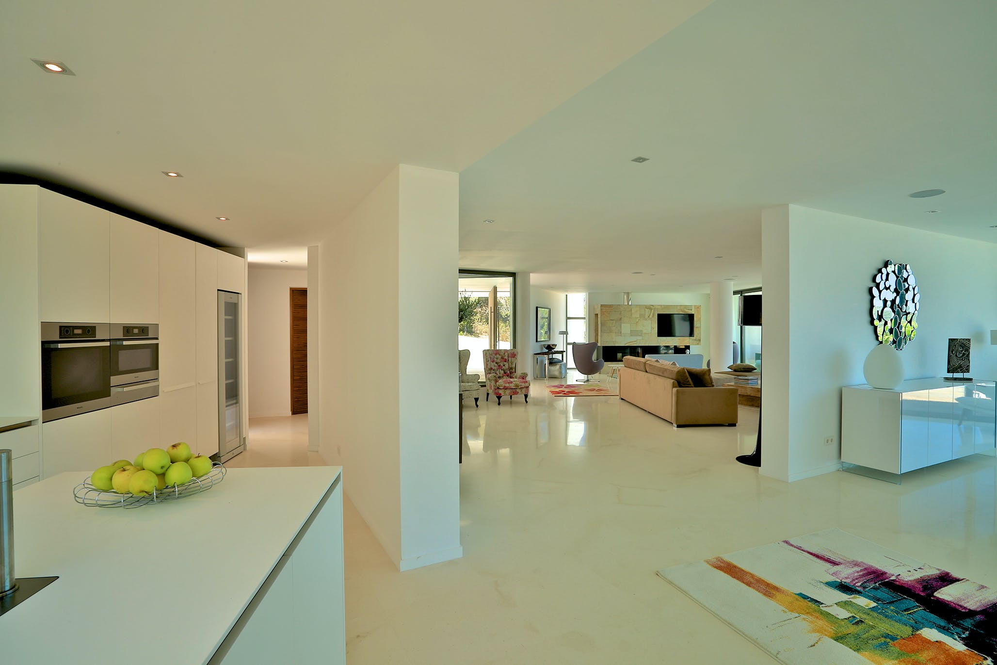Polished white stone floors extend throughout the interior, where the large bright kitchen offers a sociable indoor dining area, with table for ten, and opens directly onto the deck.