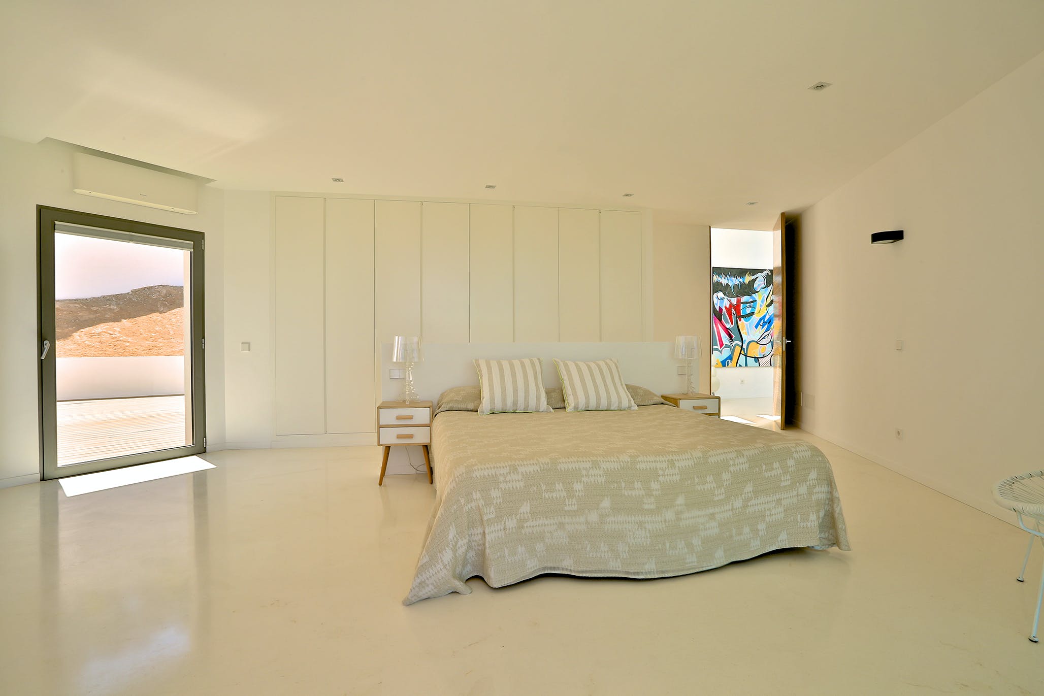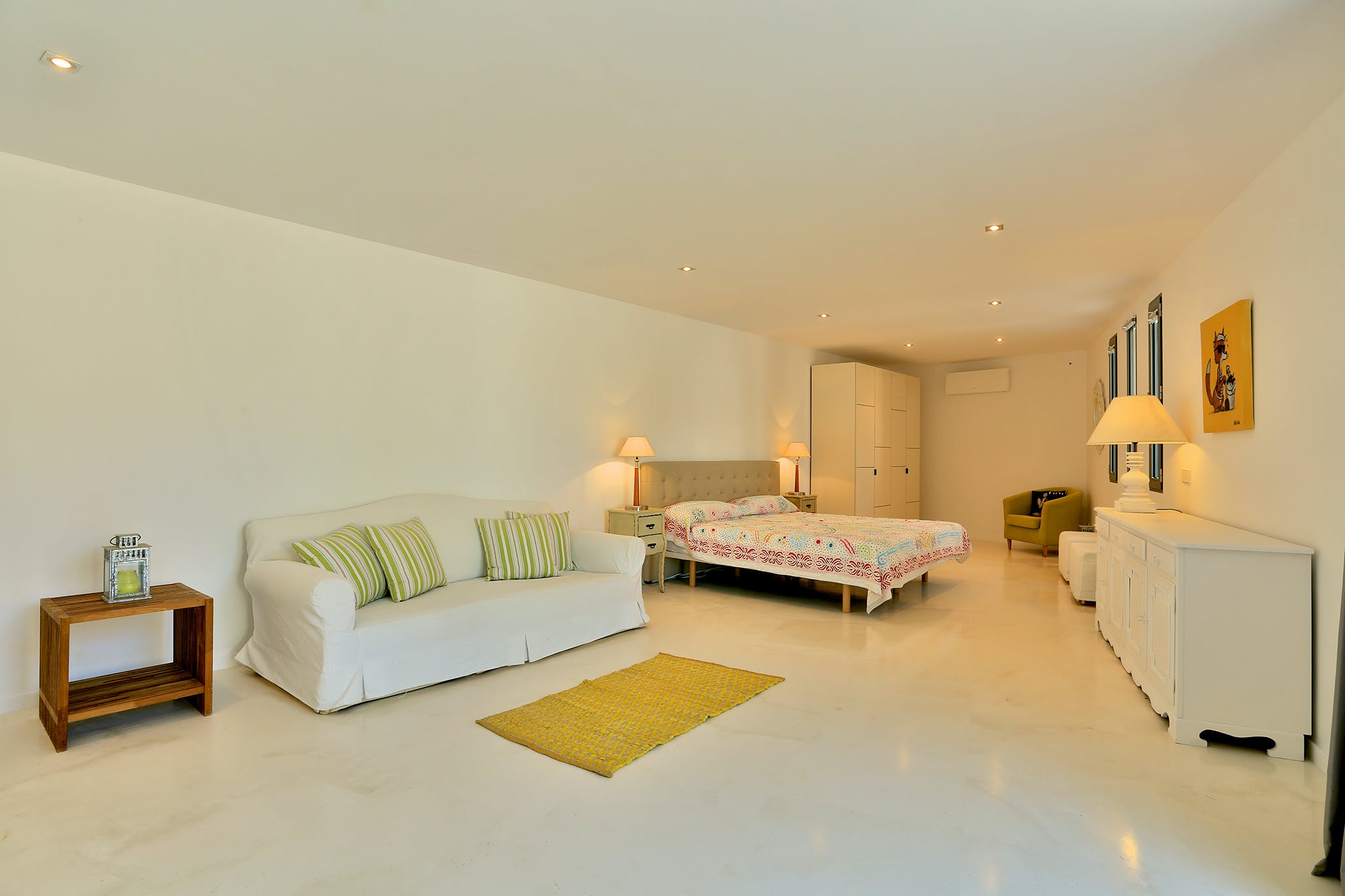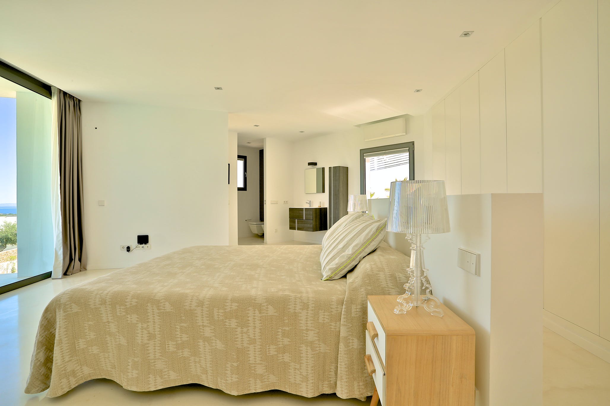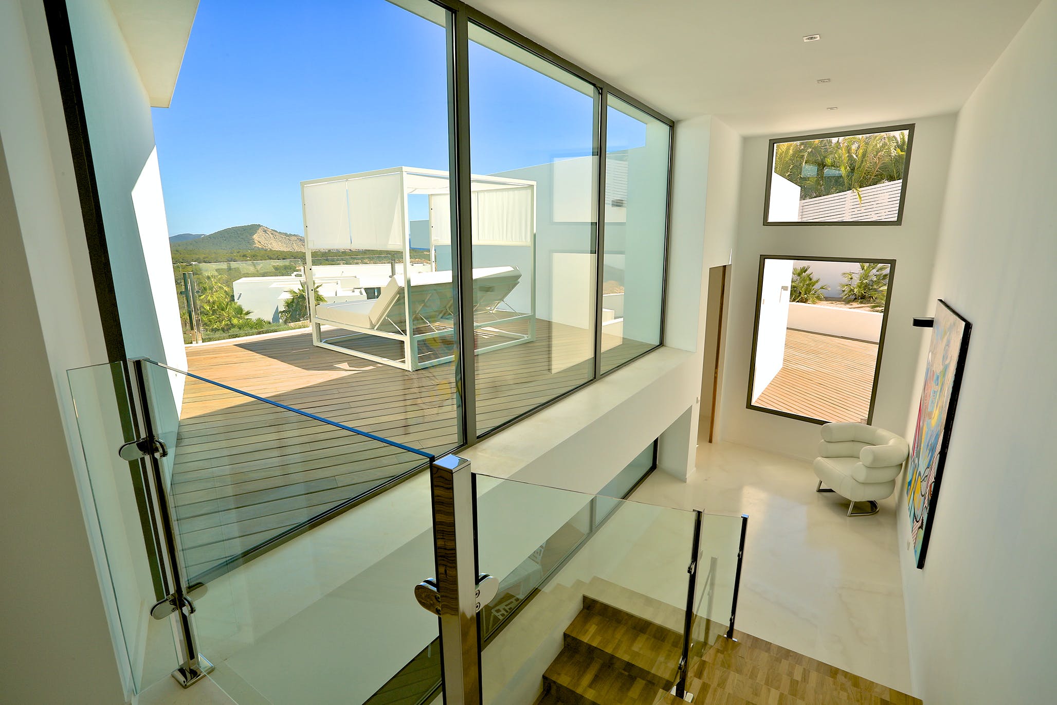 Upstairs, two of the generously sized double bedrooms offer further incredible sea views. The master suite occupies the entire top floor of the house. From its private terrace, you can enjoy wonderful views of Formentera or simply relax on the large sofa bed.