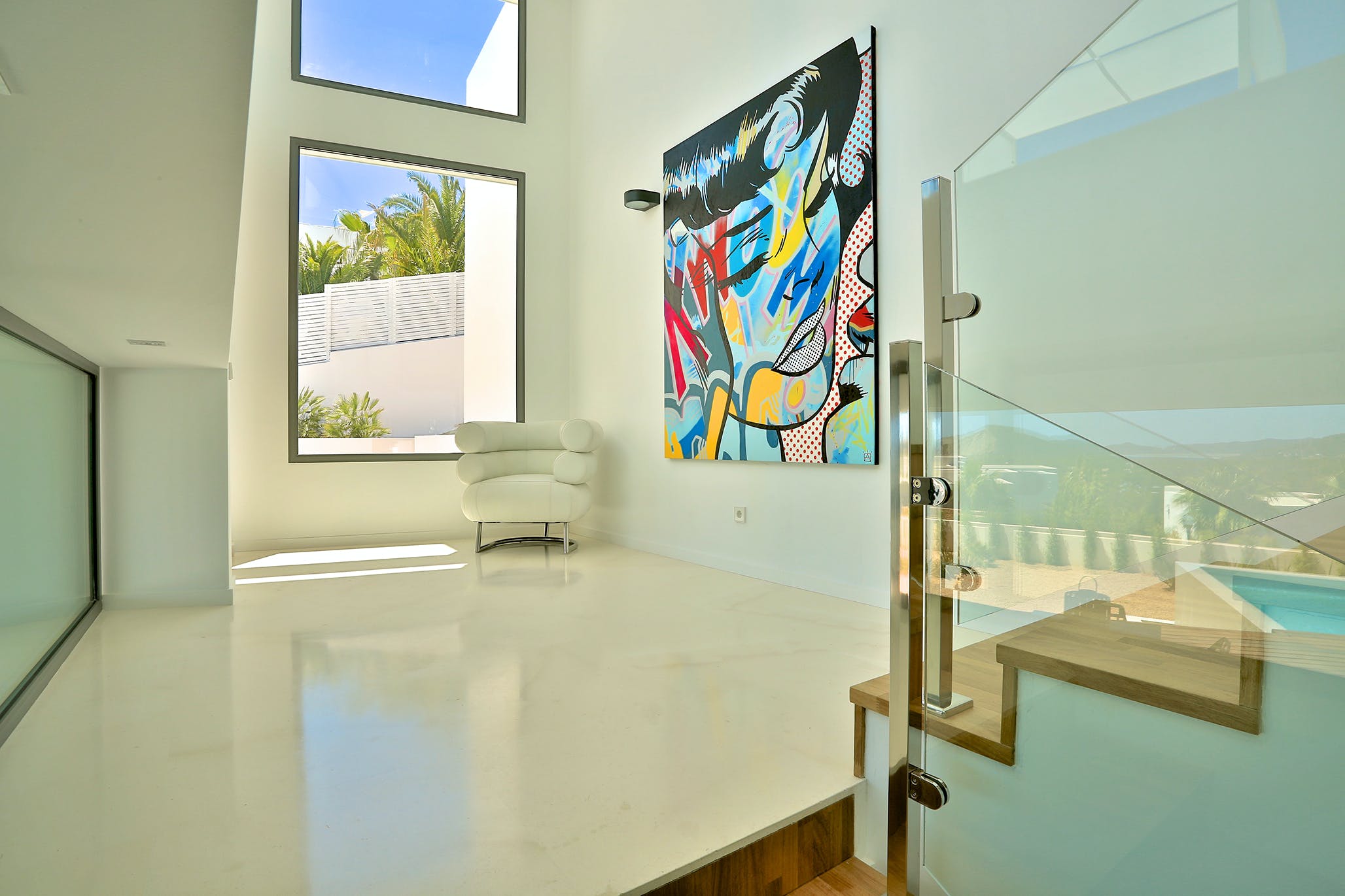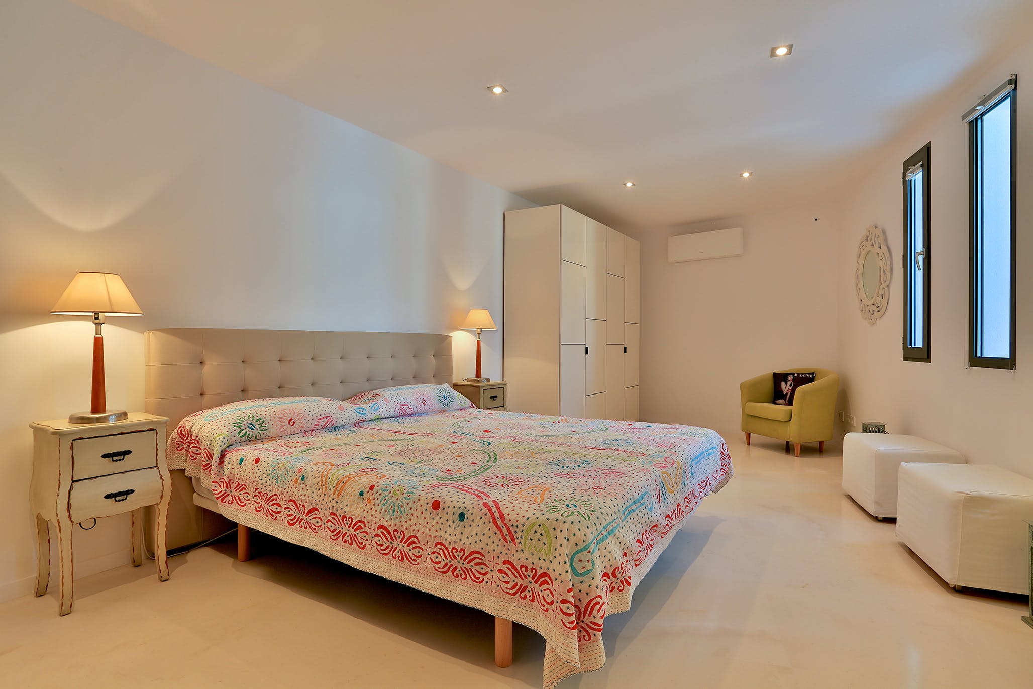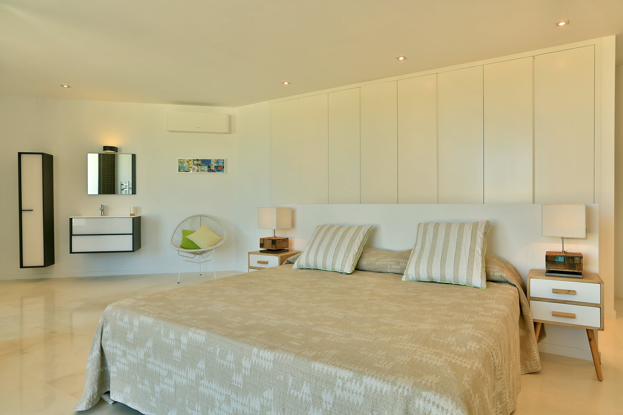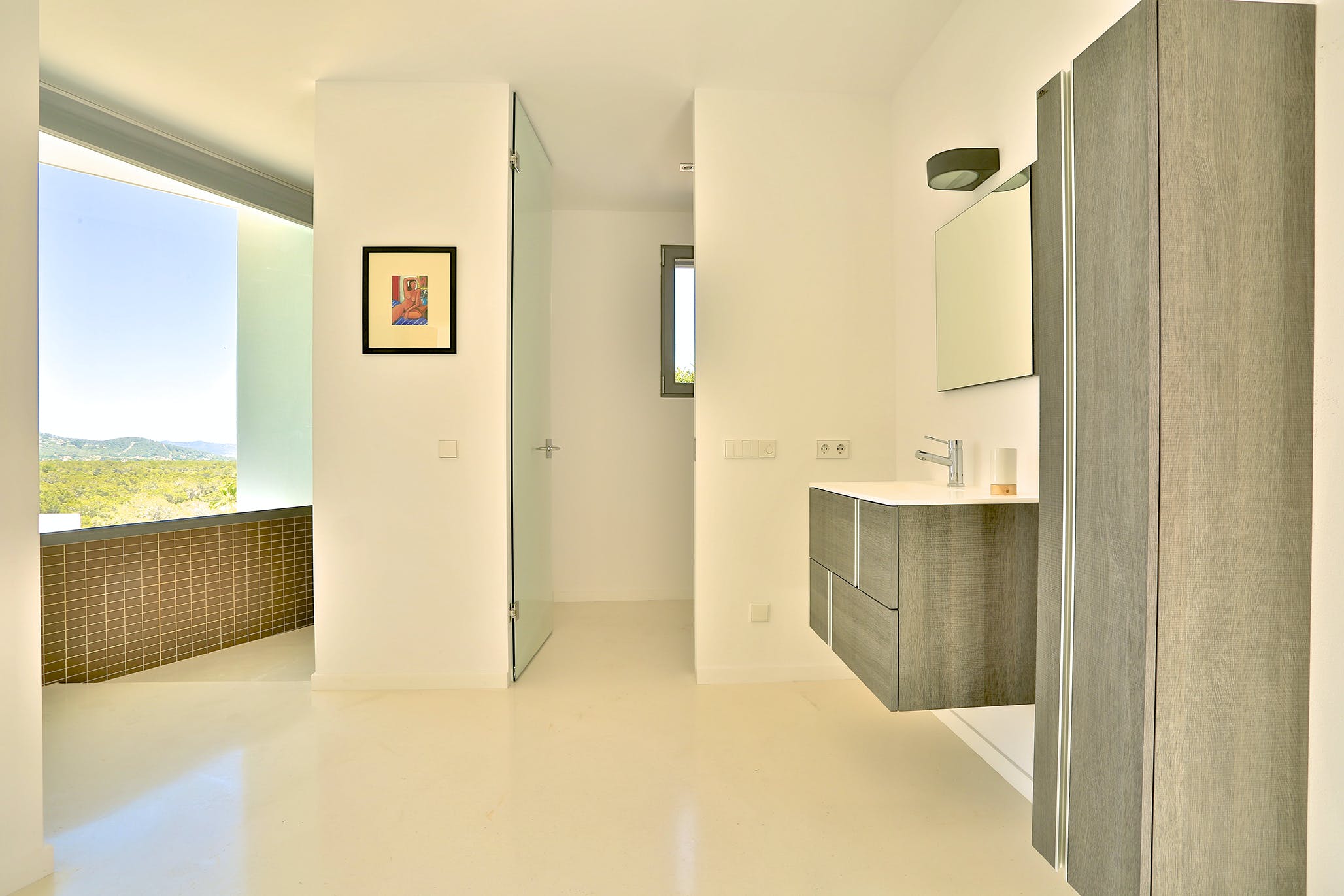 Upstairs, two of the generously sized double bedrooms offer further incredible sea views. The master suite occupies the entire top floor of the house. From its private terrace, you can enjoy wonderful views of Formentera or simply relax on the large sofa bed.