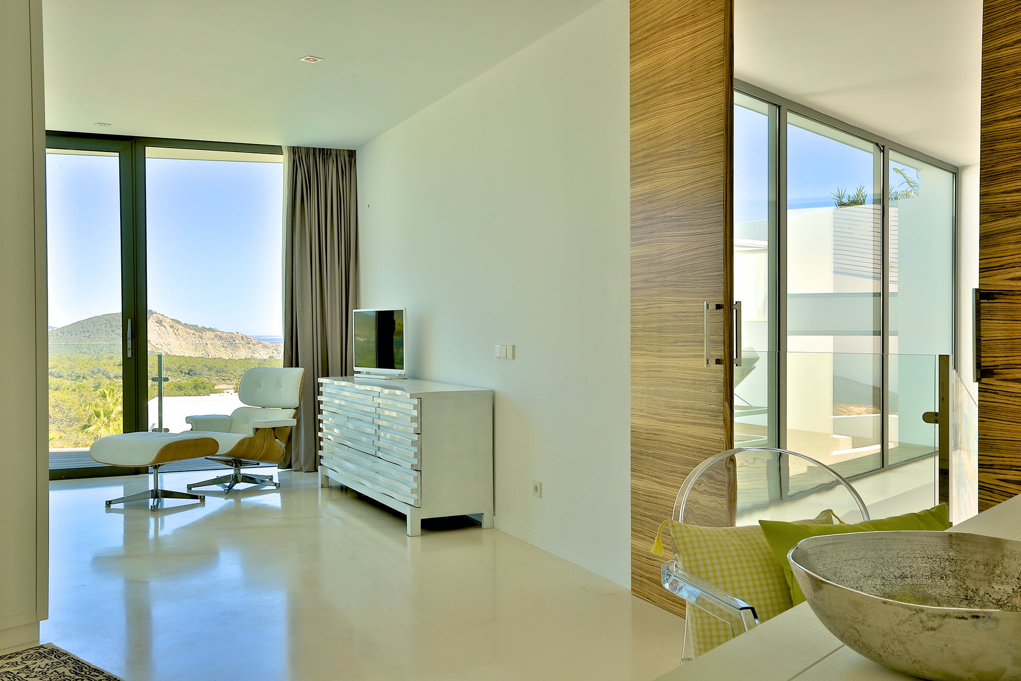 Surrounding the huge glazed façade, living areas include sofas and a cozy nook with Bali limestone fireplace and black granite. All share the resplendent sea views and open onto the terrace.