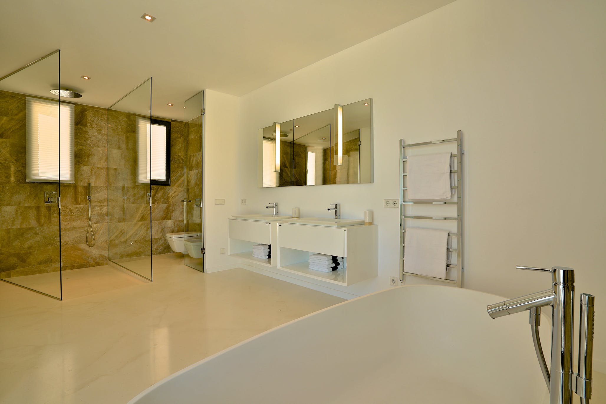 Five spacious double bedrooms, each with an immaculate en-suite bathroom, offer stylish guest accommodation. One of them has direct access to the ground floor terrace.