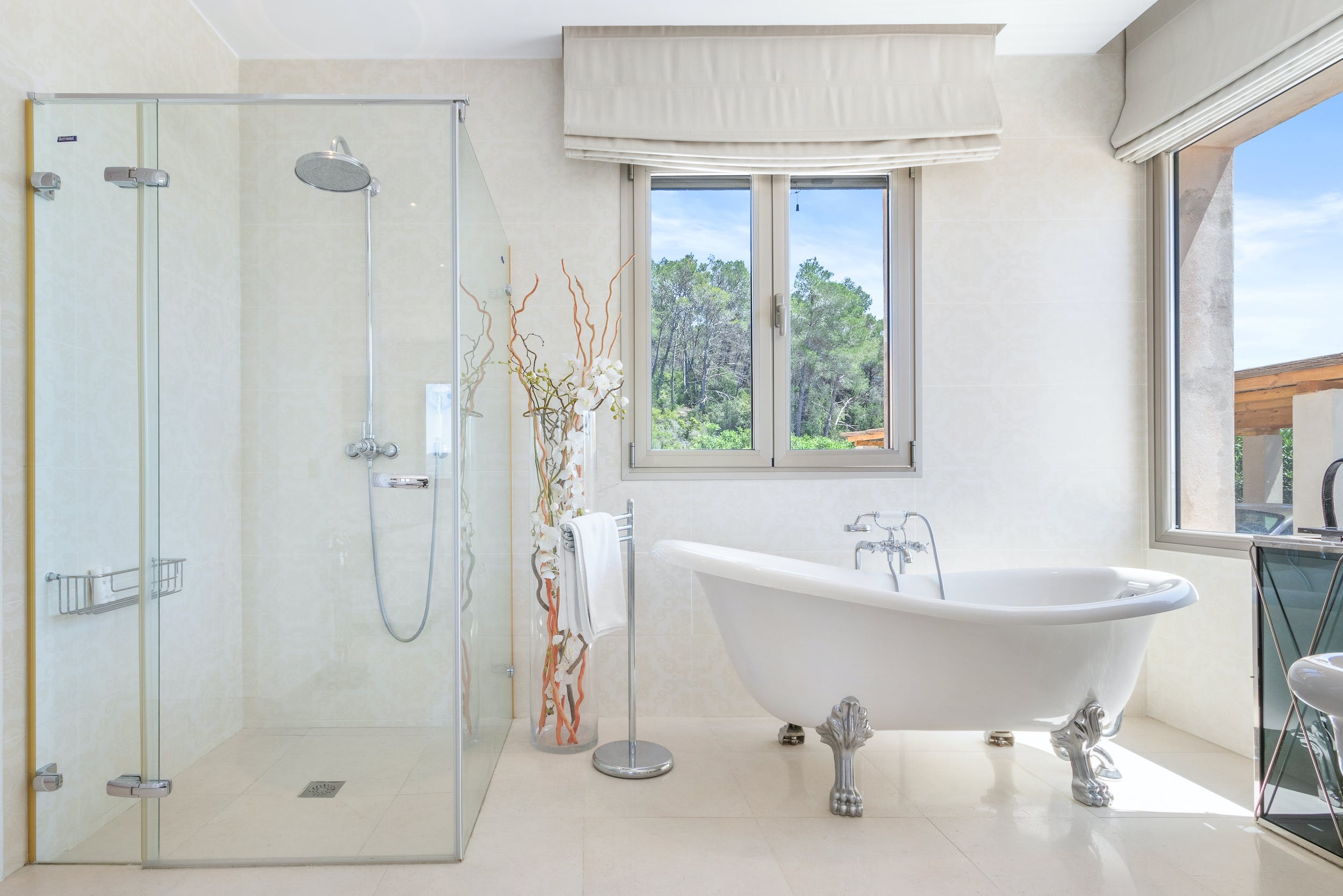 Lower Ground Floor – Super king size bed, air conditioning, dressing area, terrace access, TV. En-suite bathroom with separate shower and jacuzzi bath.