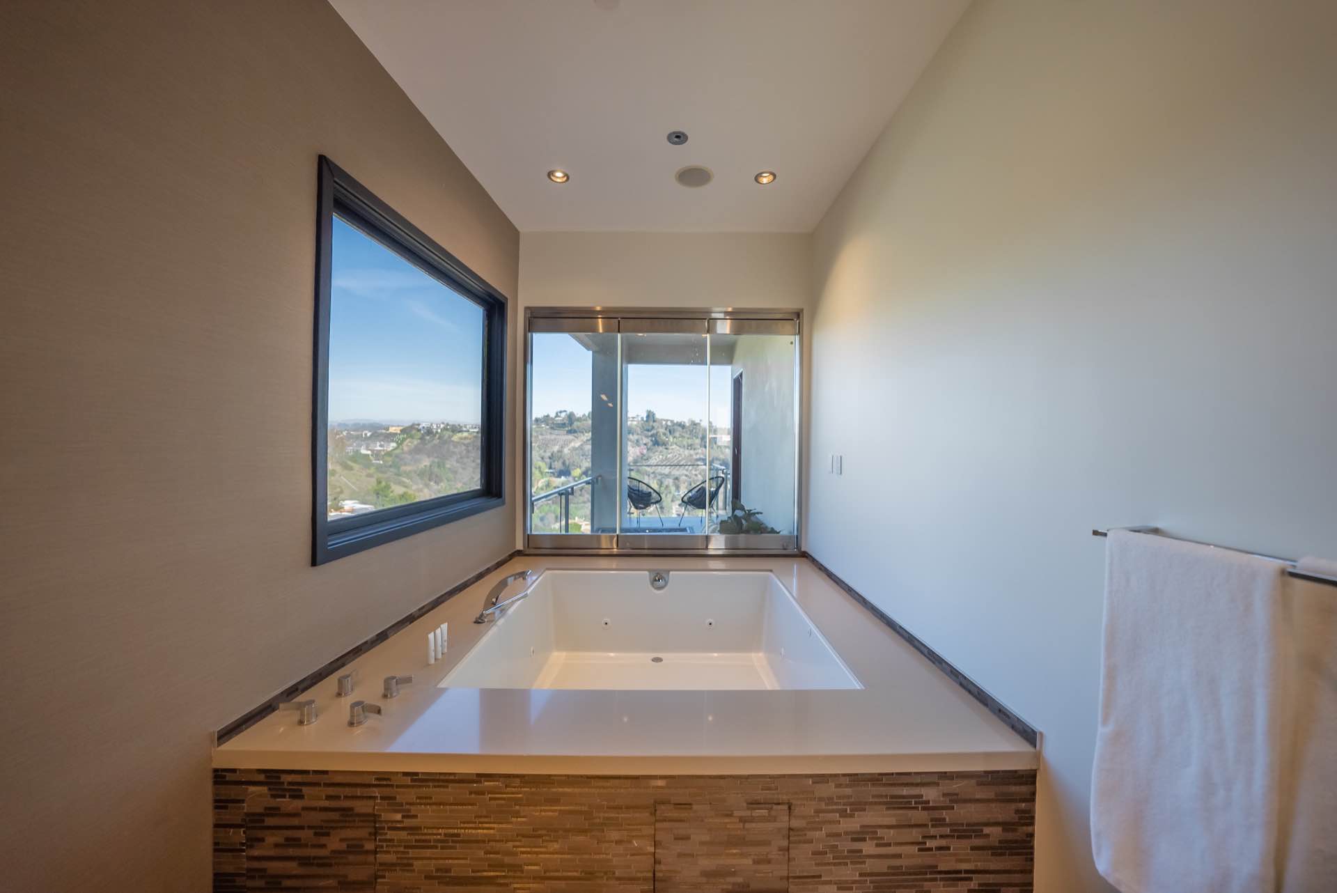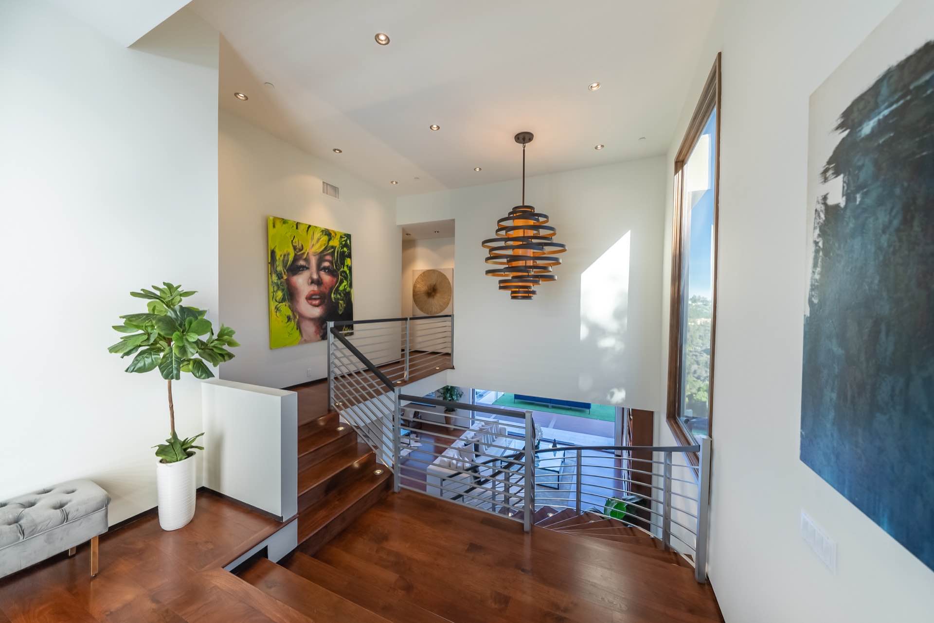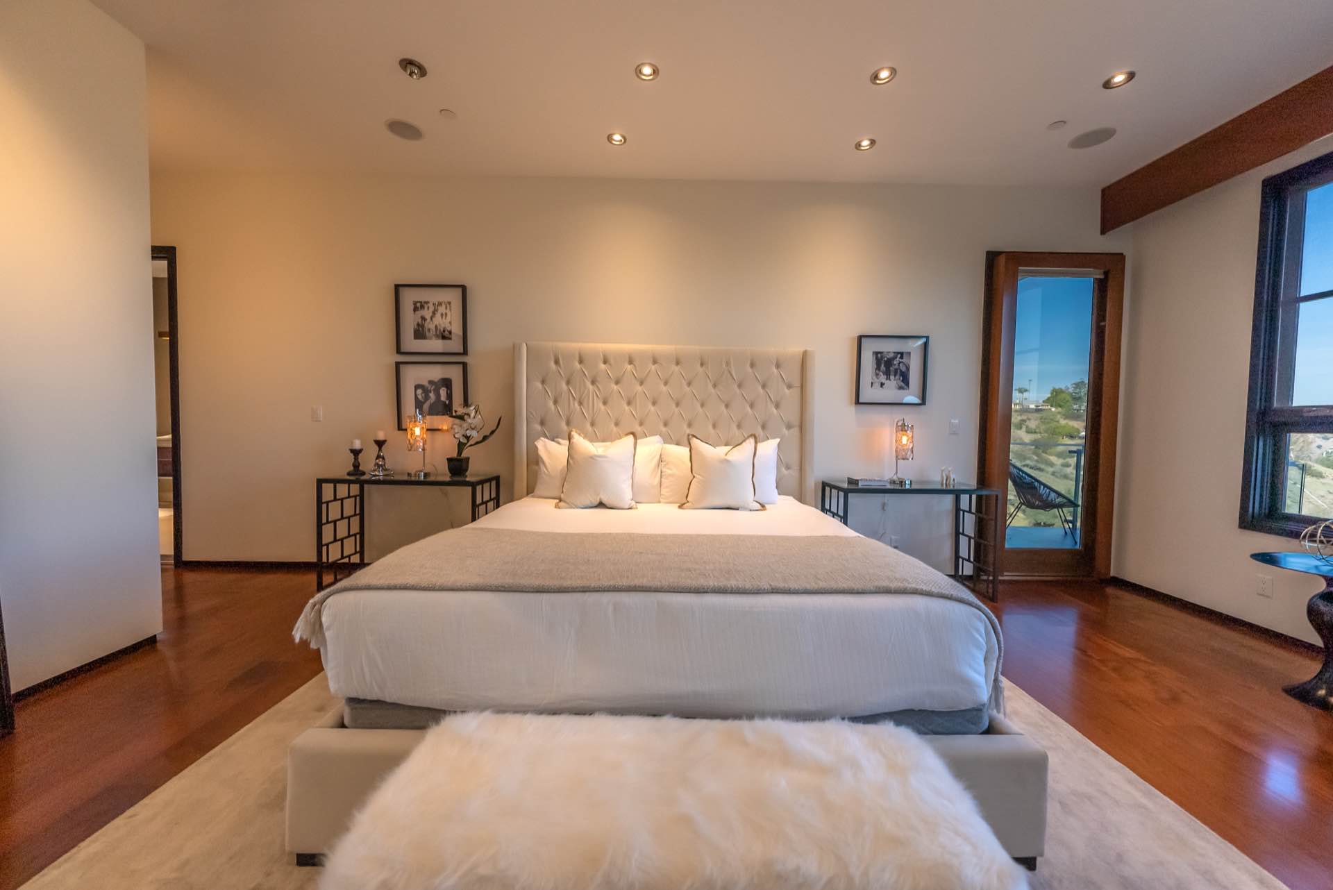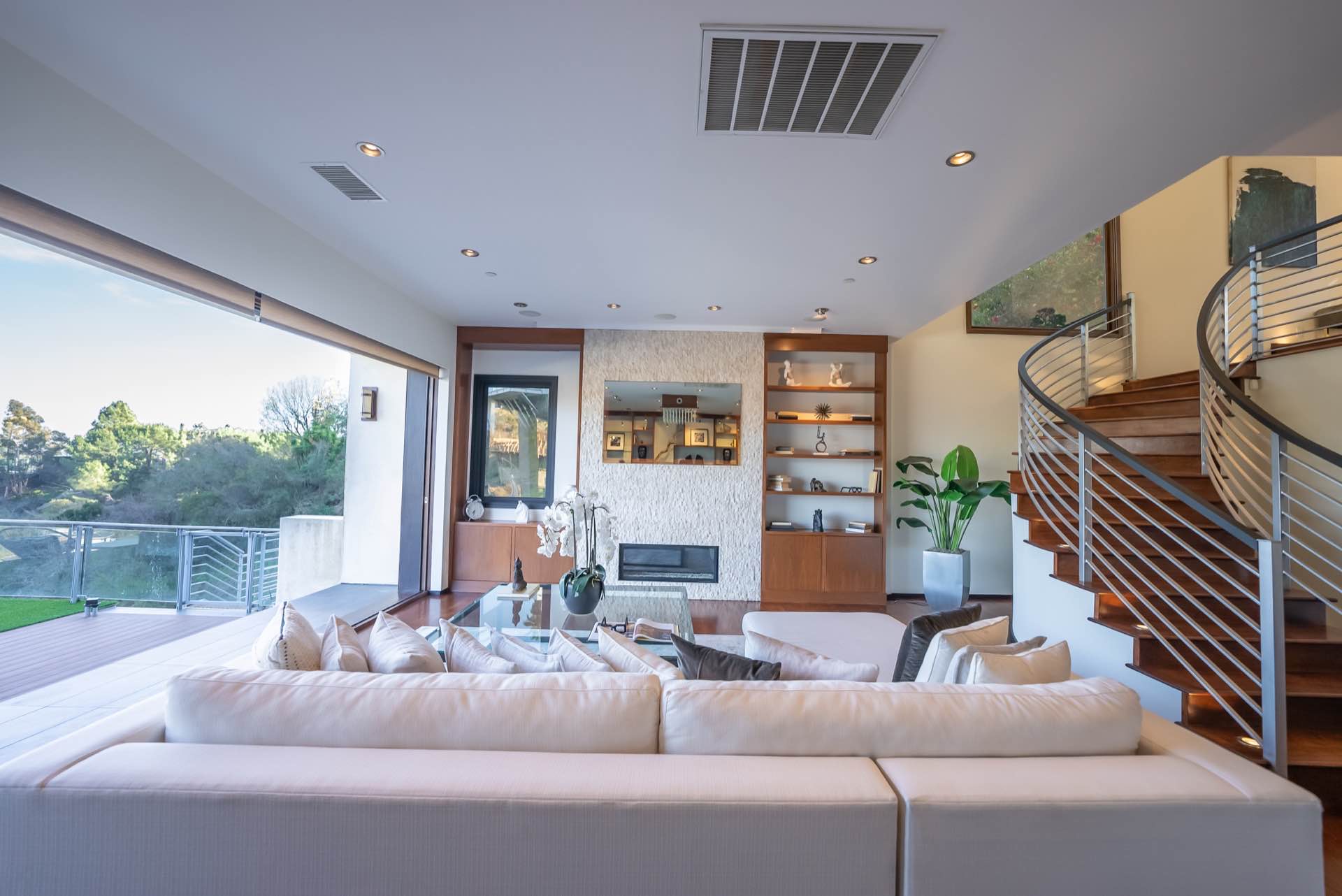 The sweeping staircase leads to a five star master with a massive walk-in closet, spa-like master bath, and a private outdoor lounge with fire-pit. Three other en-suite bedrooms are also upstairs.