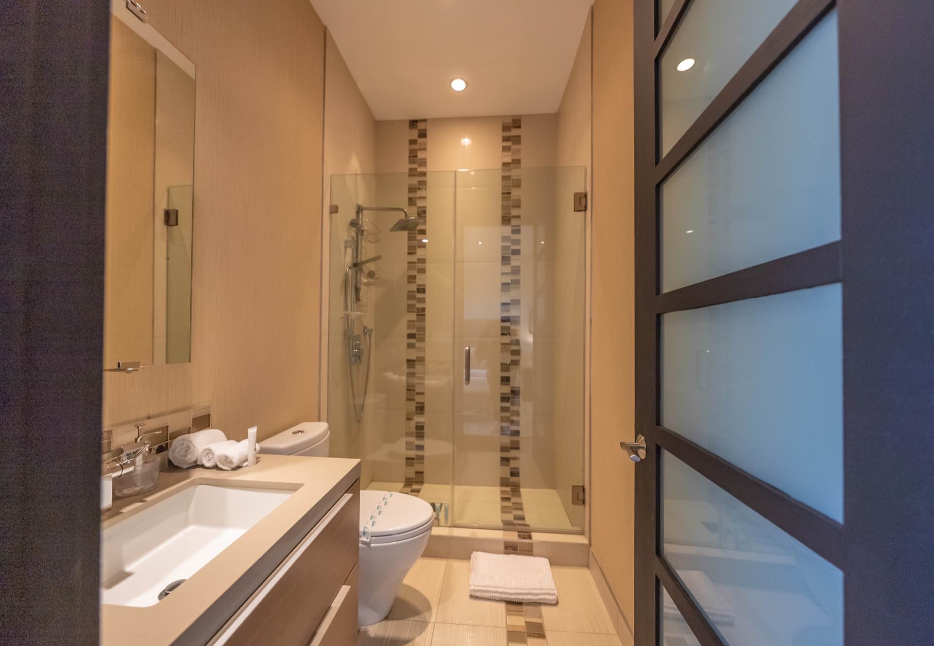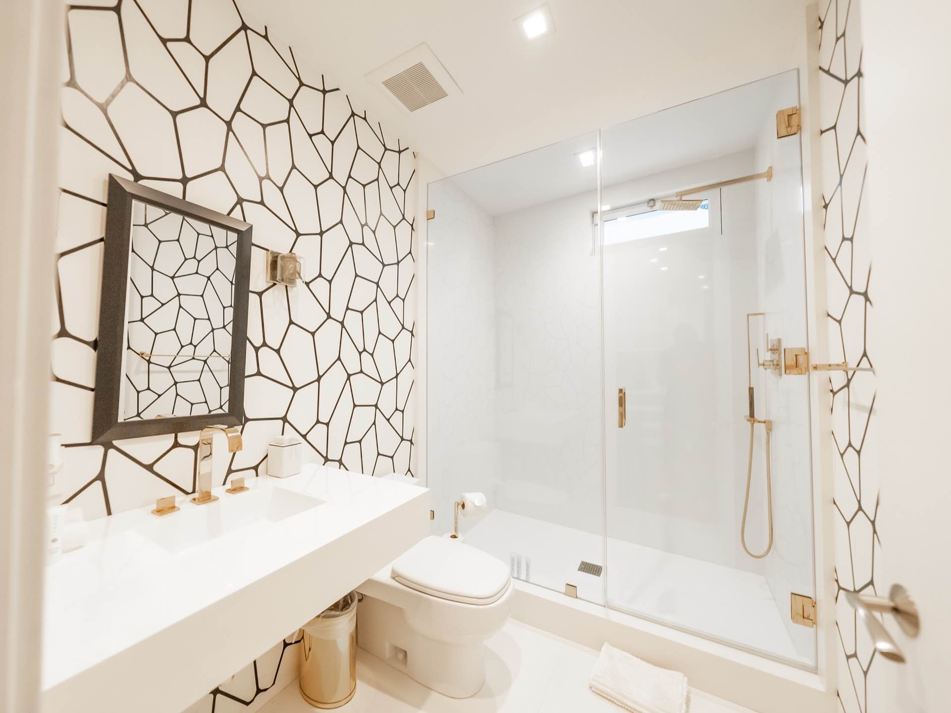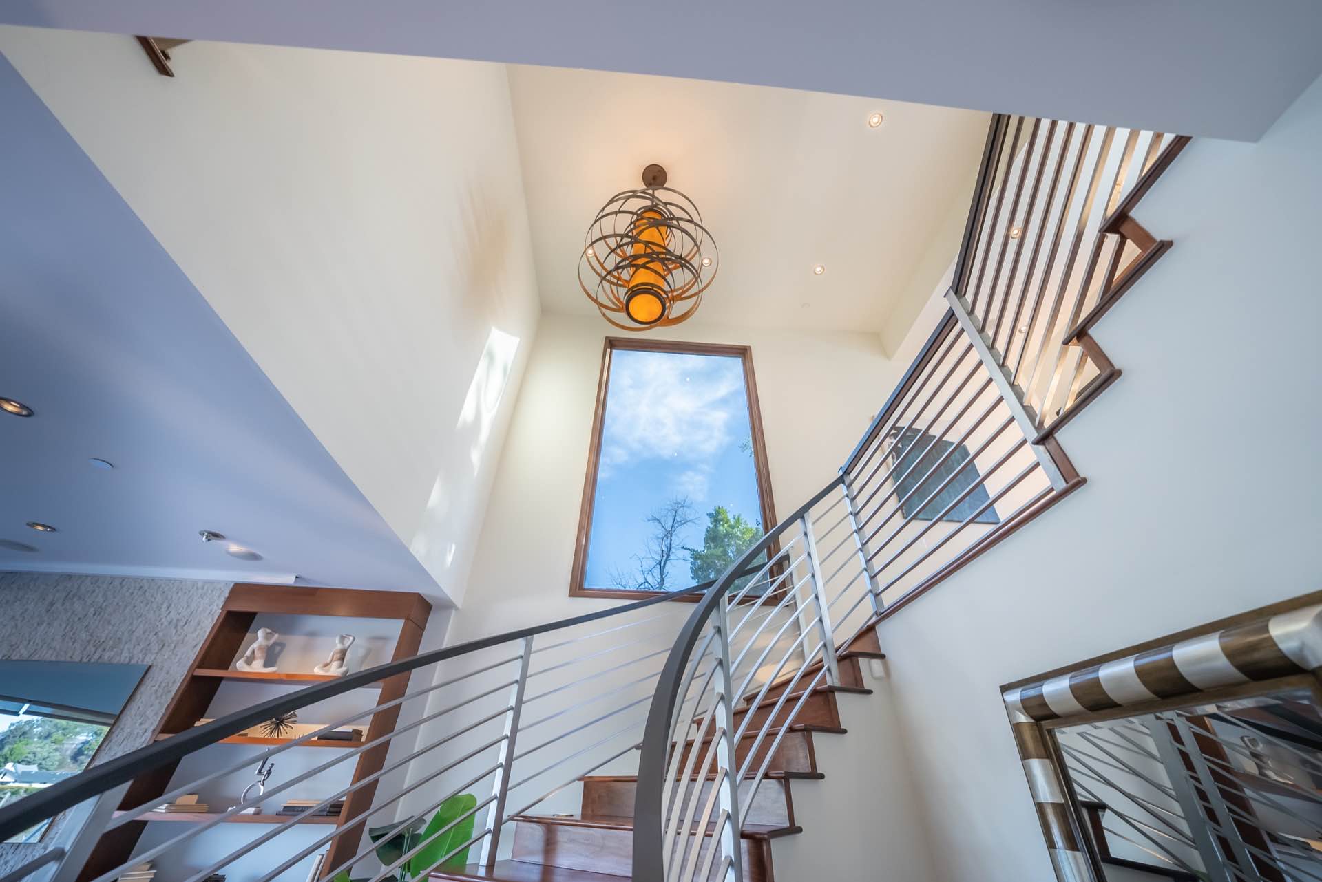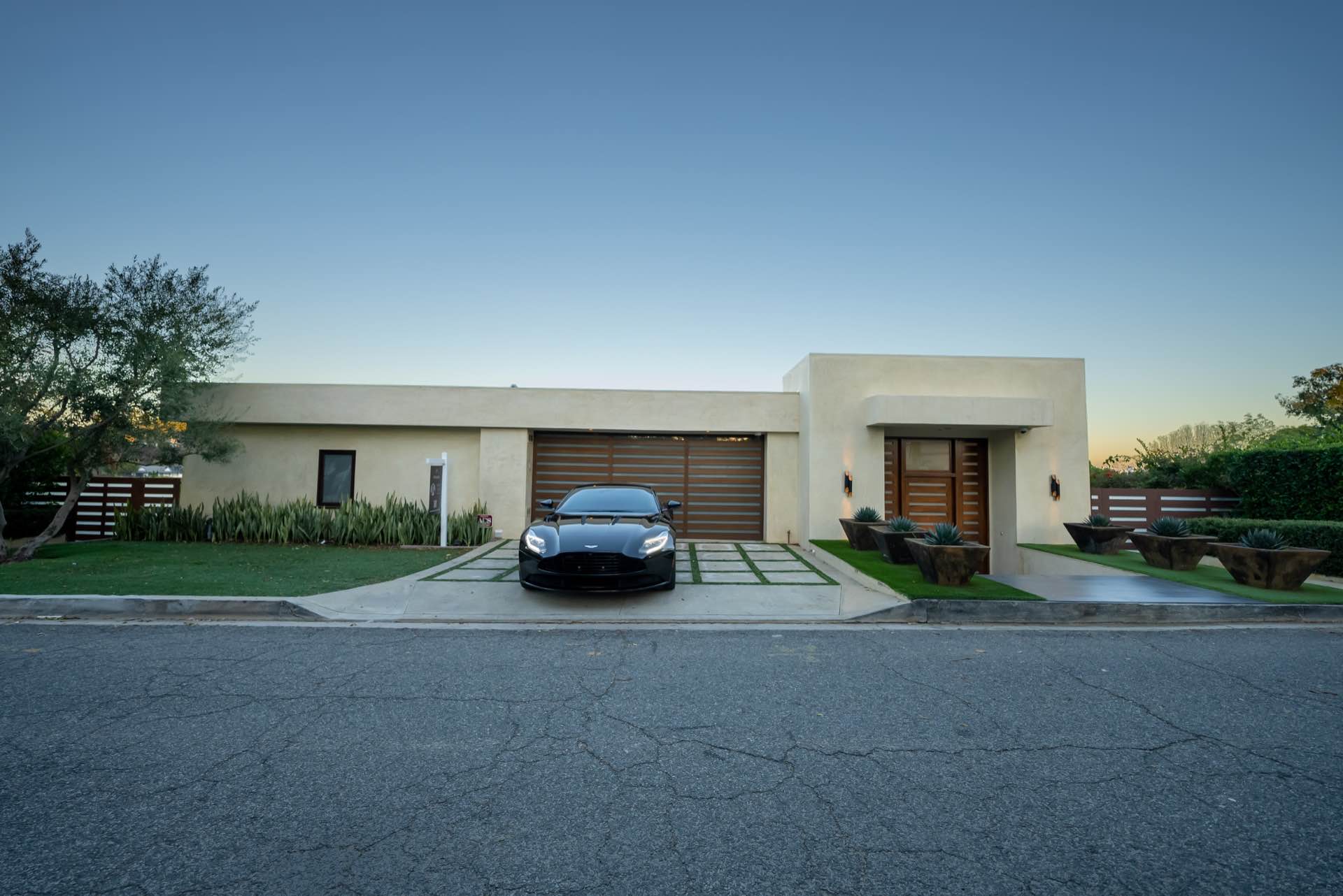 The sweeping staircase leads to a five star master with a massive walk-in closet, spa-like master bath, and a private outdoor lounge with fire-pit. Three other en-suite bedrooms are also upstairs.
