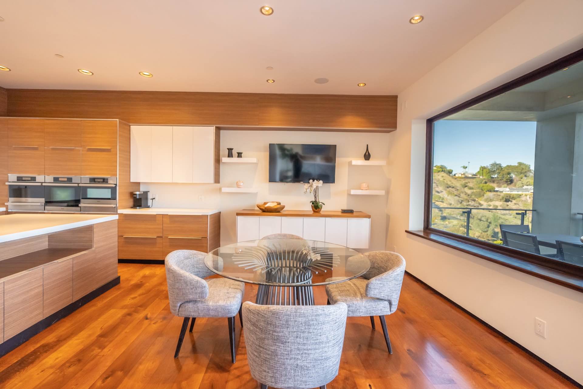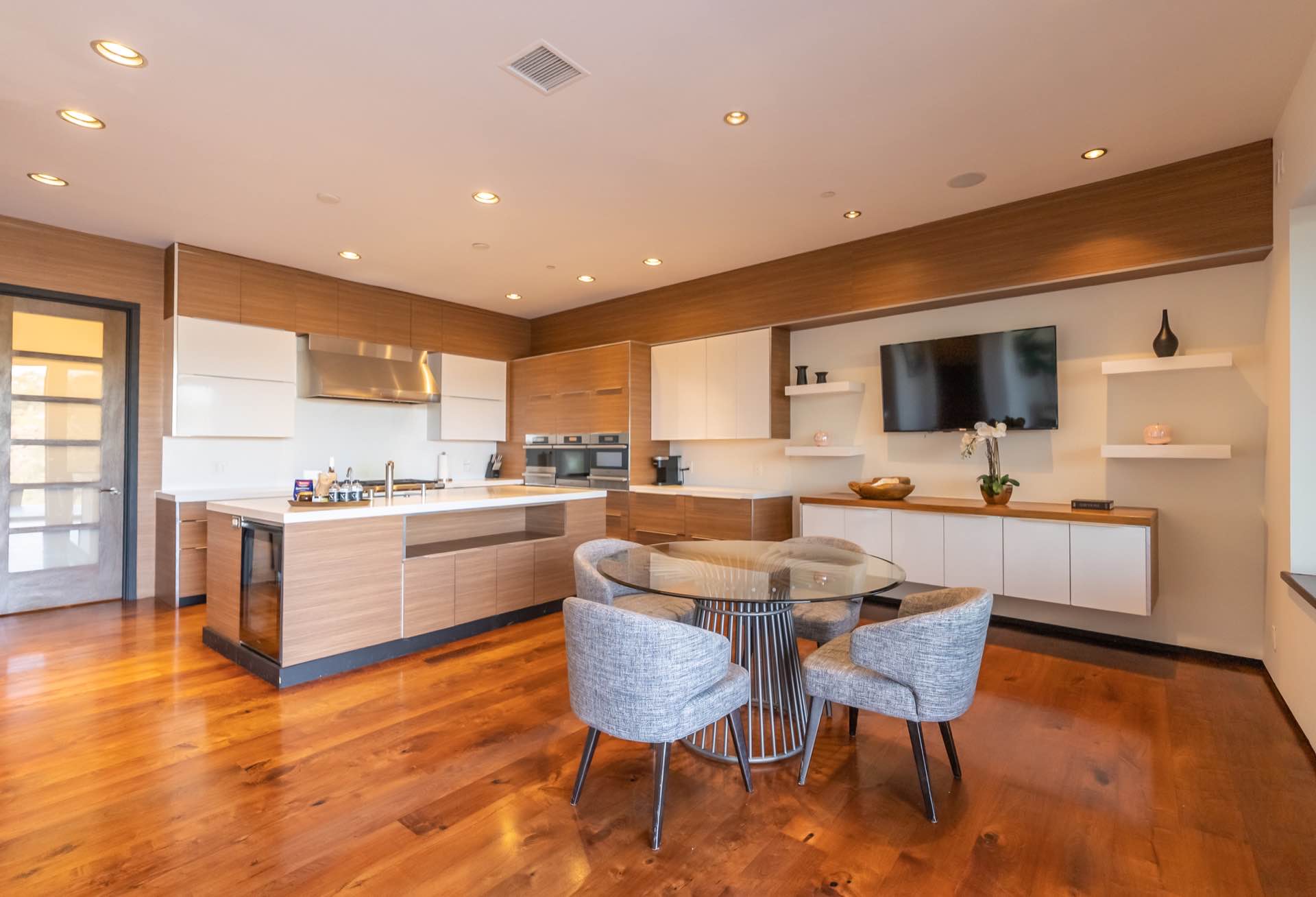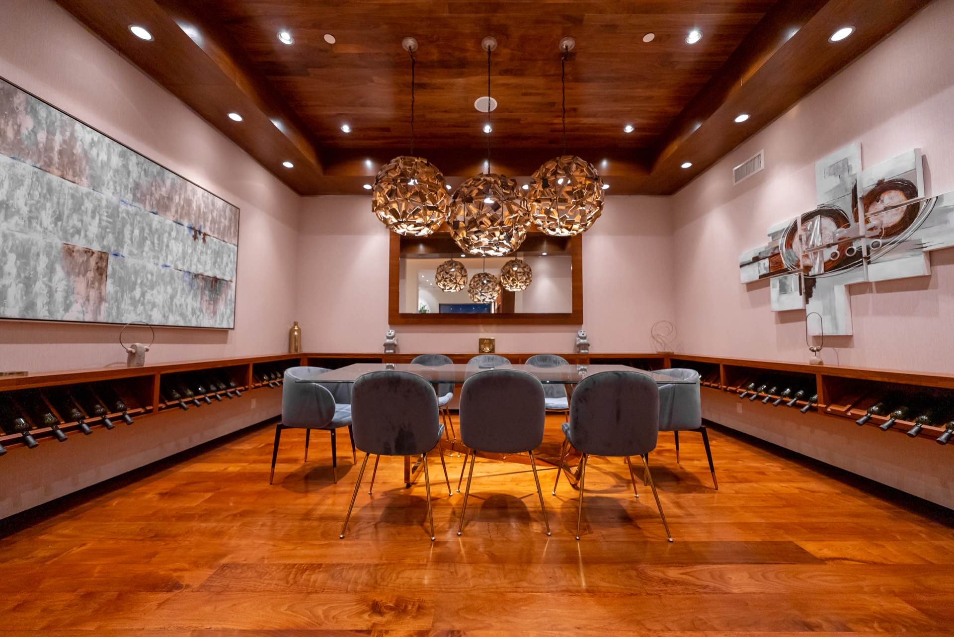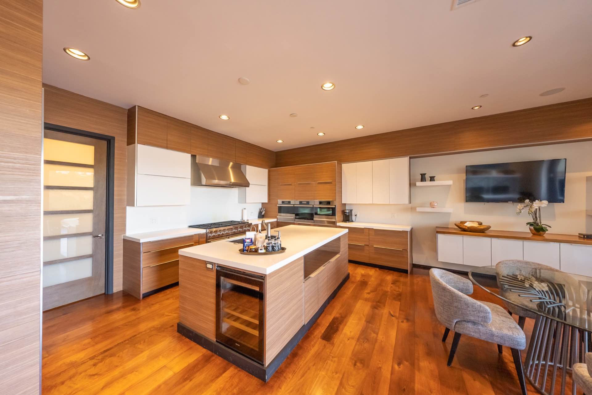 The massive living room with art gallery converts into a home theater upon command. The dining room features wraparound wine racks. The eat-in chef’s Kitchen features Miele and Wolfe appliances, Ceasar-stone counters, huge walk-in pantry, and a TV lounging area with breakfast nook.
