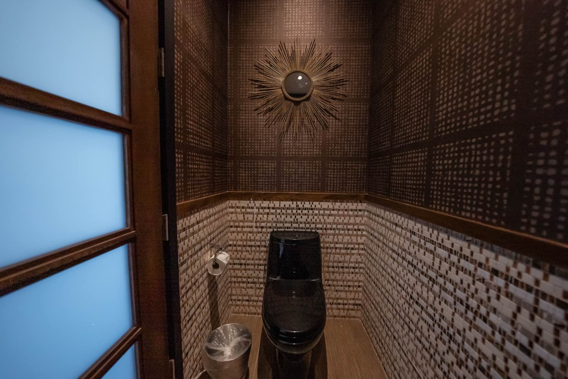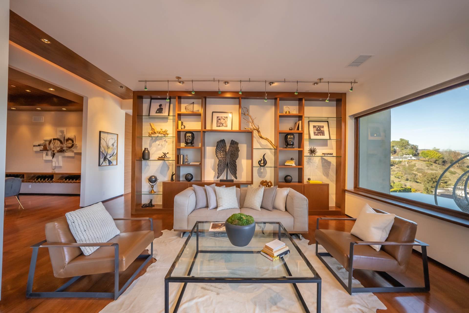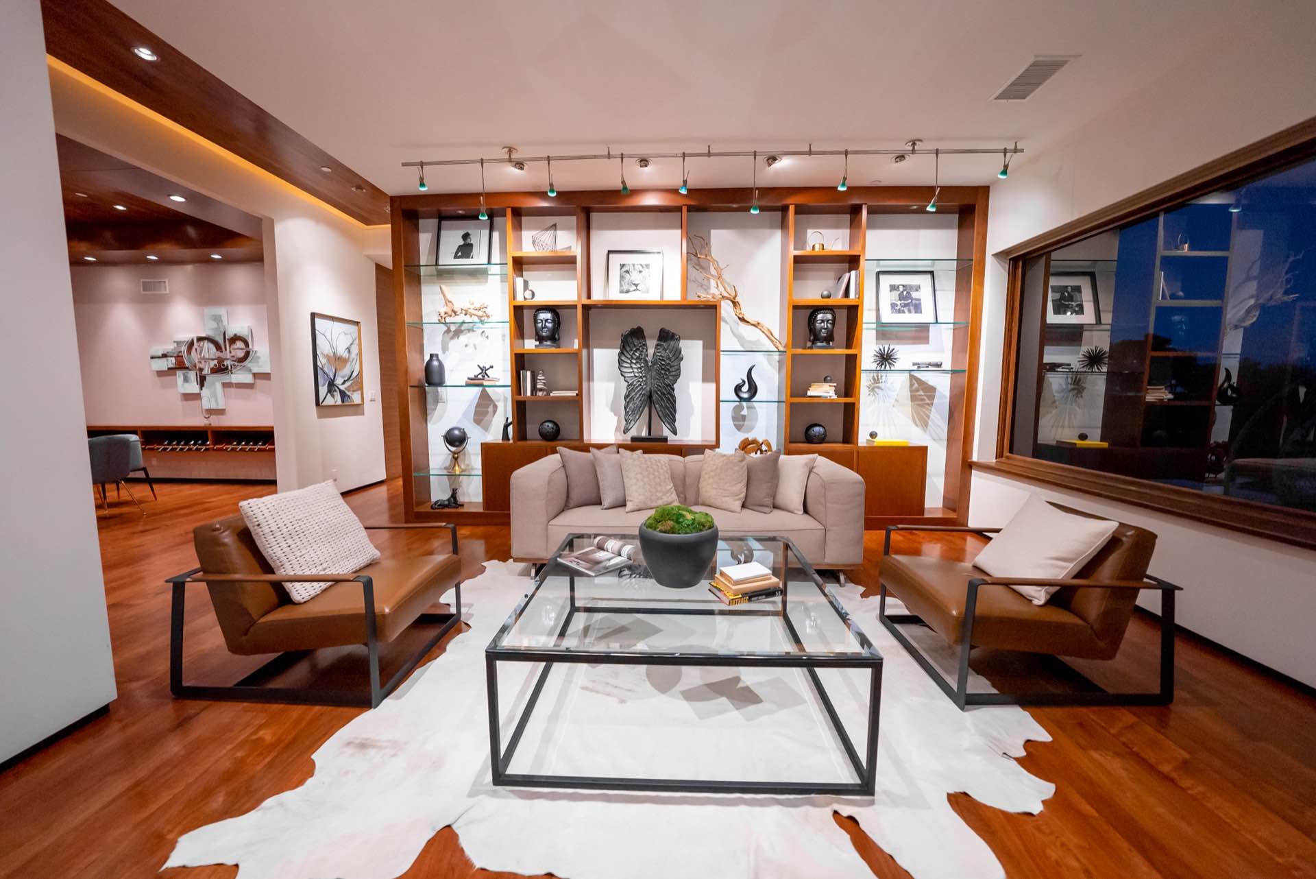 The massive living room with art gallery converts into a home theater upon command. The dining room features wraparound wine racks. The eat-in chef’s Kitchen features Miele and Wolfe appliances, Ceasar-stone counters, huge walk-in pantry, and a TV lounging area with breakfast nook.