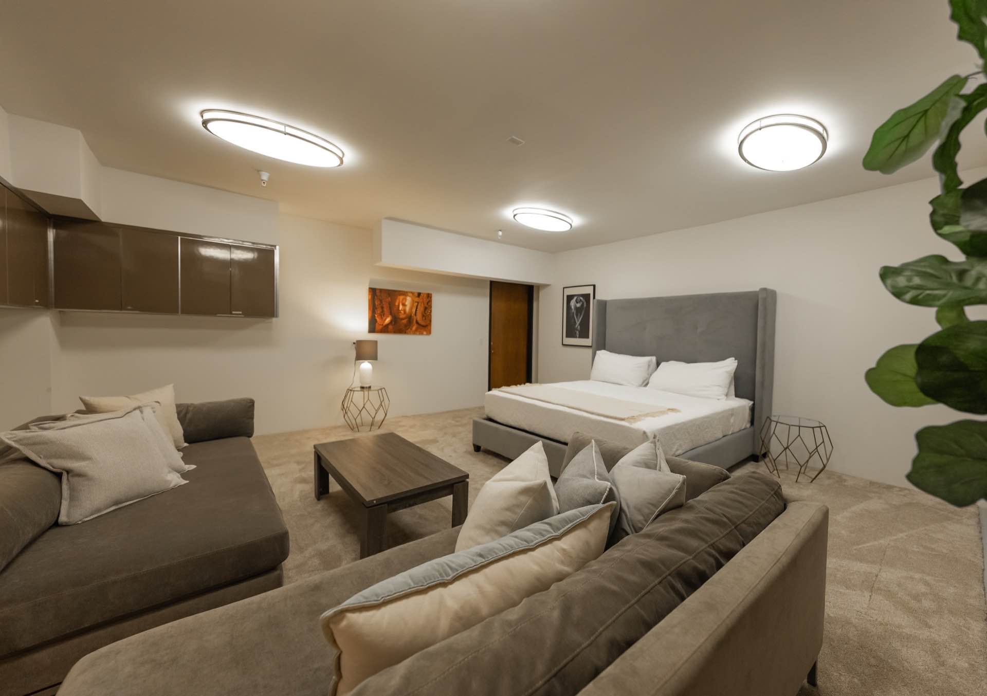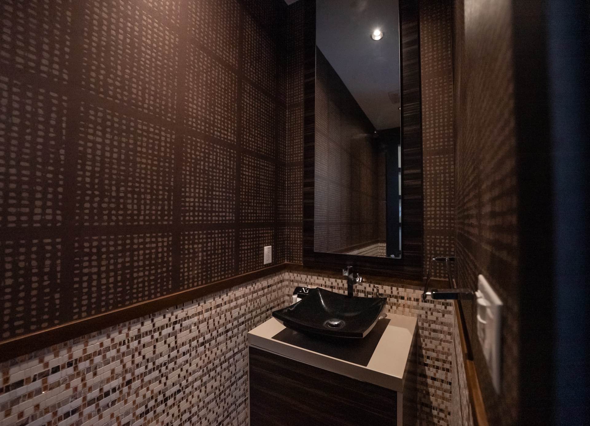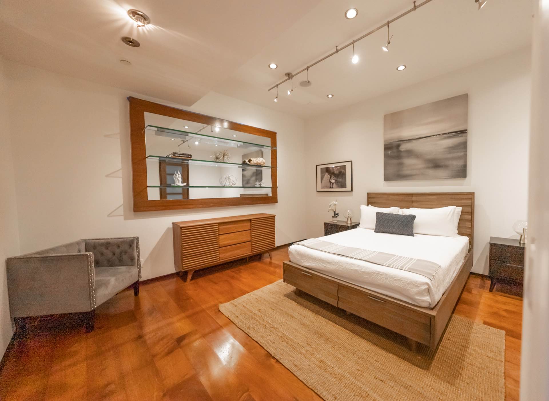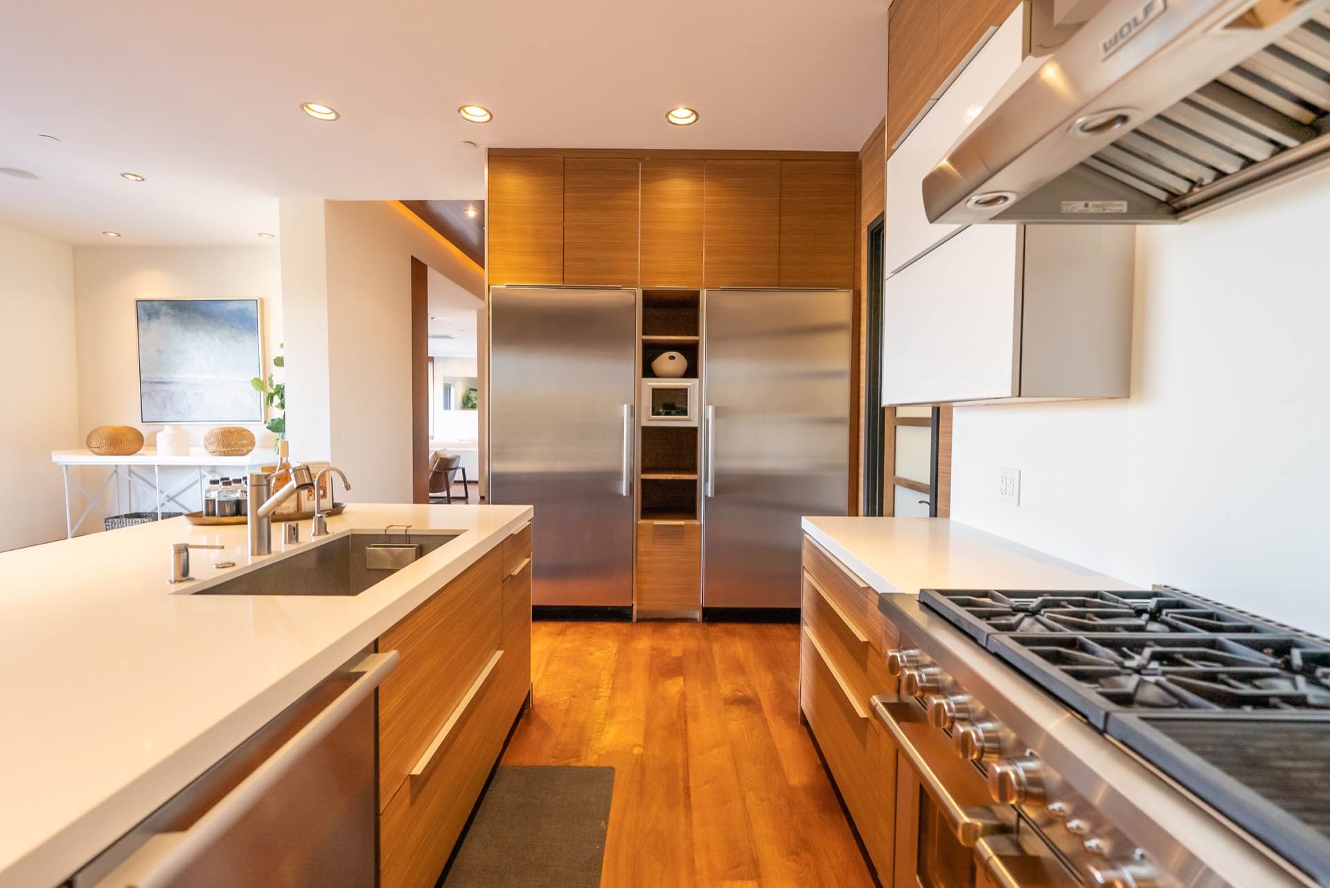 The massive living room with art gallery converts into a home theater upon command. The dining room features wraparound wine racks. The eat-in chef’s Kitchen features Miele and Wolfe appliances, Ceasar-stone counters, huge walk-in pantry, and a TV lounging area with breakfast nook.
