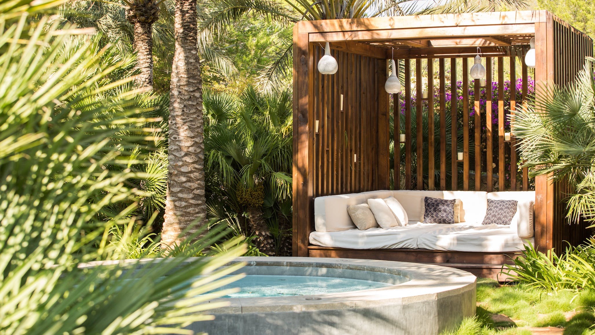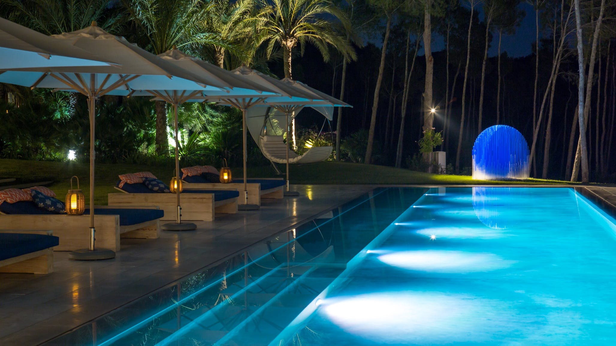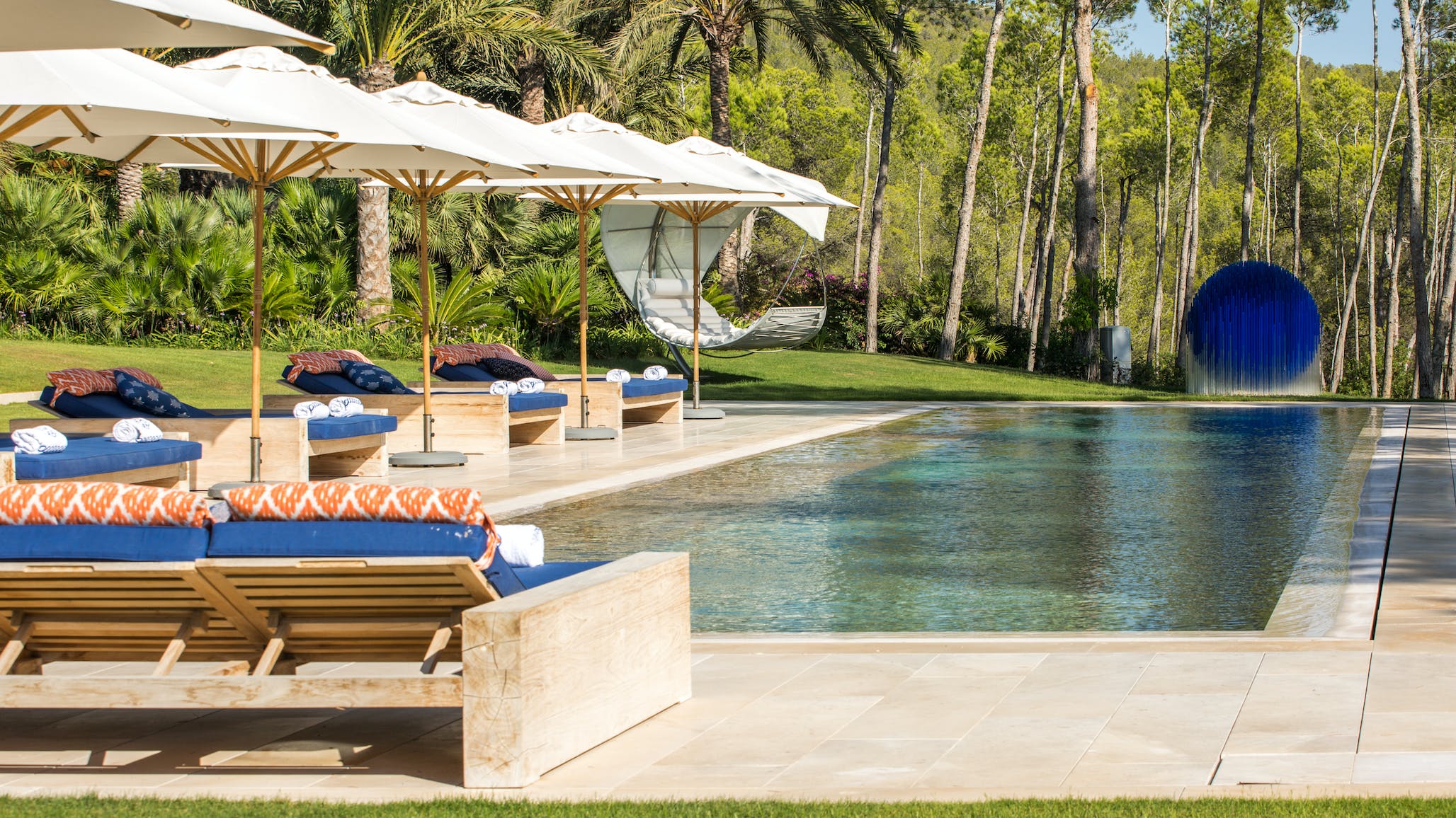 Beyond the pool, the manicured grounds hide contemporary artworks, a large jacuzzi for up to ten people surrounded by shady palms, a petanque pitch and The Enclave’s unique outdoor cinema.