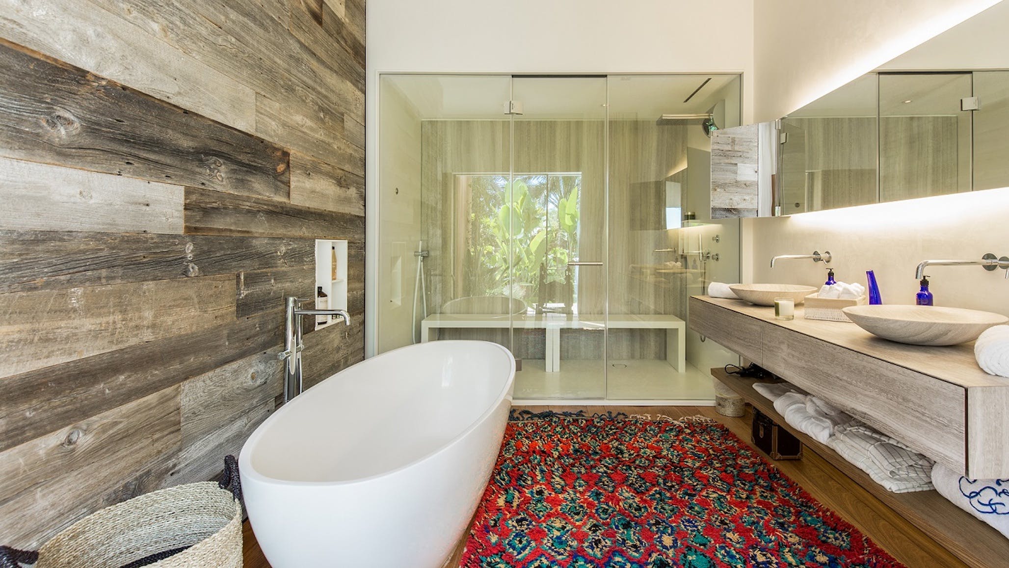 Inside this villa, quirky contemporary styling and polished natural wood floors lift the modern design to create a cosiness and warmth within the bright modern interior. Each bright, airy bedroom maintains guest privacy, and each has a modern en-suite with the same original blend of natural materials and high-end design. The master en-suite includes shower, bath, Hammam and private access to the jacuzzi and a private chill-out area.