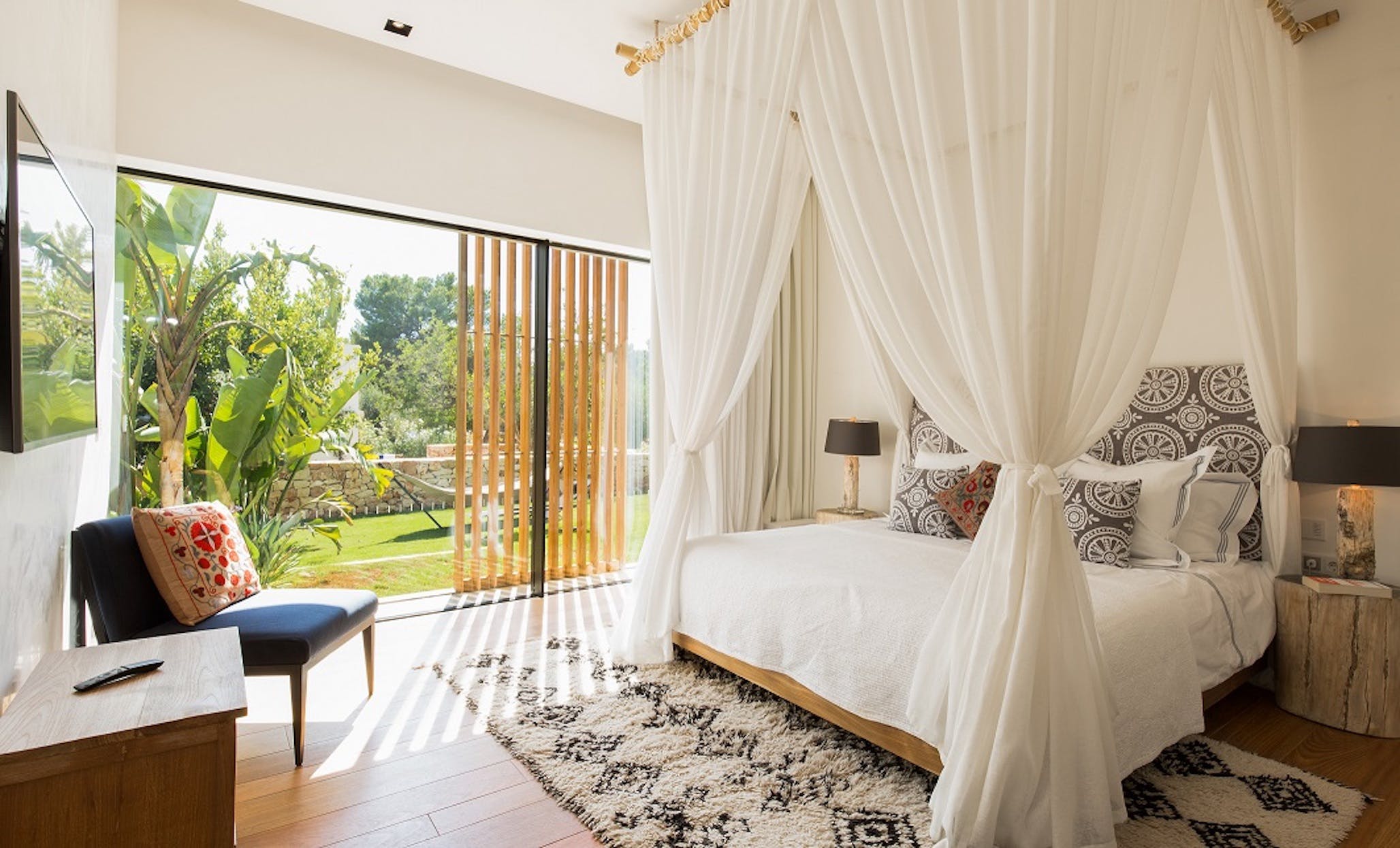Bedroom 2: King size bed, TV and Sonos music, air conditioning, private outdoor shower, private terrace, en-suite bathroom with shower.