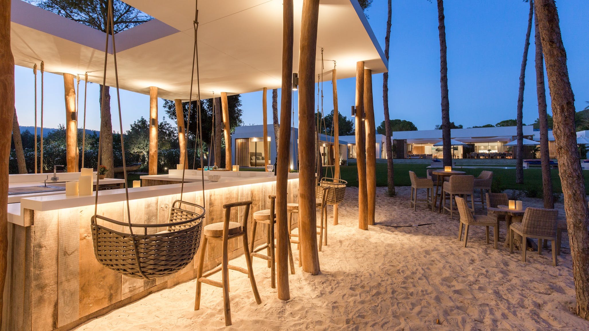 The exterior terrace boasts wide corner seating and an extended dining table with views across the pool to the silvery sands which are The Enclave’s other al-fresco lounge area. This white sand beach under tall pines features a professional bar and seating for up to 30 people.