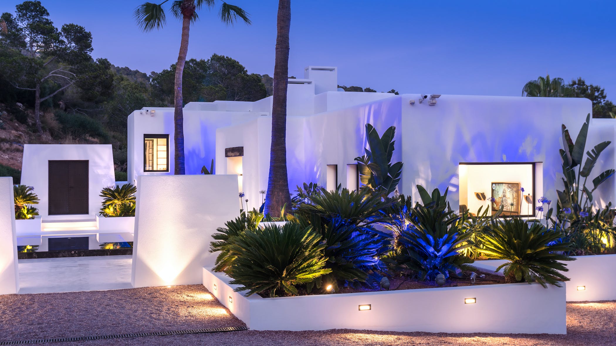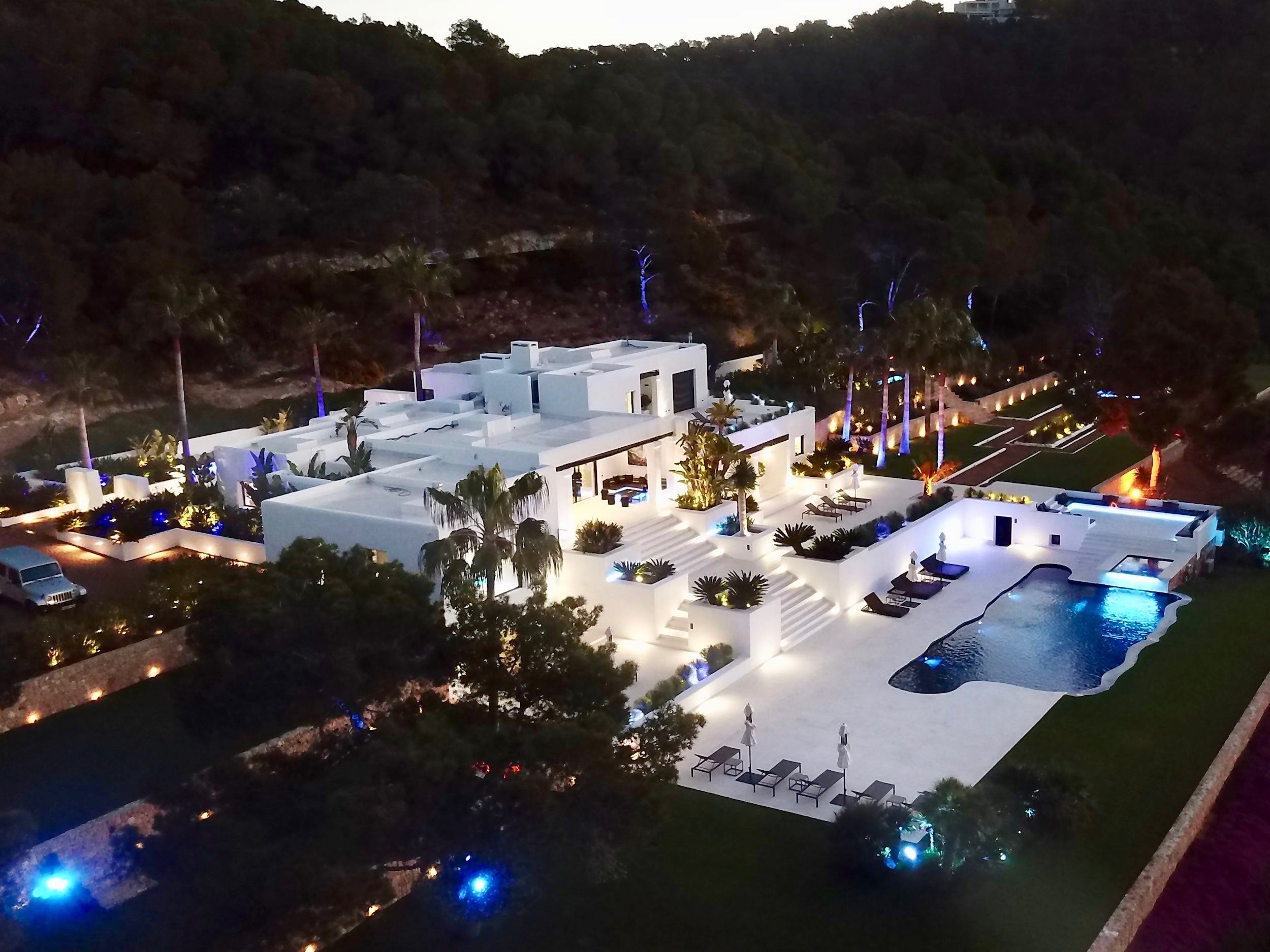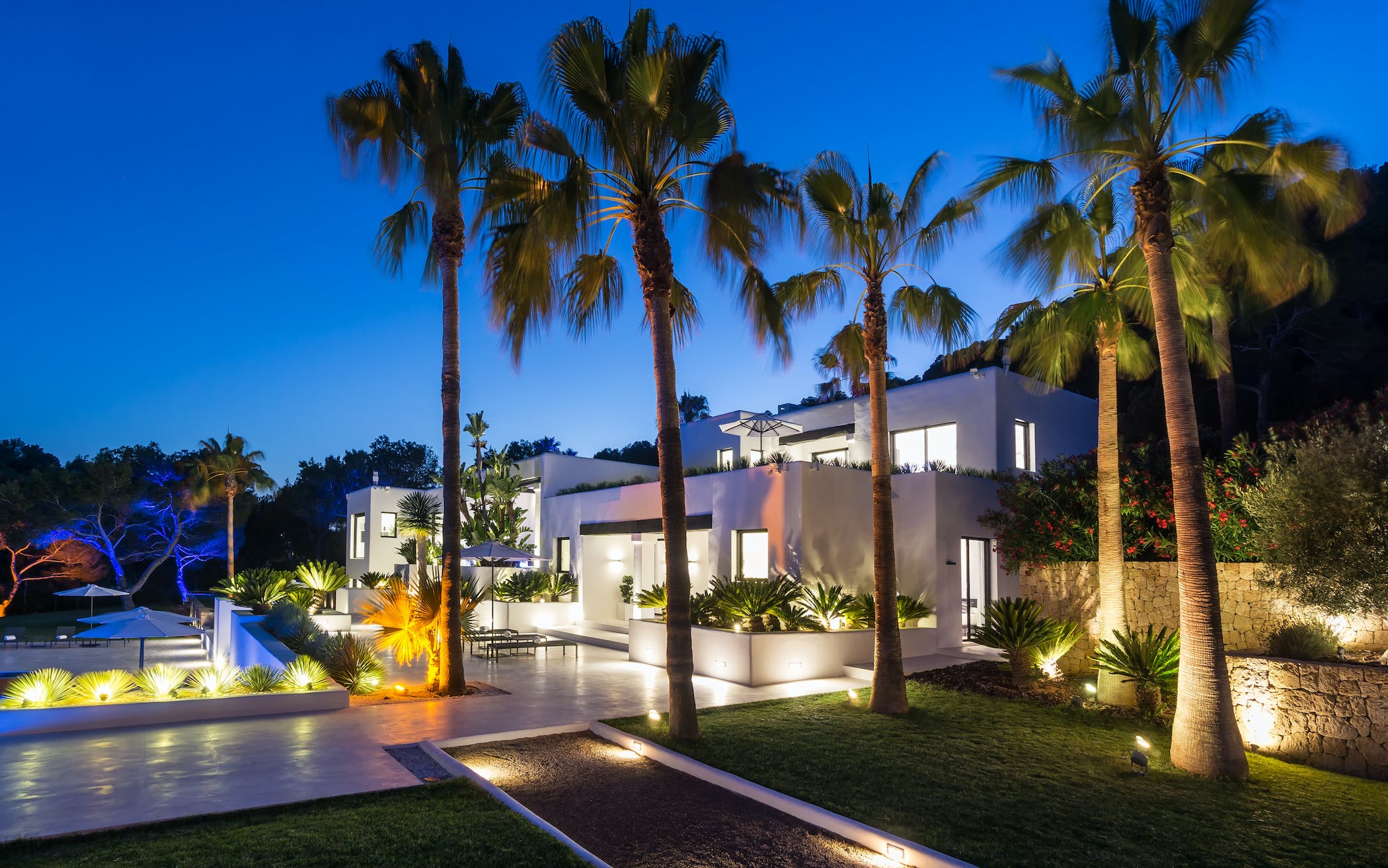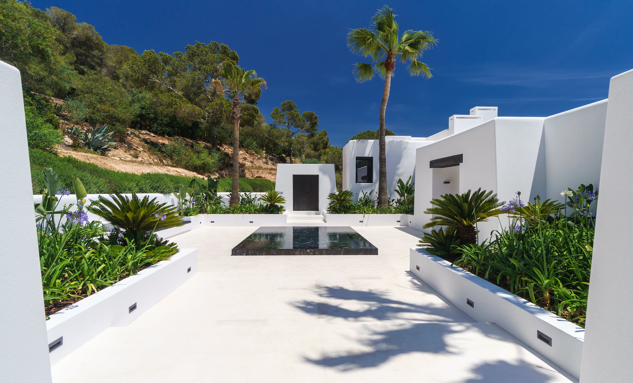 In the prestigious neighbourhood of Cap Martinet, this outstanding contemporary property hides amongst tree-clad hills overlooking the blue Balearic waters shimmering in the distance.