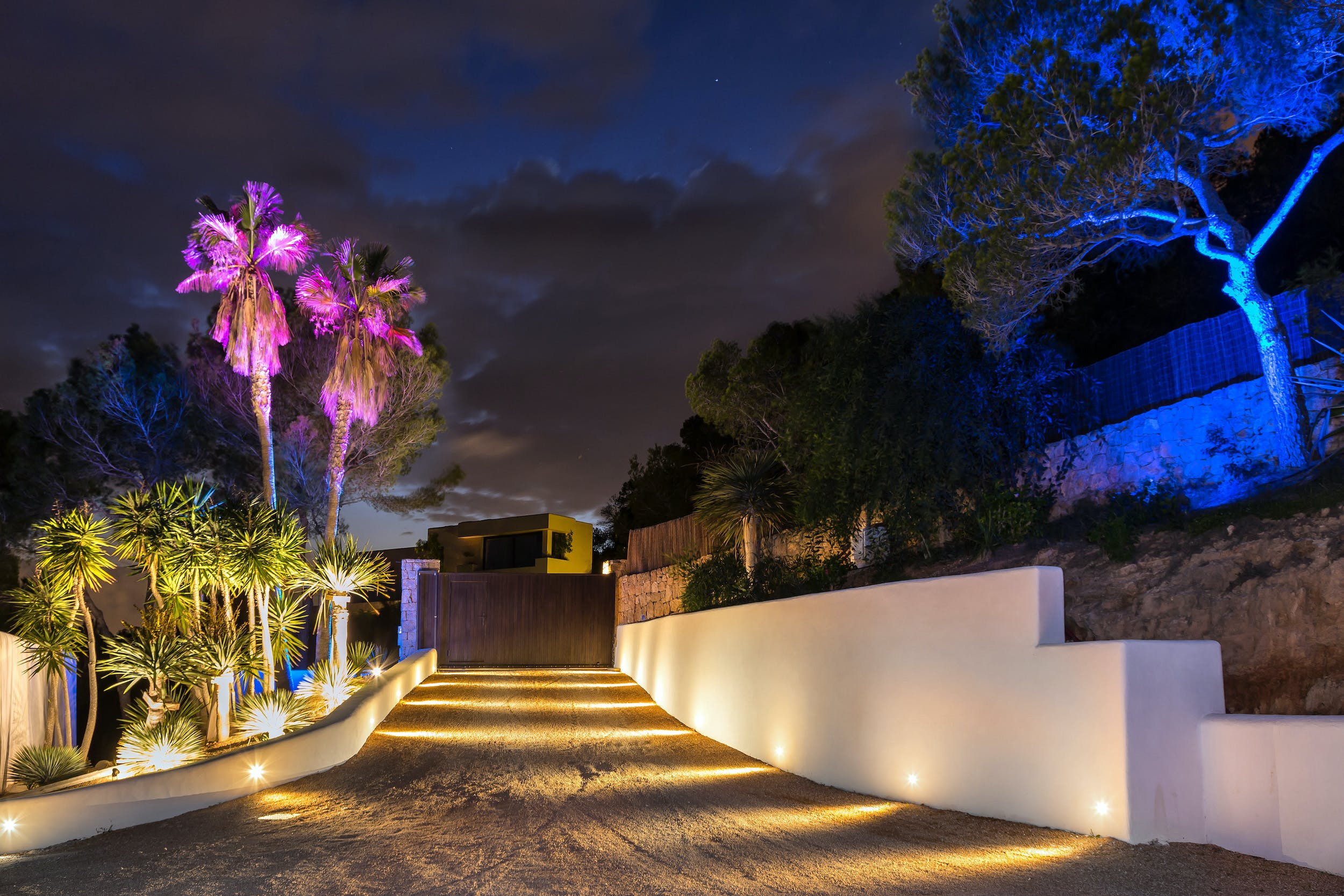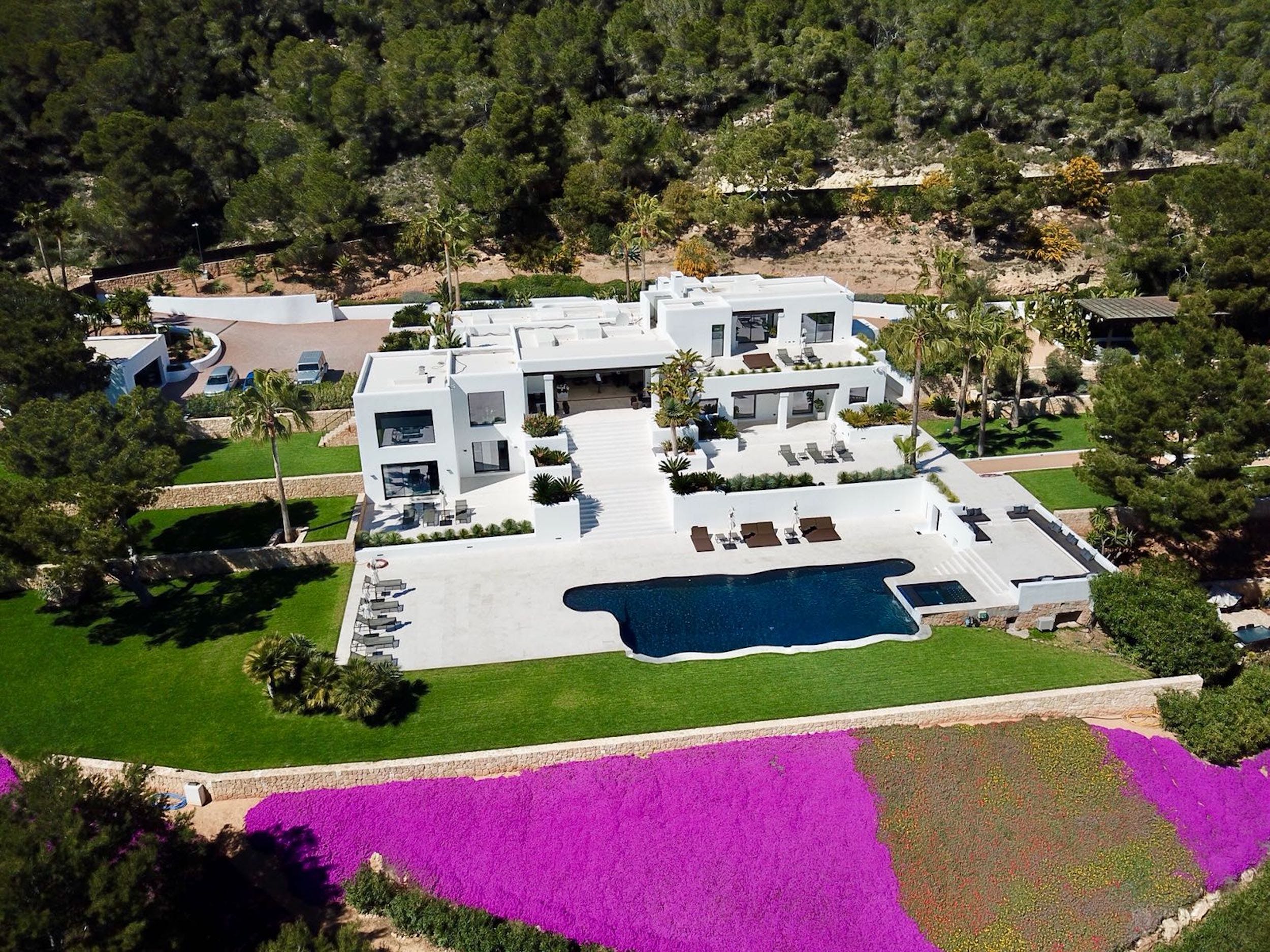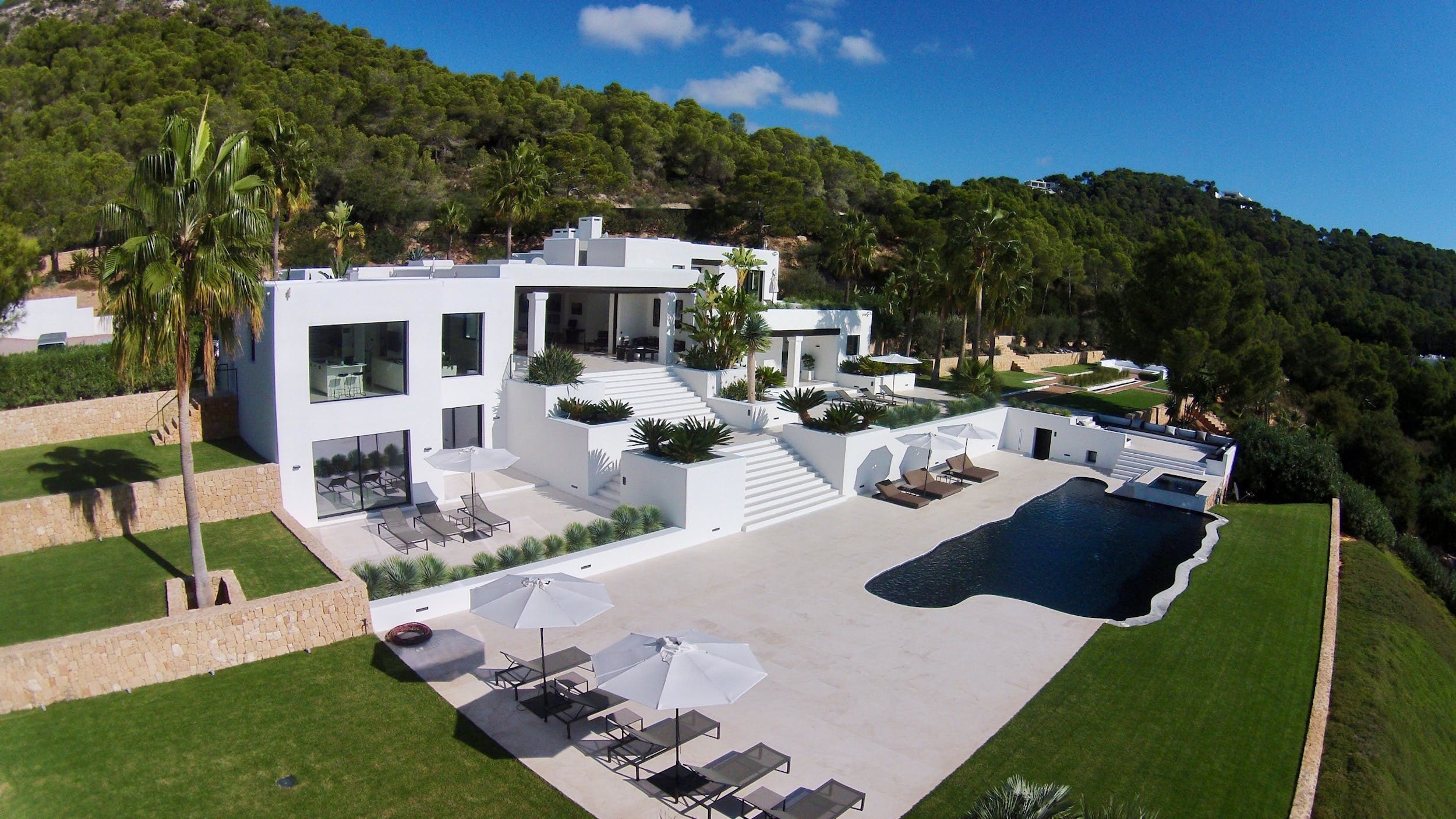 In the prestigious neighbourhood of Cap Martinet, this outstanding contemporary property hides amongst tree-clad hills overlooking the blue Balearic waters shimmering in the distance.