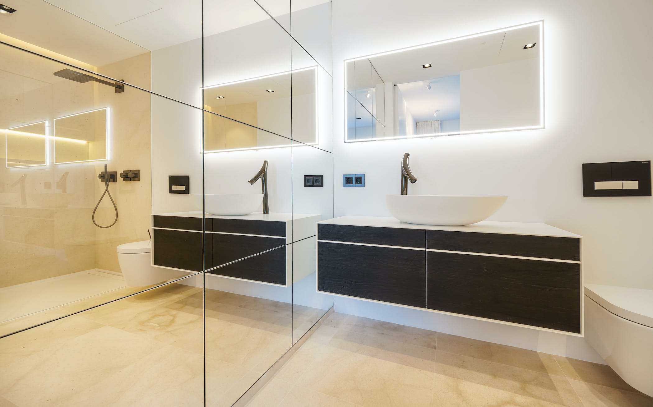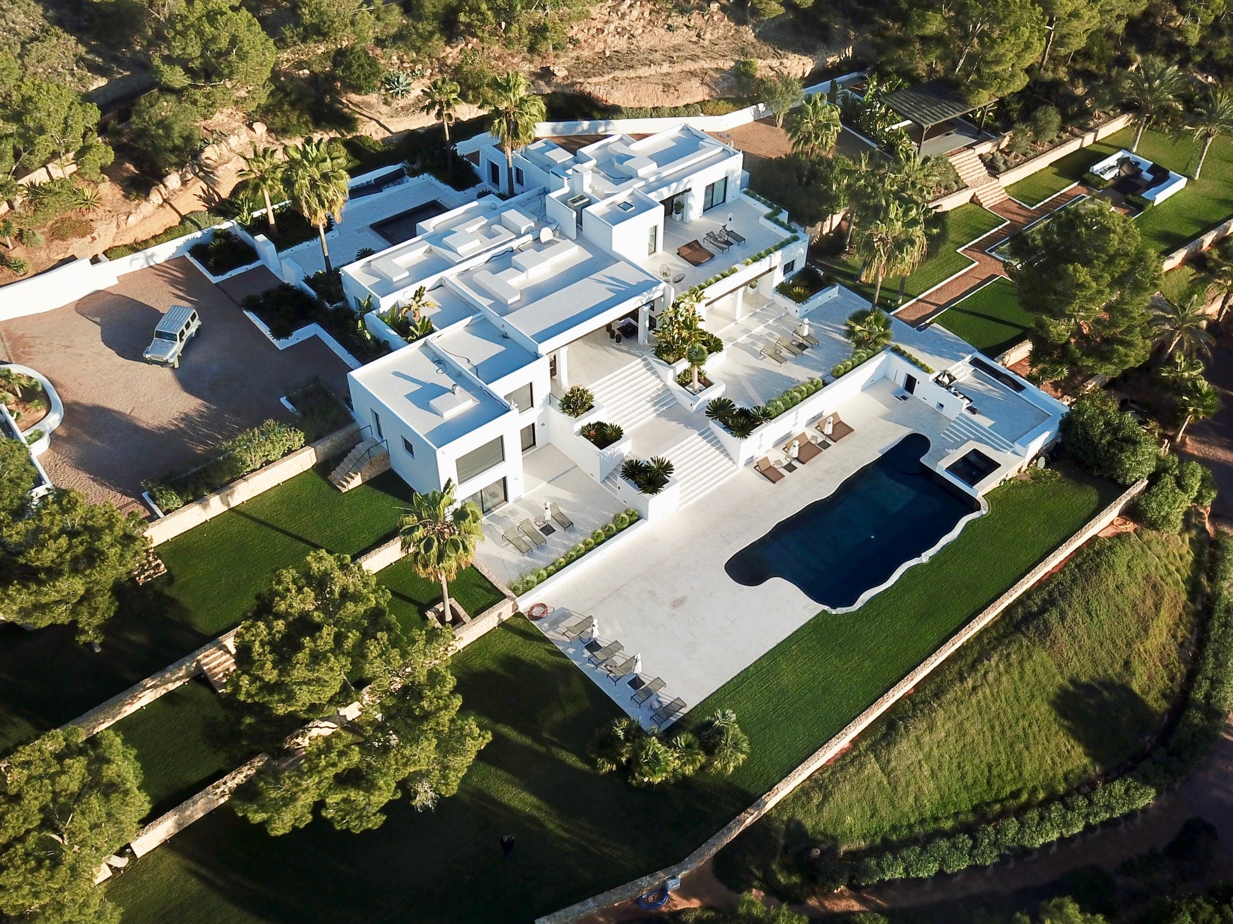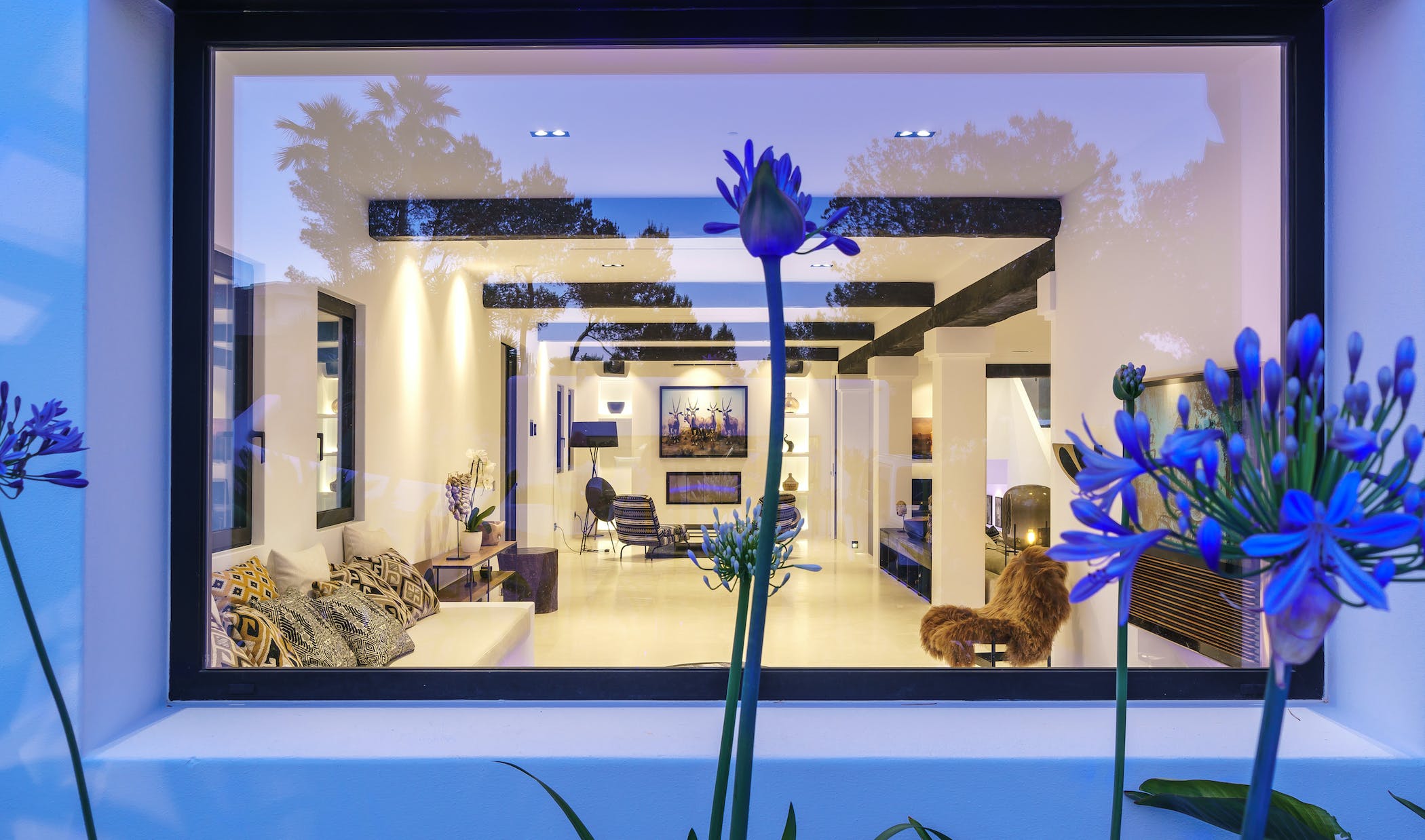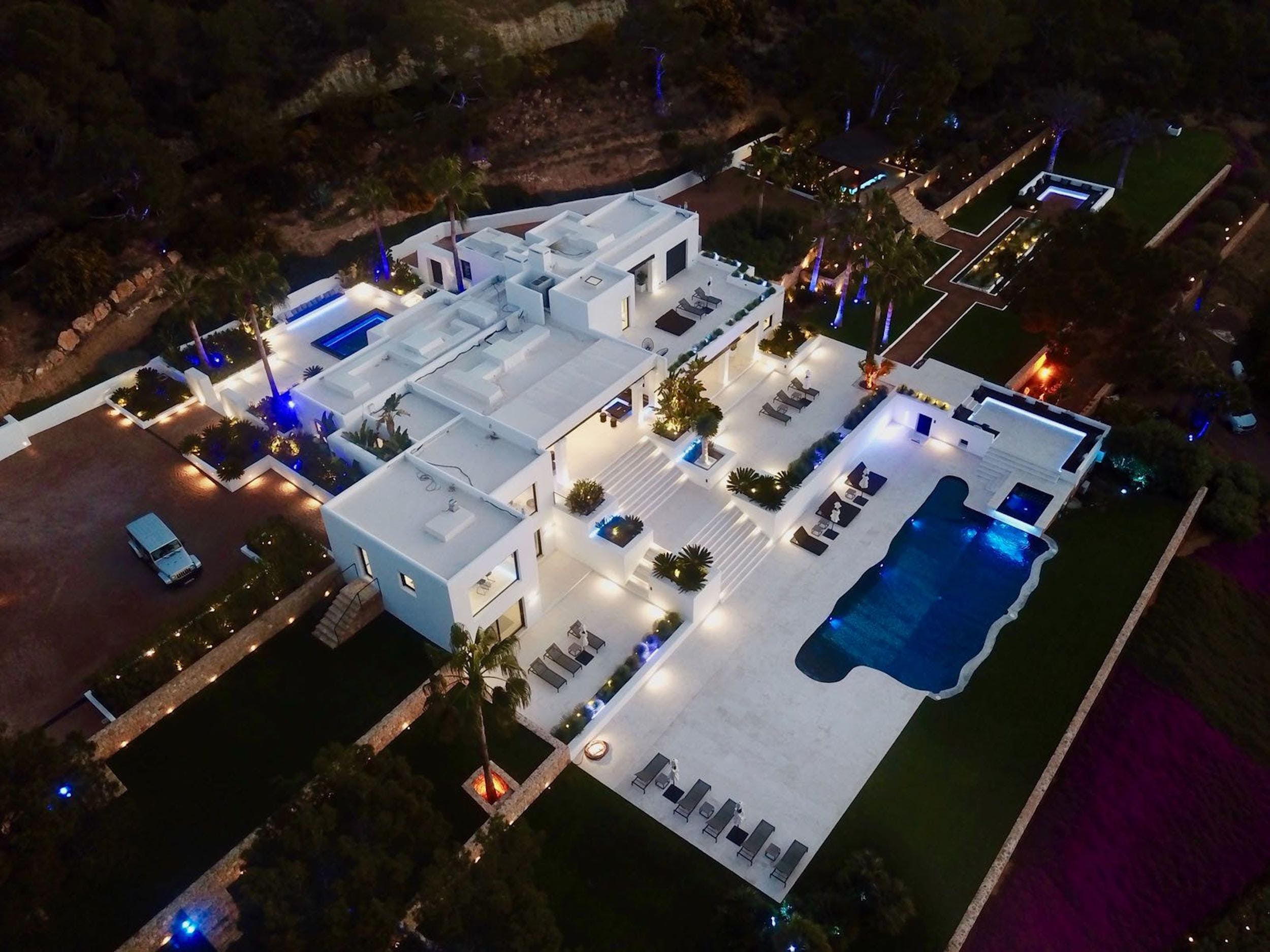 In the prestigious neighbourhood of Cap Martinet, this outstanding contemporary property hides amongst tree-clad hills overlooking the blue Balearic waters shimmering in the distance.