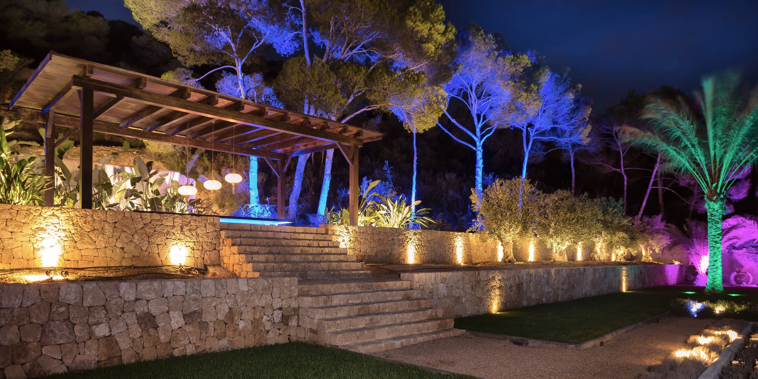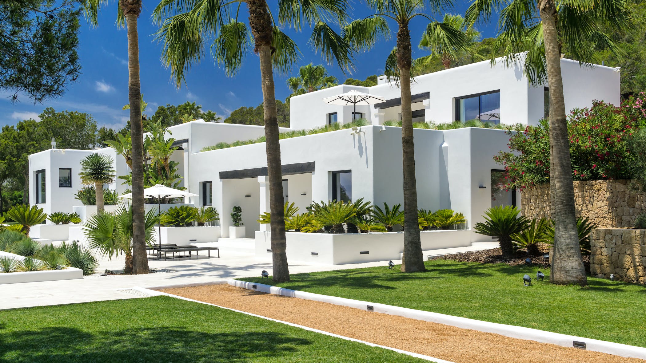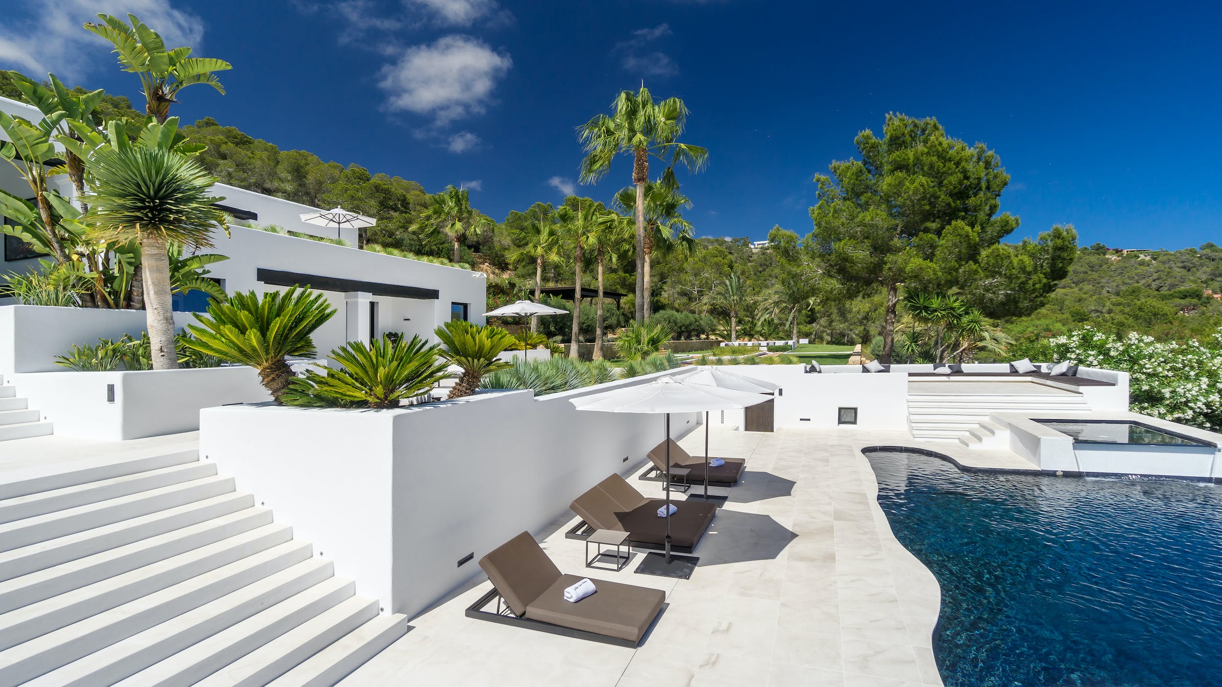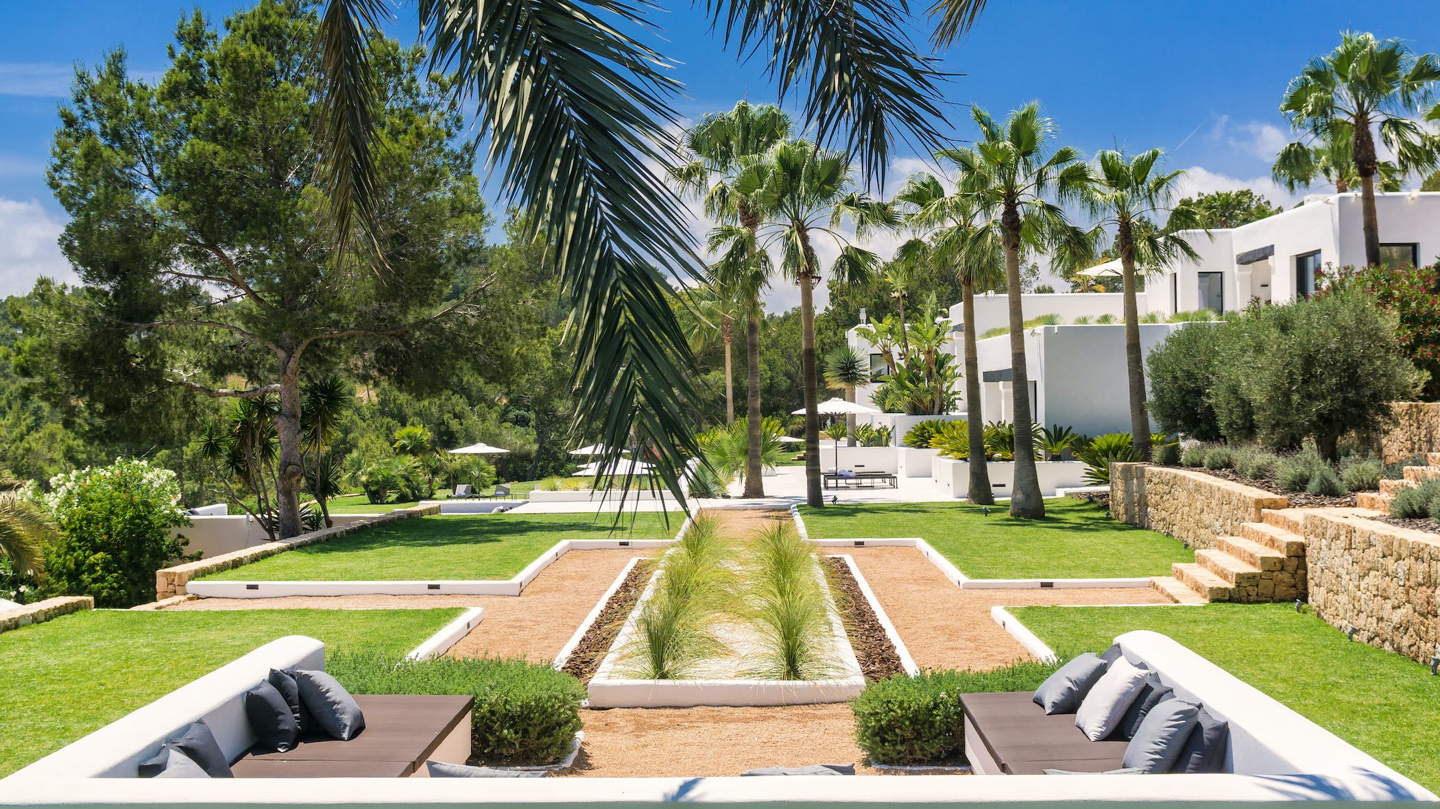 Beautiful formal gardens, with tall pines, tropical planting, neat lawns and the broad white rendered steps that link the house, terrace and sparkling pool are a serene backdrop to this beautiful Ibizan holiday home.