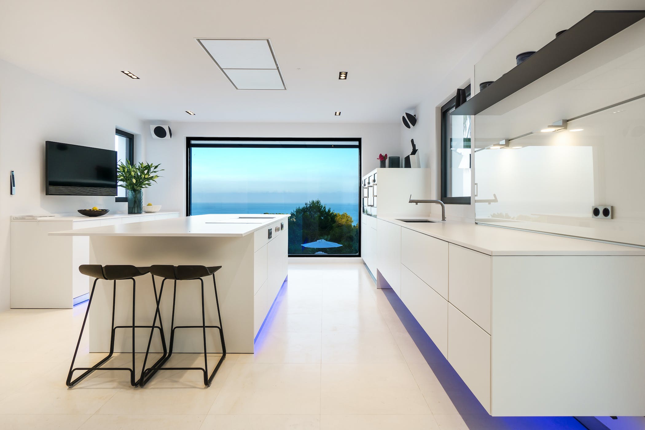 Closer to the house, the shady terrace offers more chill-out lounge seating. Here, wide, sliding glass doors open to seamlessly link the terrace with the stylish interior living spaces. The sophisticated, cool white interiors lead through a spacious lounge, to a formal dining table, seating twelve, and large kitchen. All share beautiful views across the private gardens to the sea.