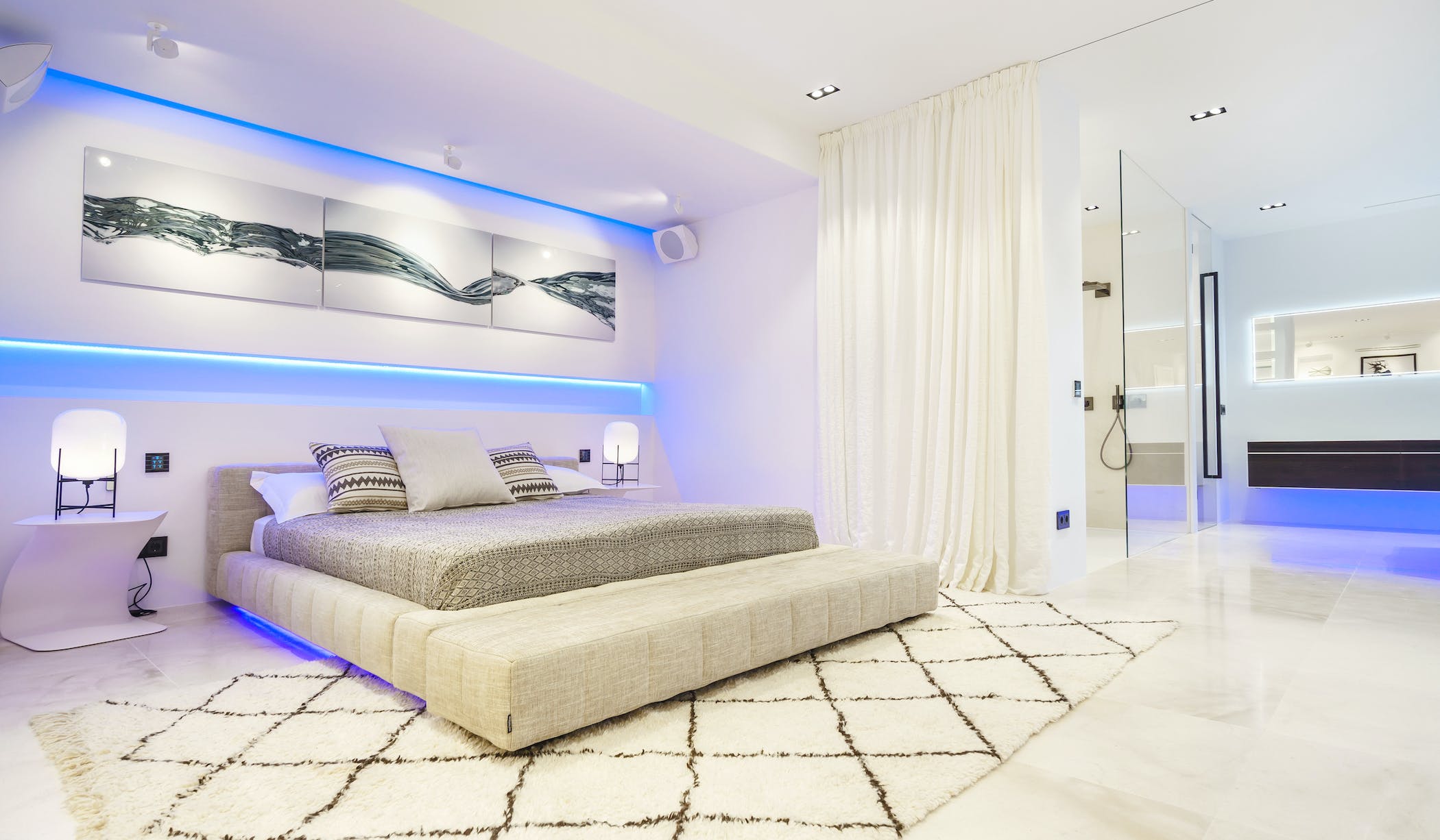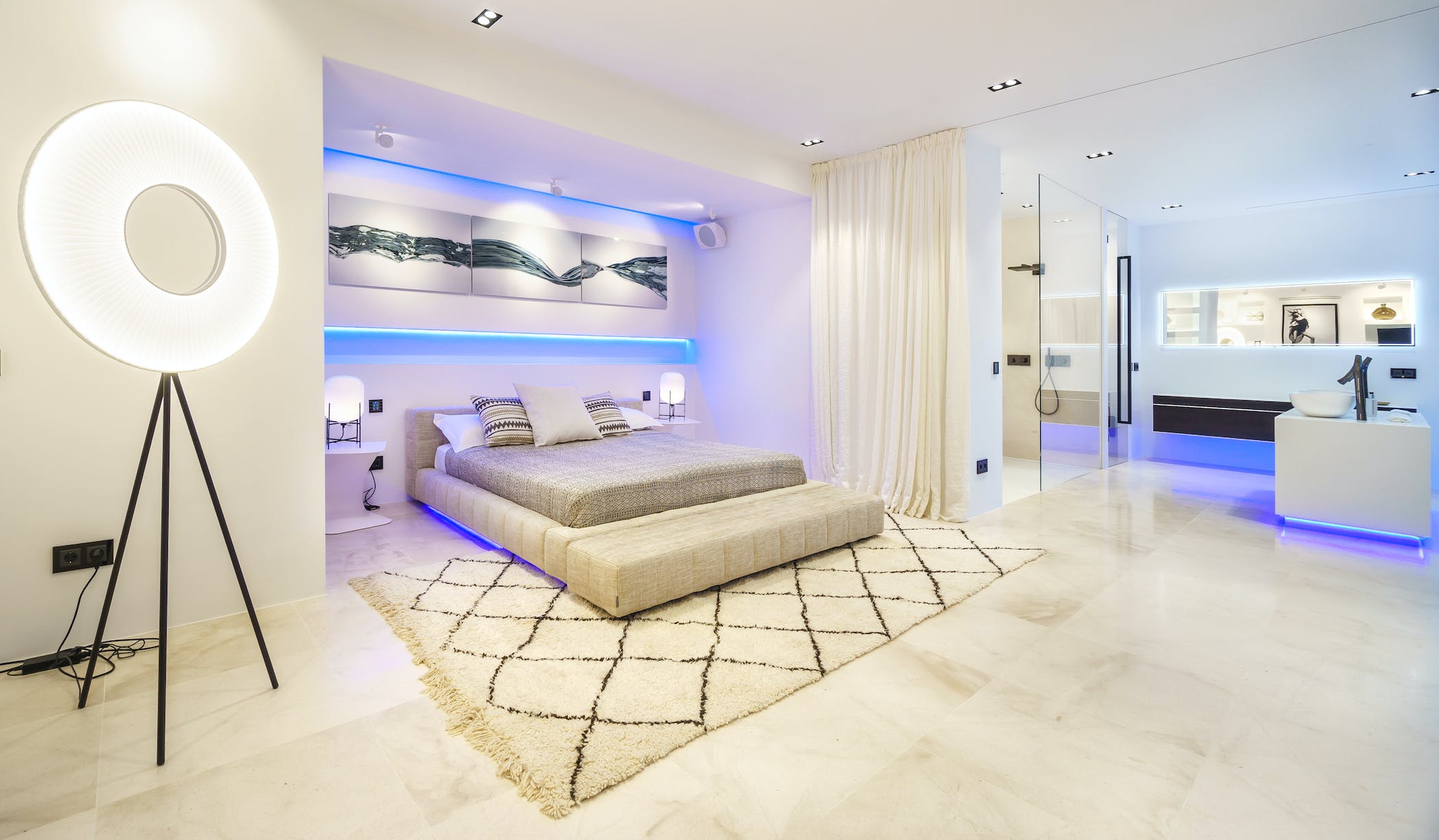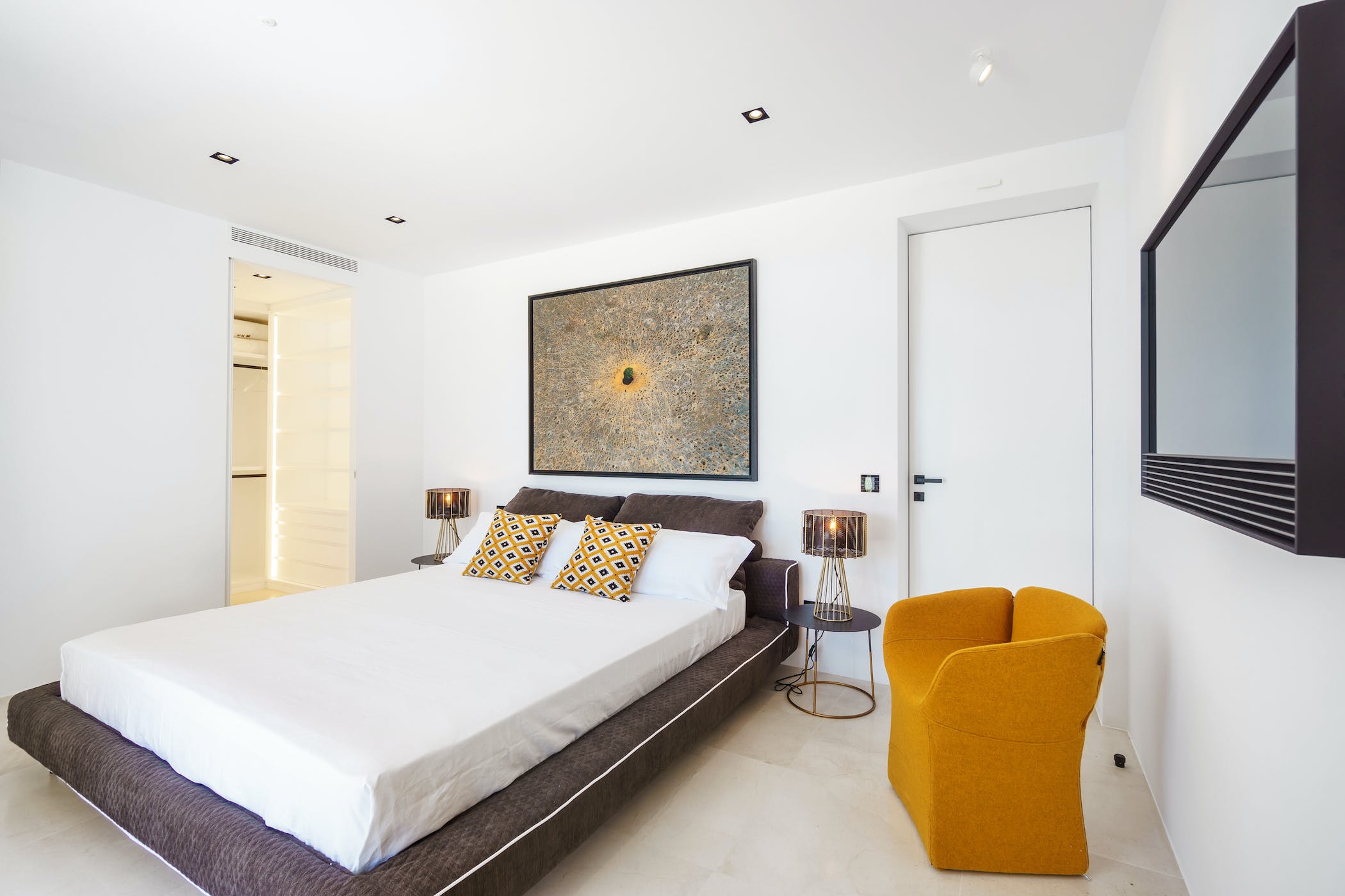 The minimalist elegance continues through the six delightful double bedrooms, softened by beautiful art and stylish monochrome soft furnishings. The master suite on the upper floor enjoys access to a private terrace and a freestanding bath from where you can enjoy the beautiful sea views as you soak.