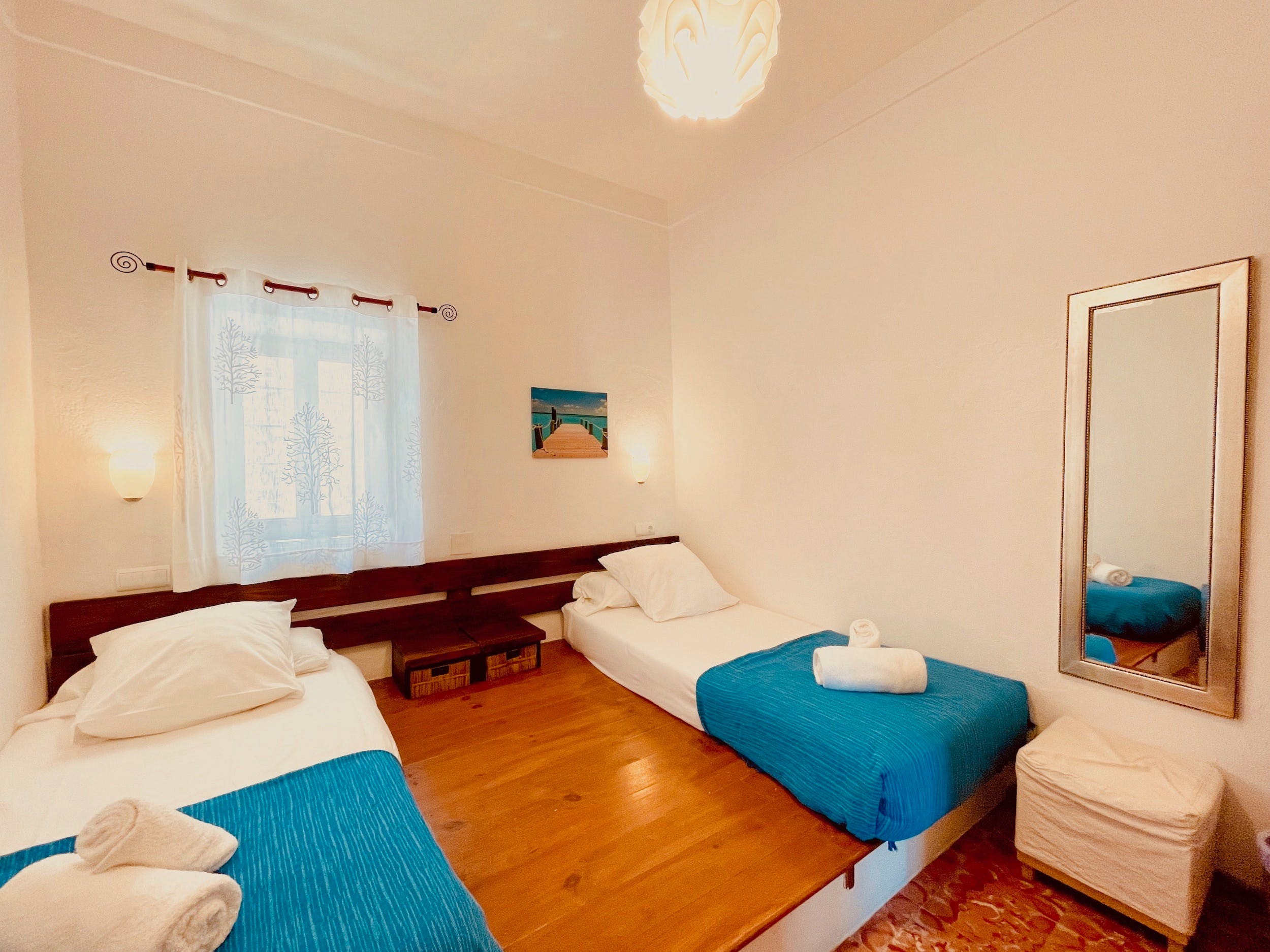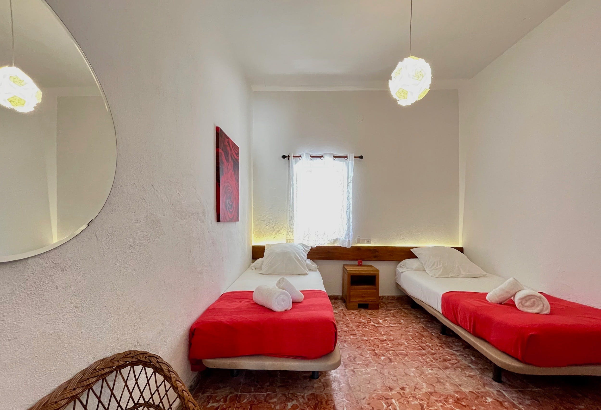 Ground Floor – Twin beds (90×200), equipped with fans, shared bathroom with double shower.