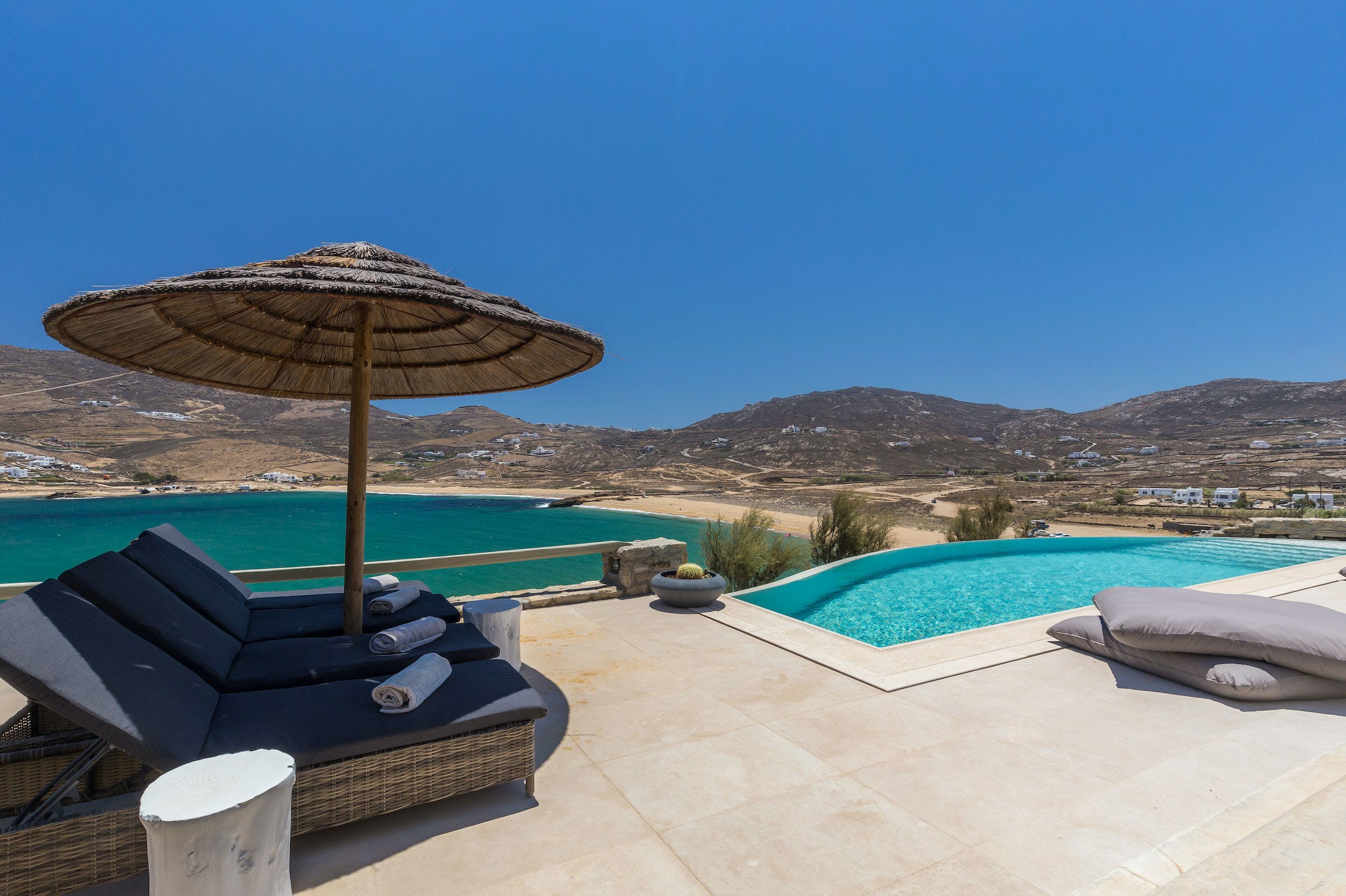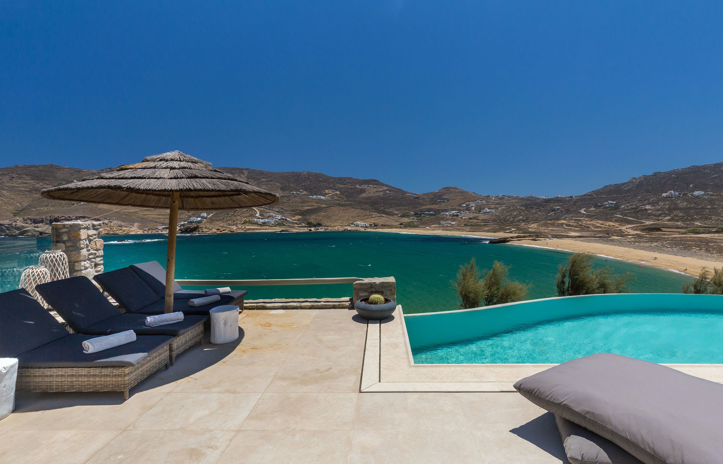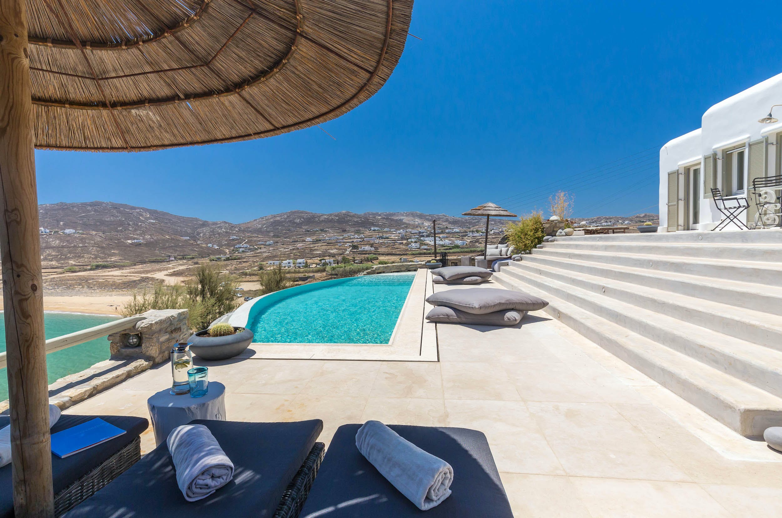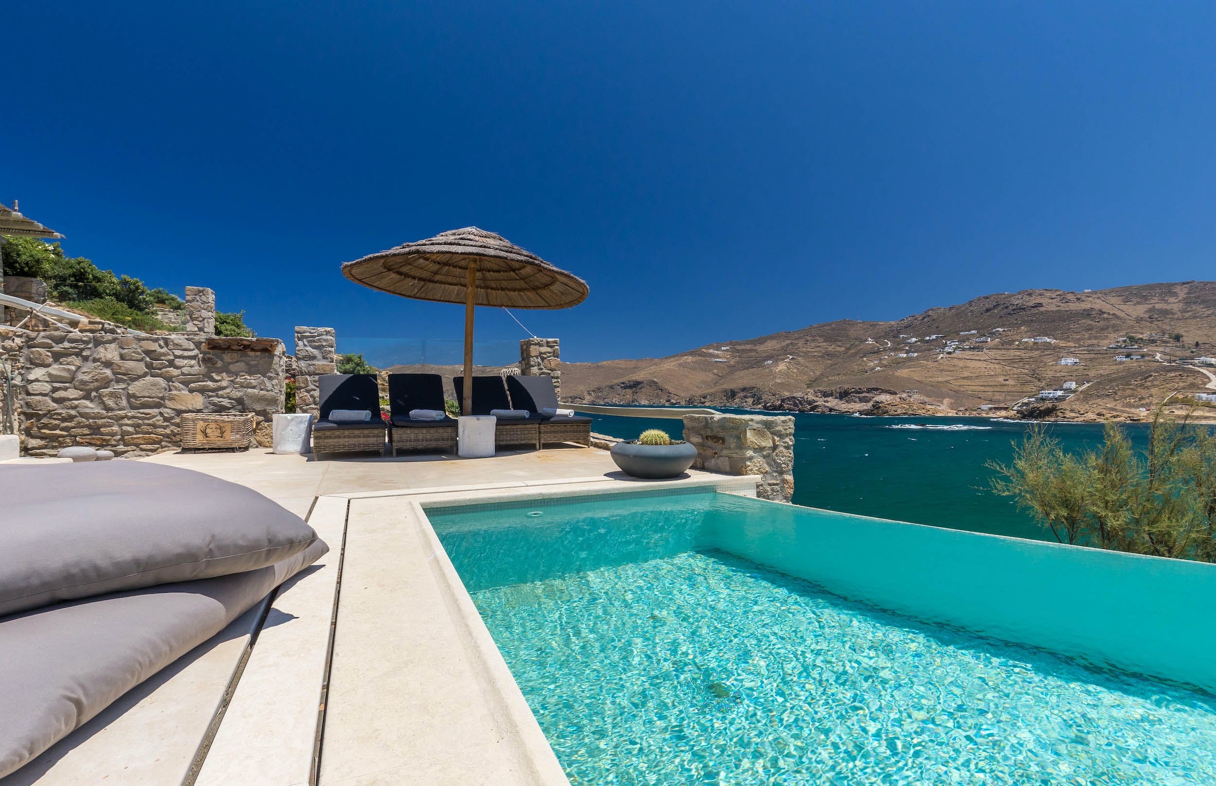 Turquoise Bay occupies a glorious position on the headland to the bay, looking out over its sparkling blue waters and offering an idyllic Mykonos retreat. There is direct access, via steps, to the beach from its lower terrace.