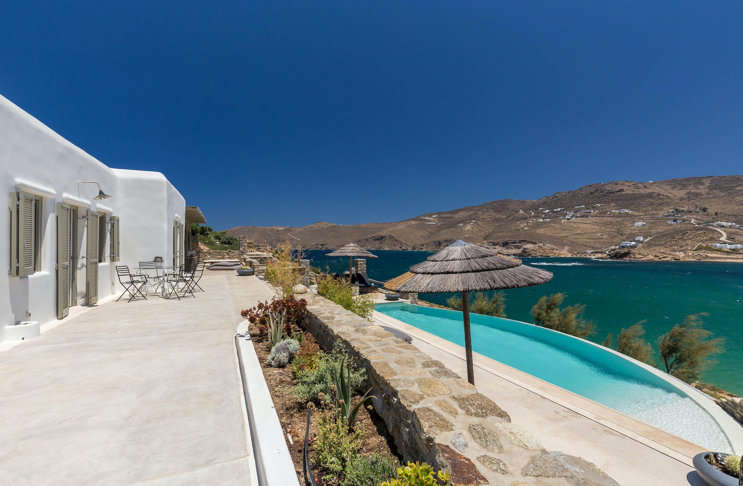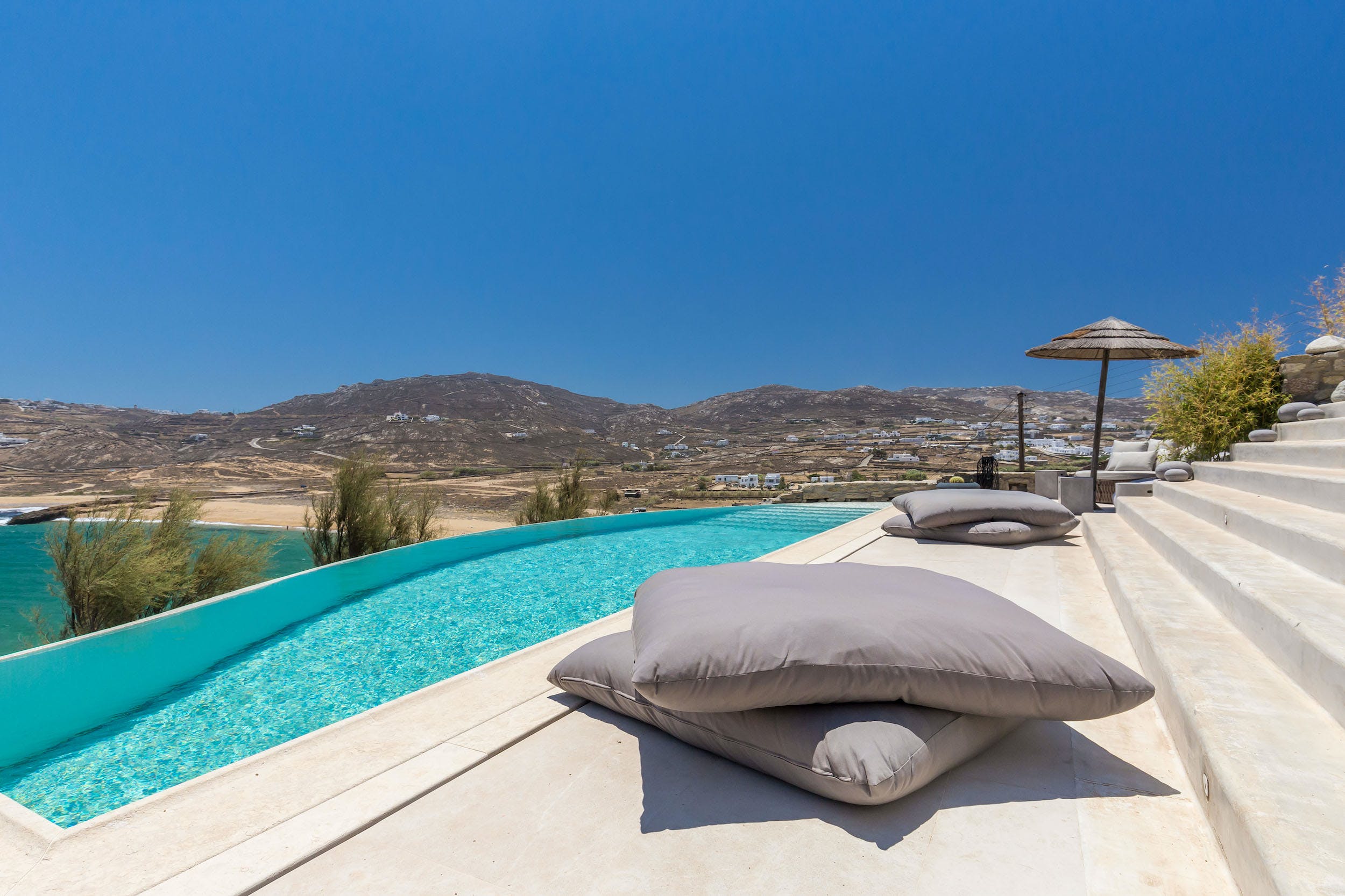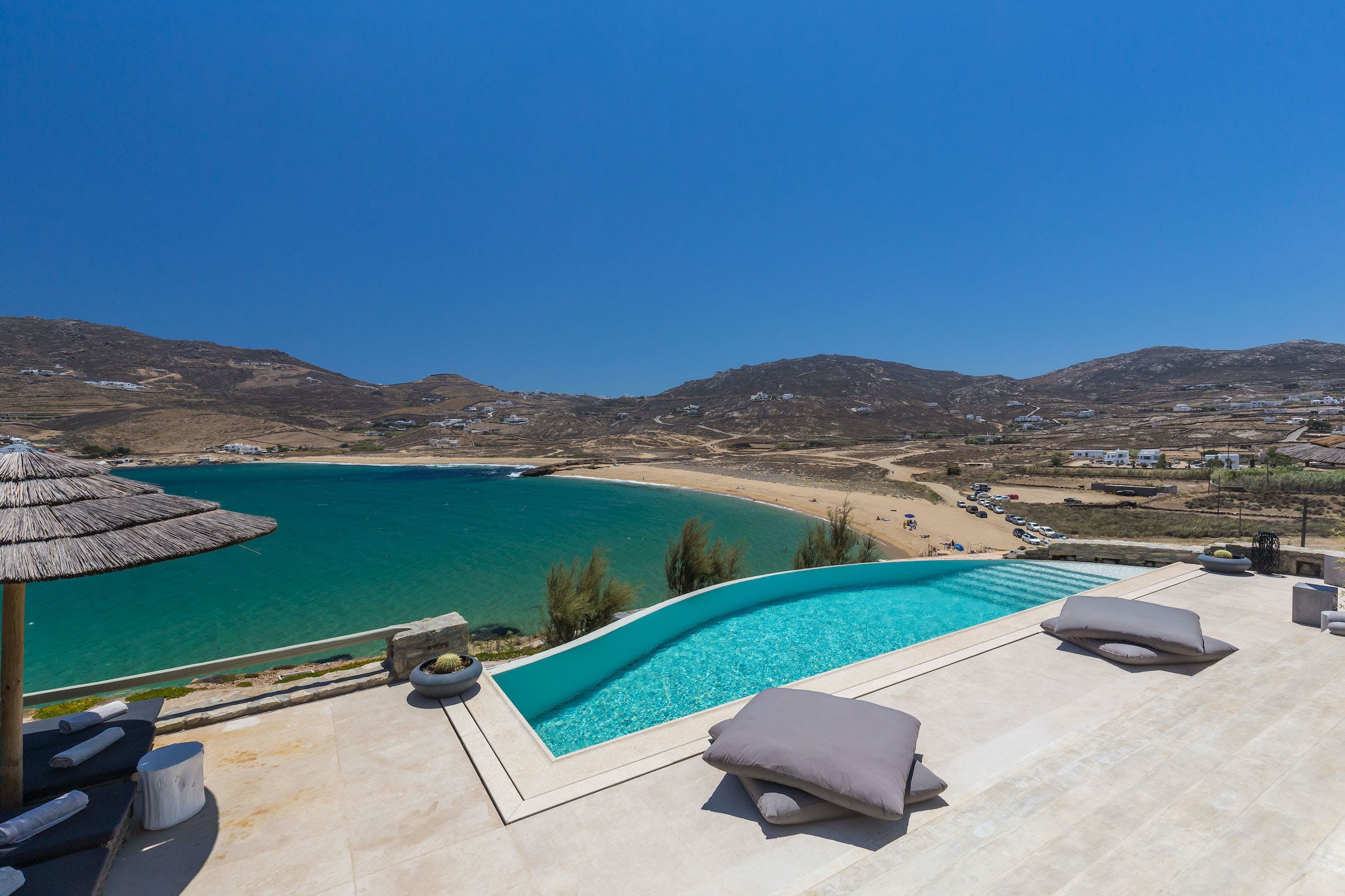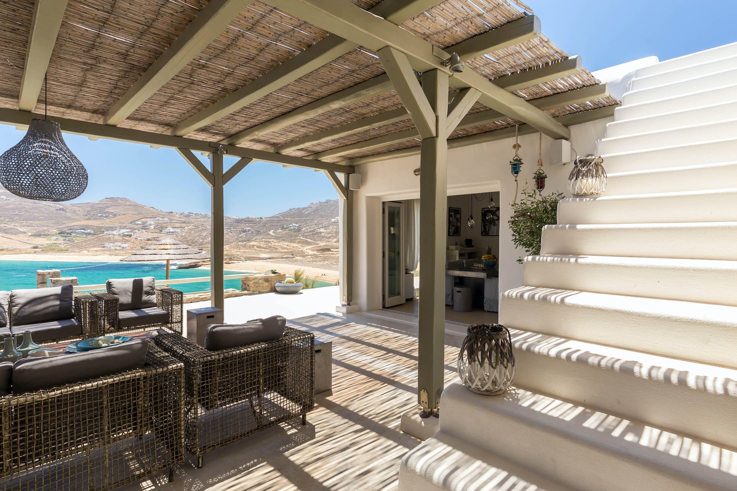 Turquoise Bay occupies a glorious position on the headland to the bay, looking out over its sparkling blue waters and offering an idyllic Mykonos retreat. There is direct access, via steps, to the beach from its lower terrace.
