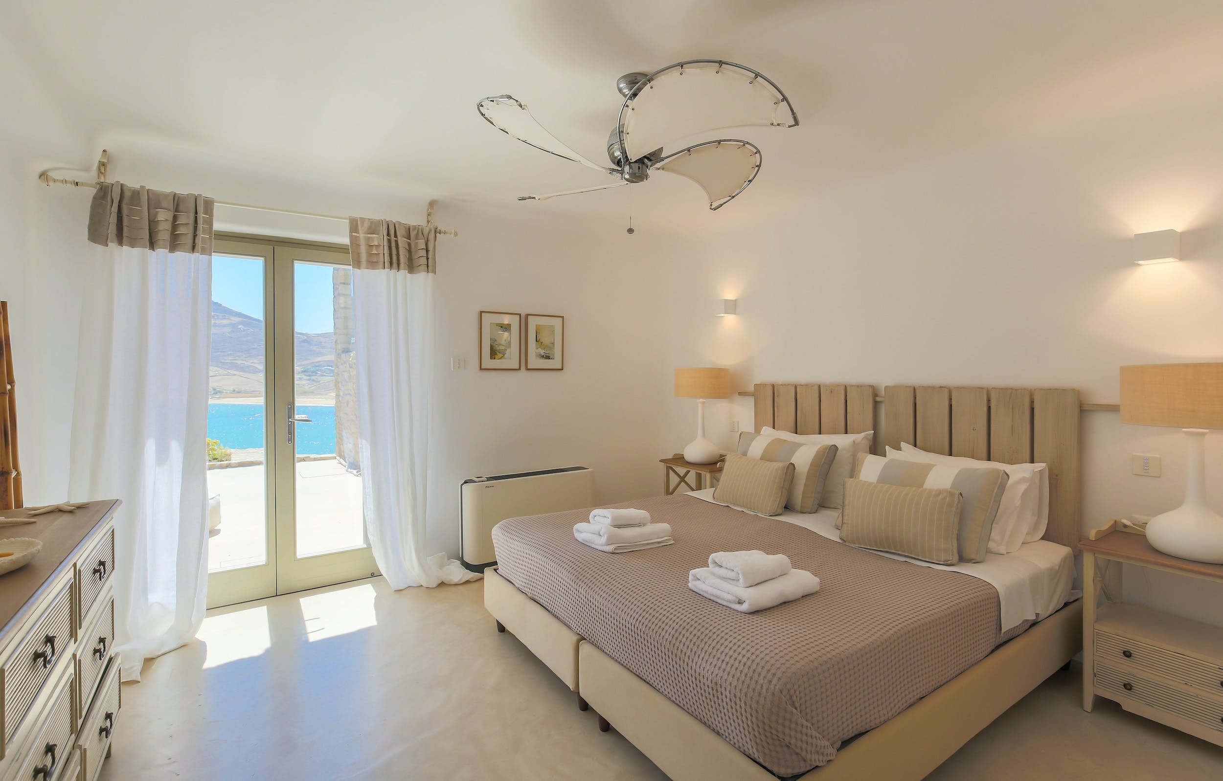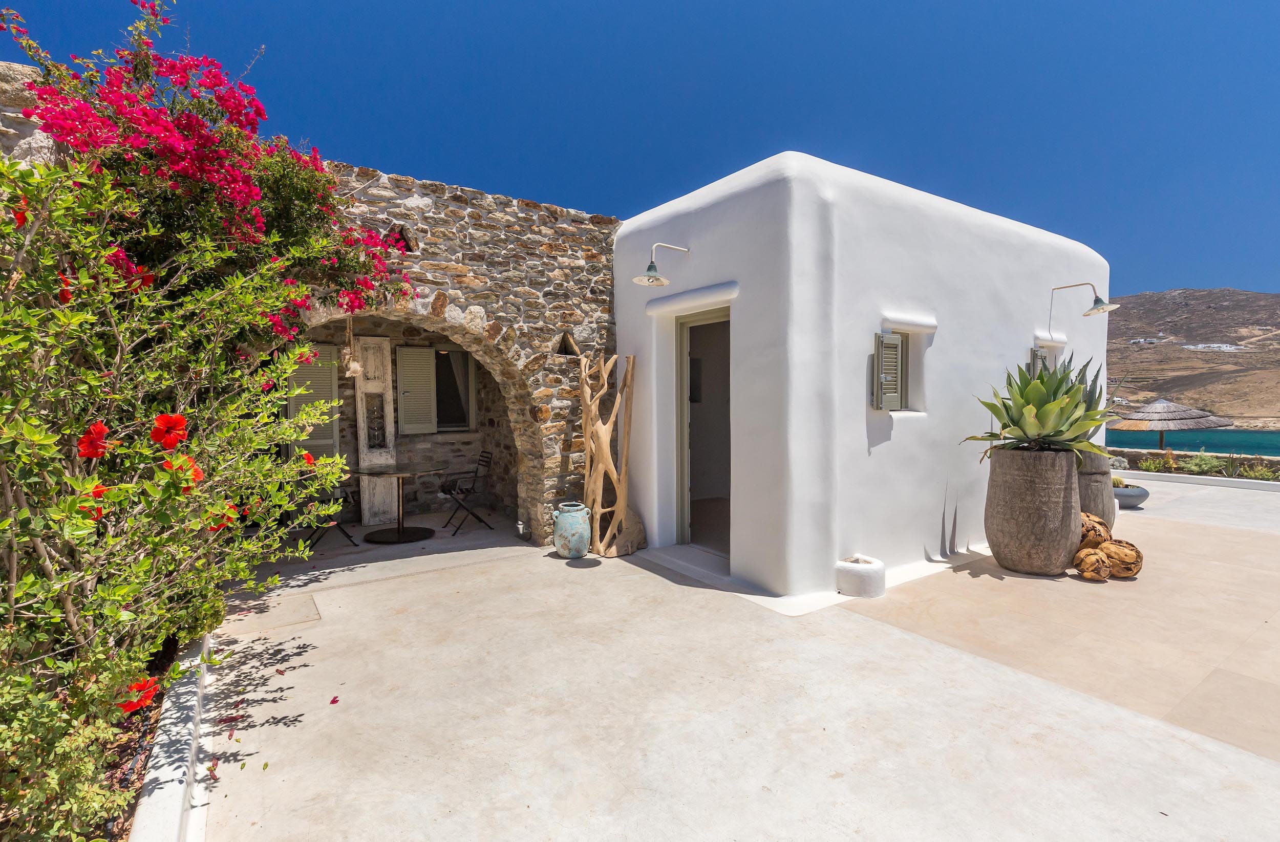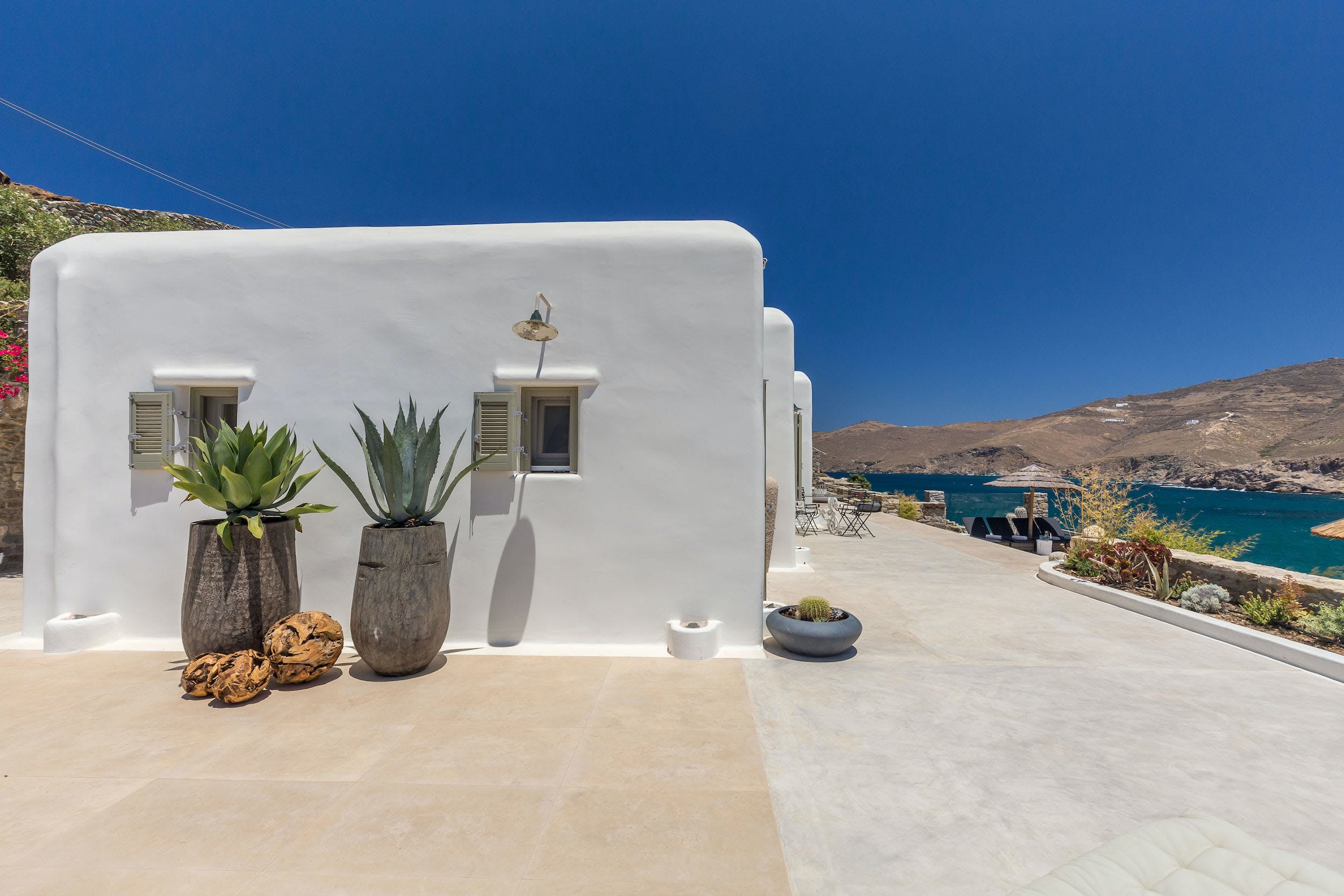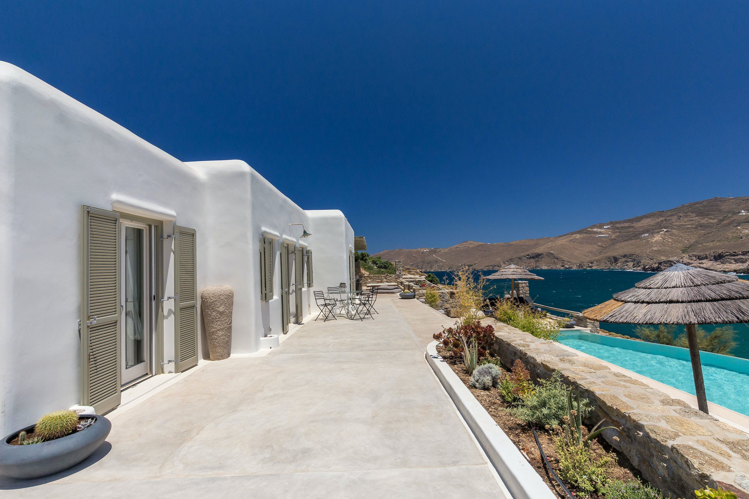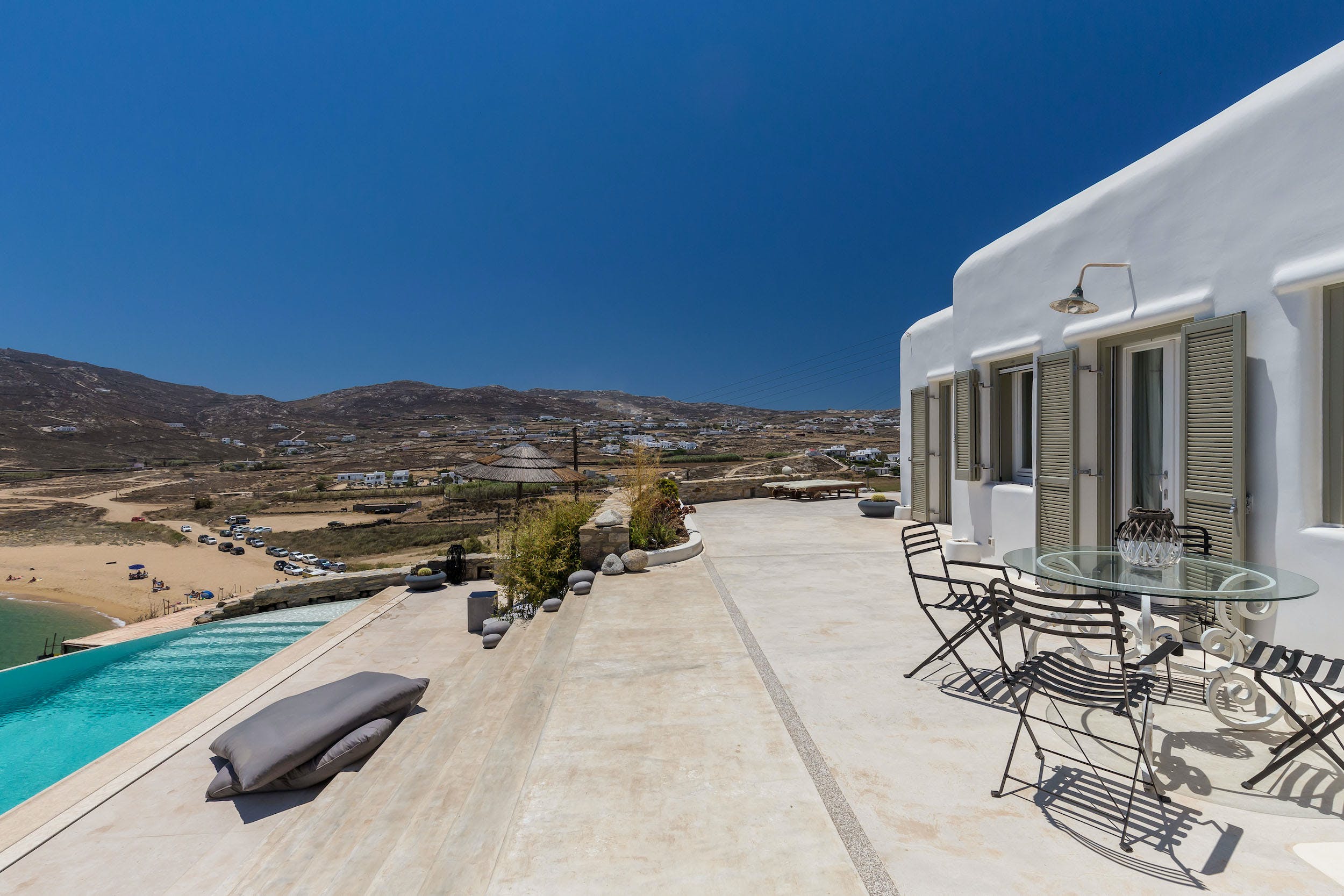 Turquoise Bay occupies a glorious position on the headland to the bay, looking out over its sparkling blue waters and offering an idyllic Mykonos retreat. There is direct access, via steps, to the beach from its lower terrace.