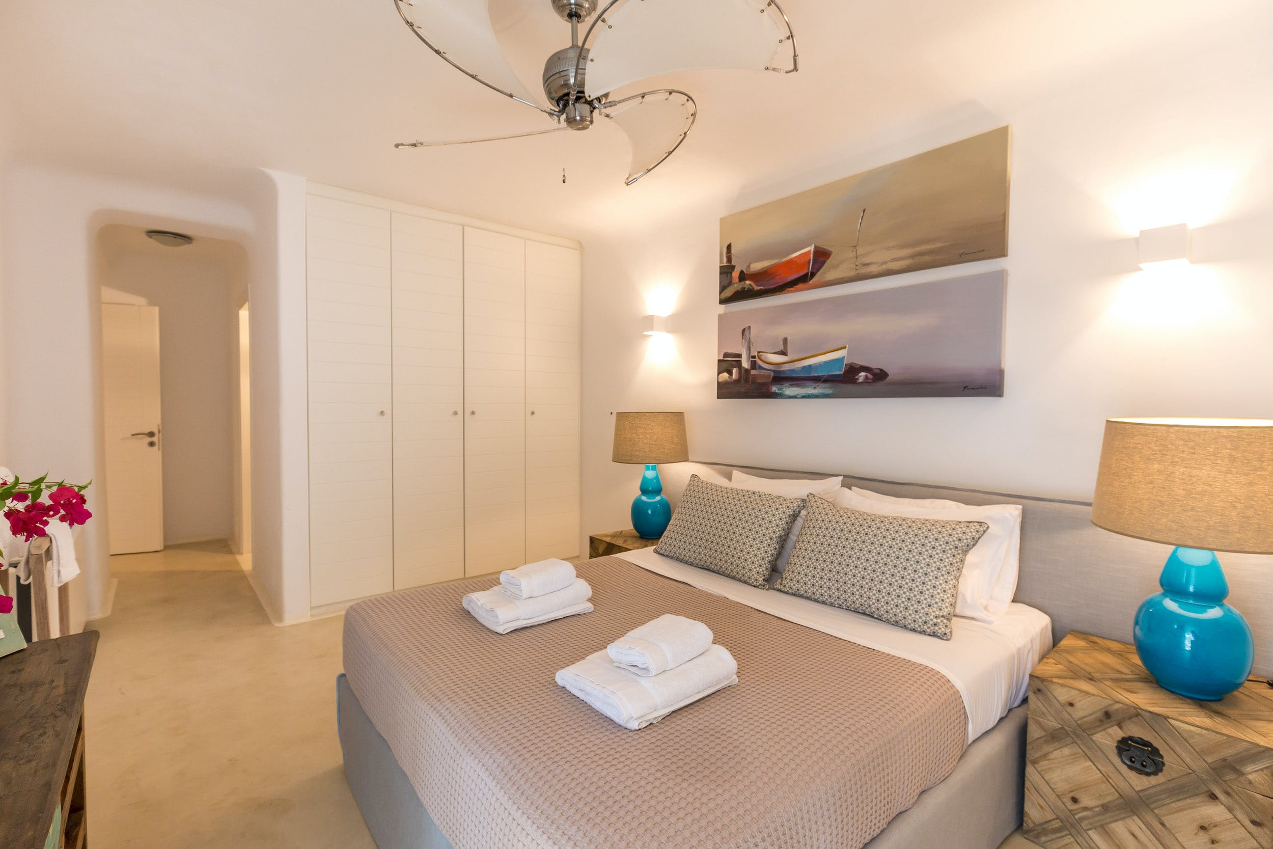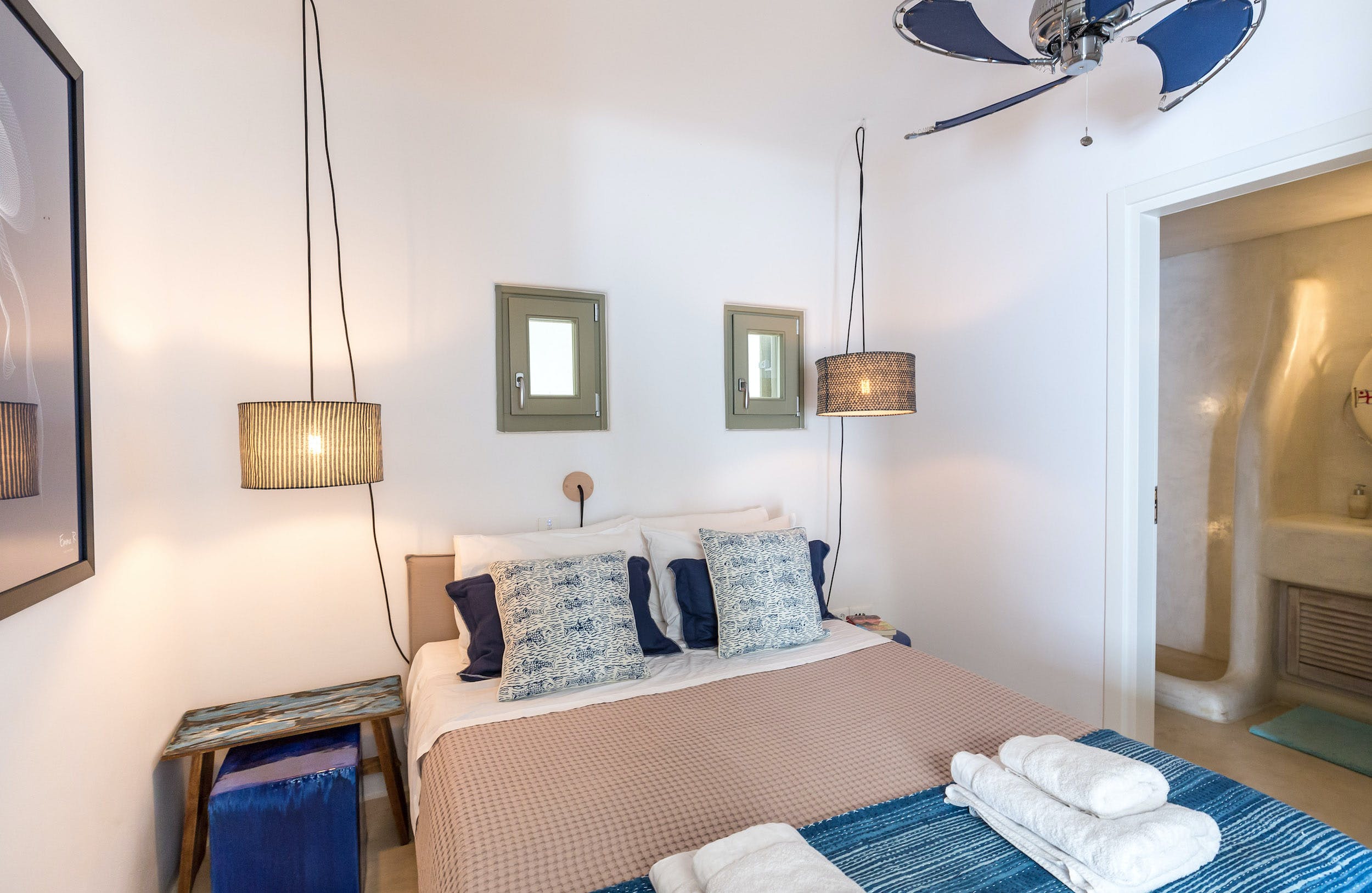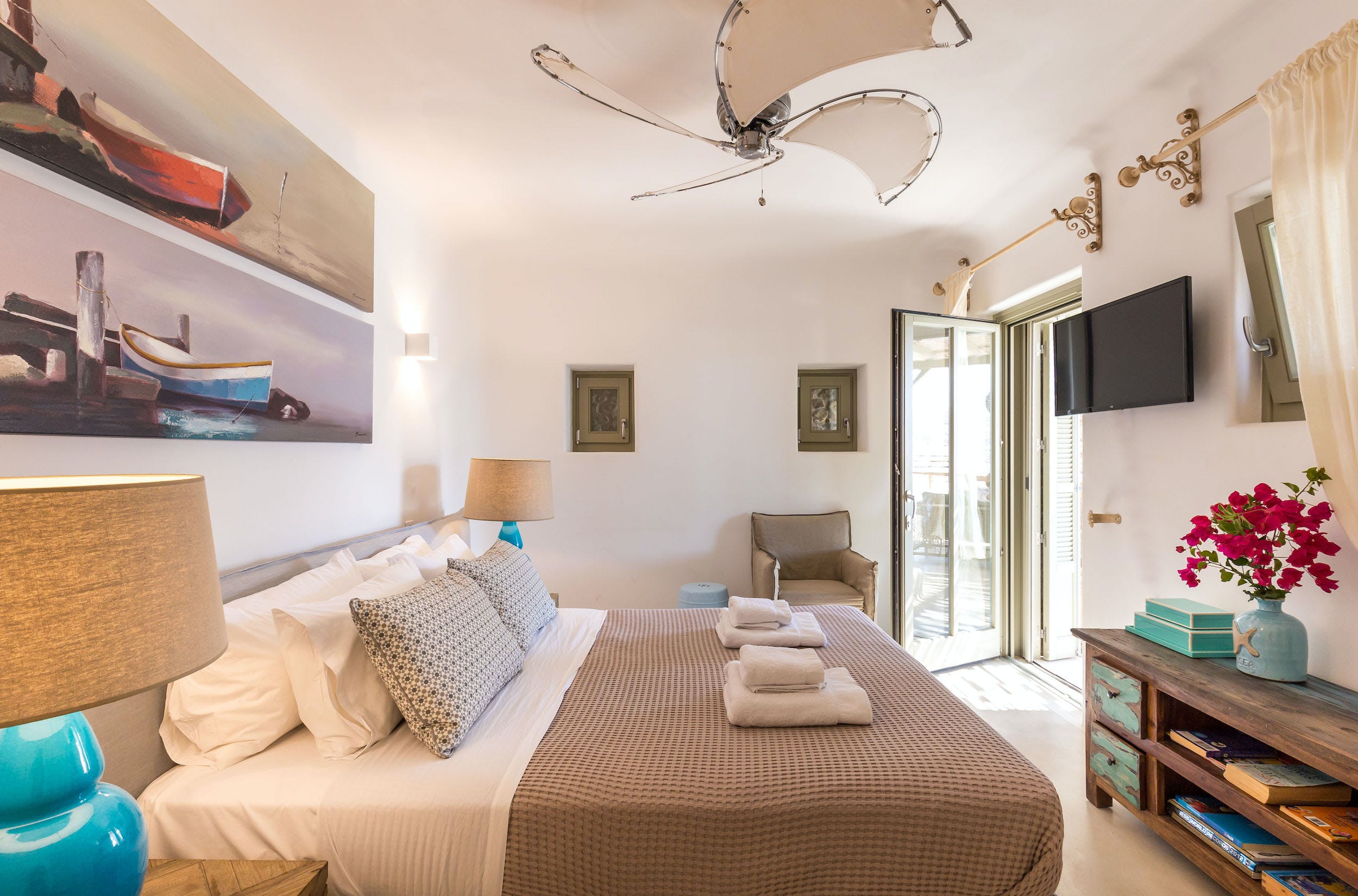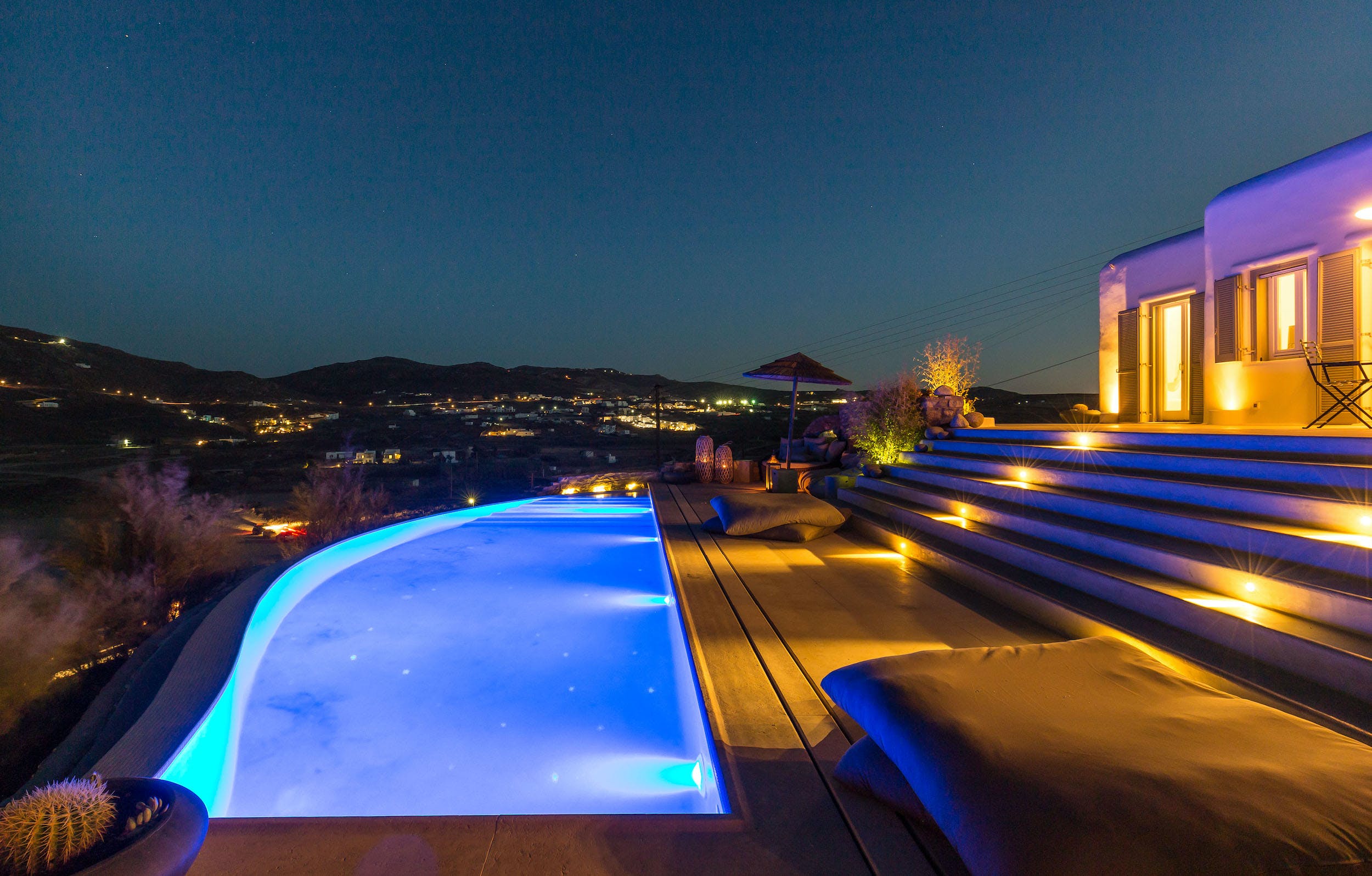 Turquoise Bay occupies a glorious position on the headland to the bay, looking out over its sparkling blue waters and offering an idyllic Mykonos retreat. There is direct access, via steps, to the beach from its lower terrace.