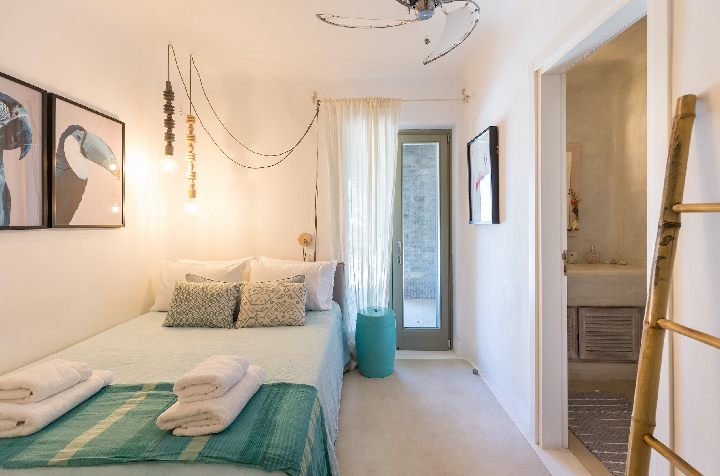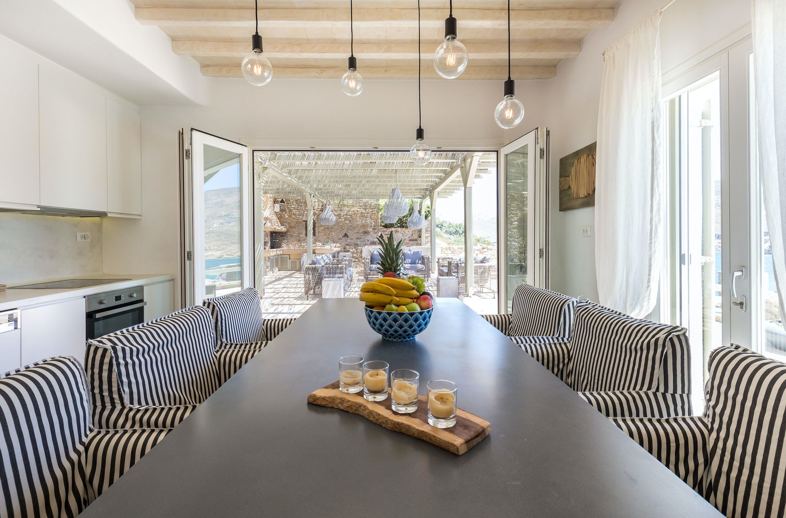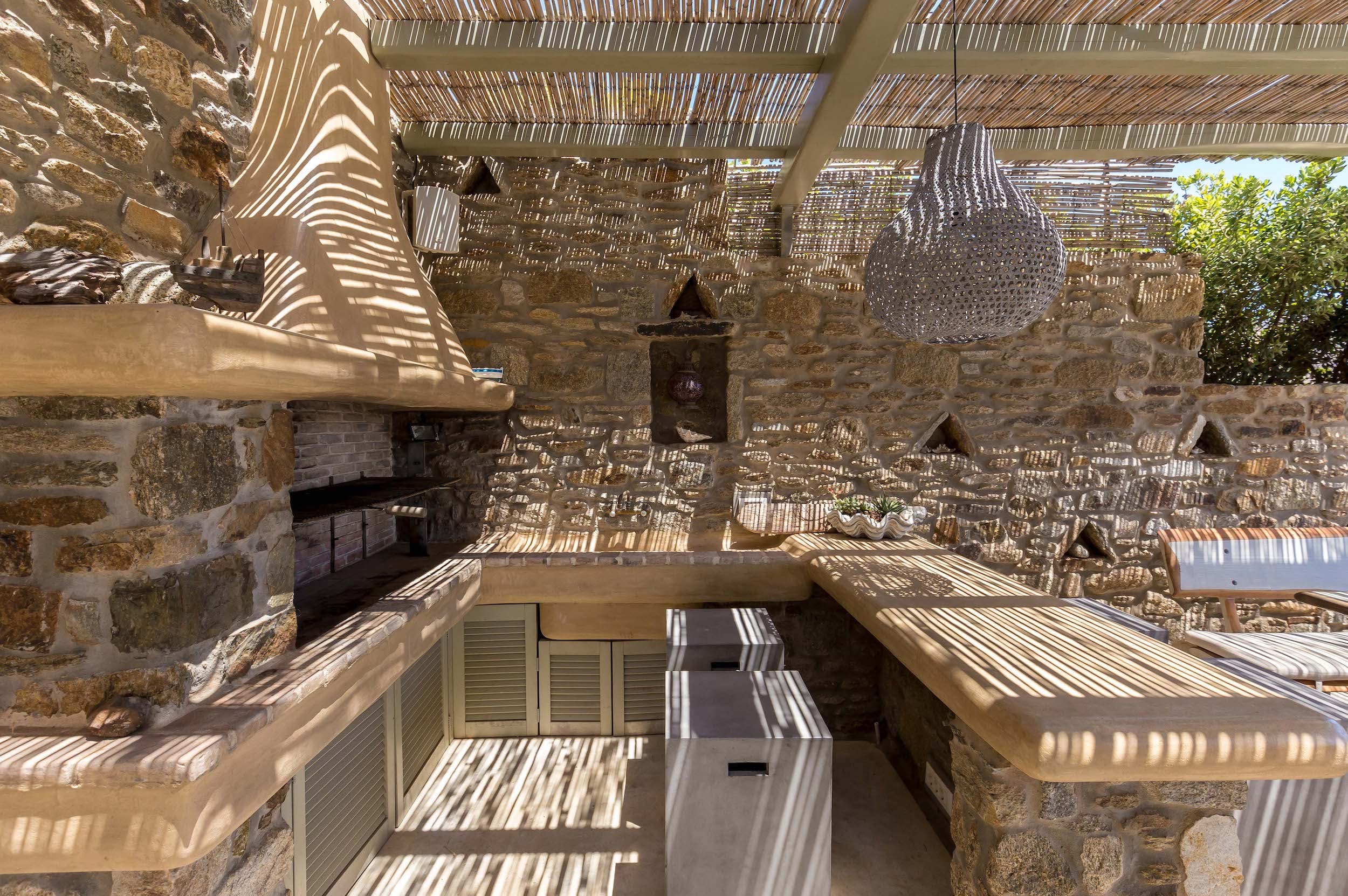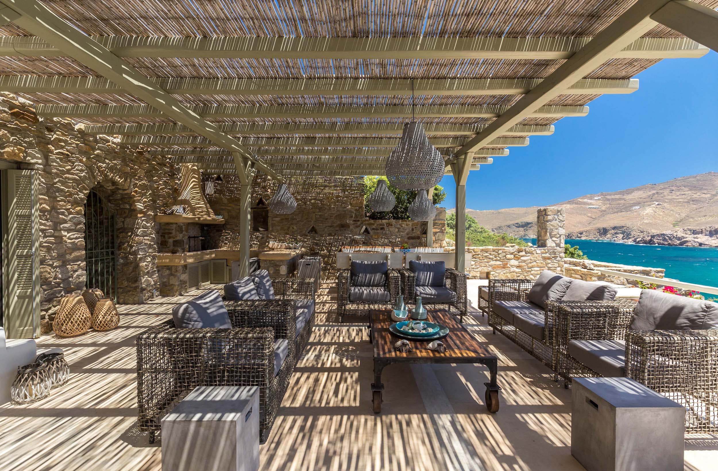 On the terrace above, the cool white cubes of Turquoise Bay reflect the traditional Mykonos design. This terrace boasts a fabulous entertaining space, with outdoor sound system, under the cool shade of a bamboo-clad pergola. Relaxed lounge seating for ten, a summer kitchen and al fresco dining space are perfectly positioned for soaking up the incredible views across Ftelia bay.