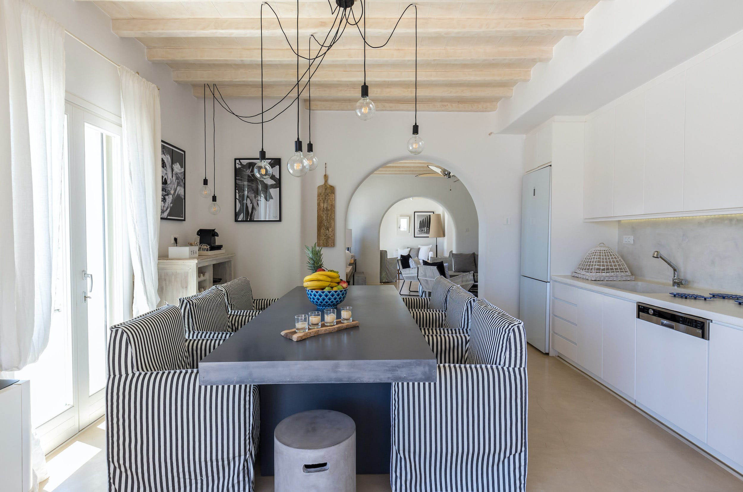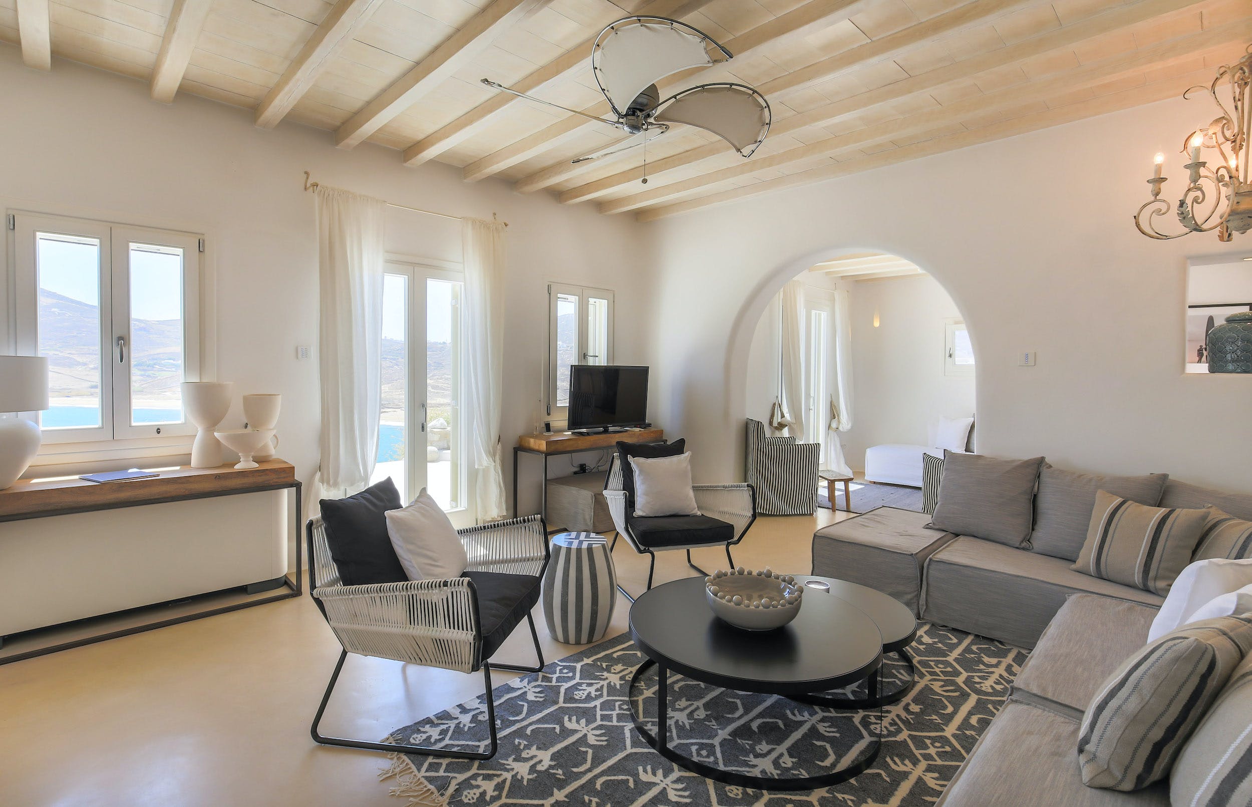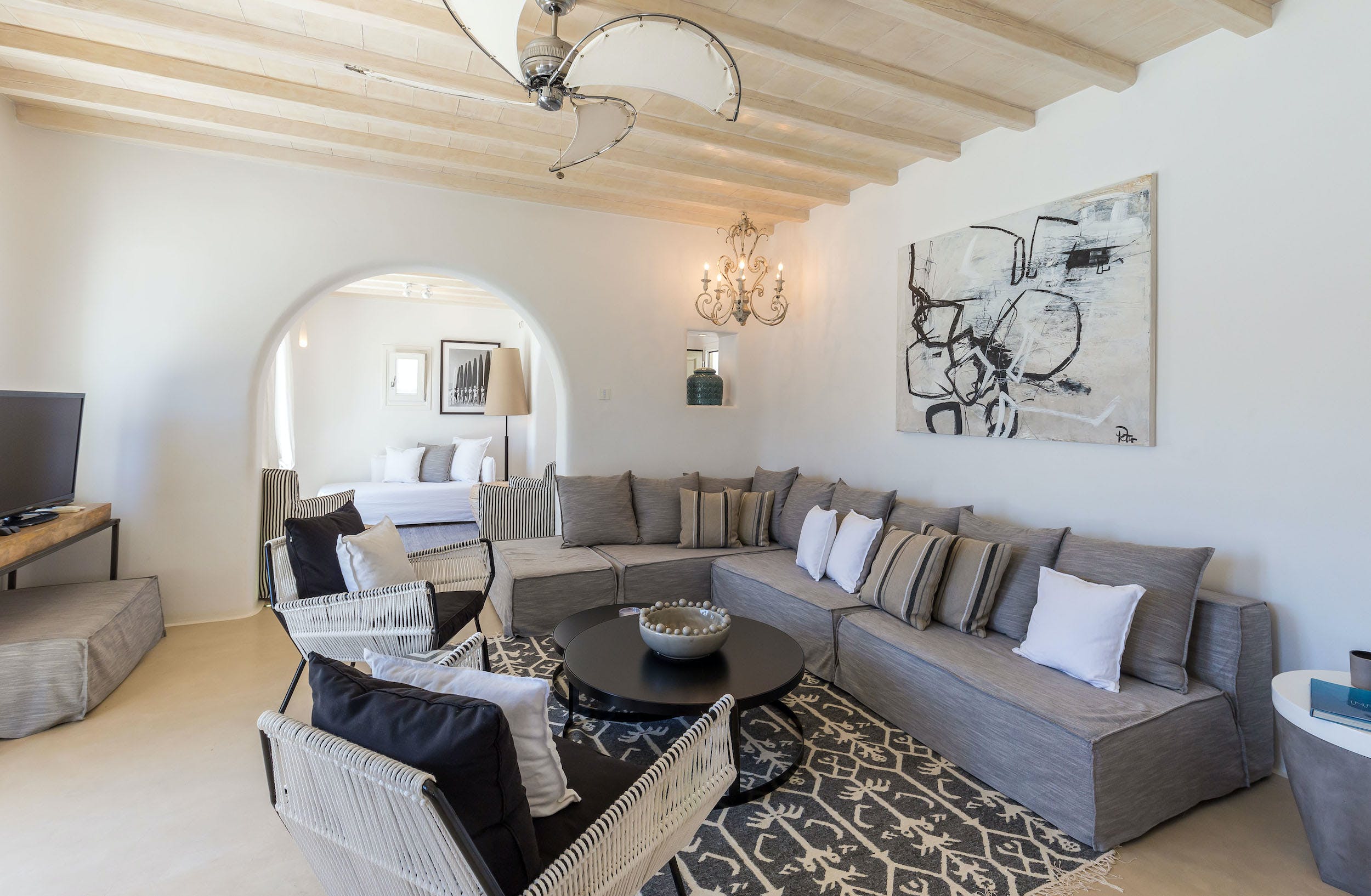 On this lower level of the property, there are further entertaining spaces: a cosy interior dining space, seating six; a bright, airy kitchen, all in white; and casual sofa seating overlooking the sparkling Aegean. Neutral shades of white, grey and taupe predominate.