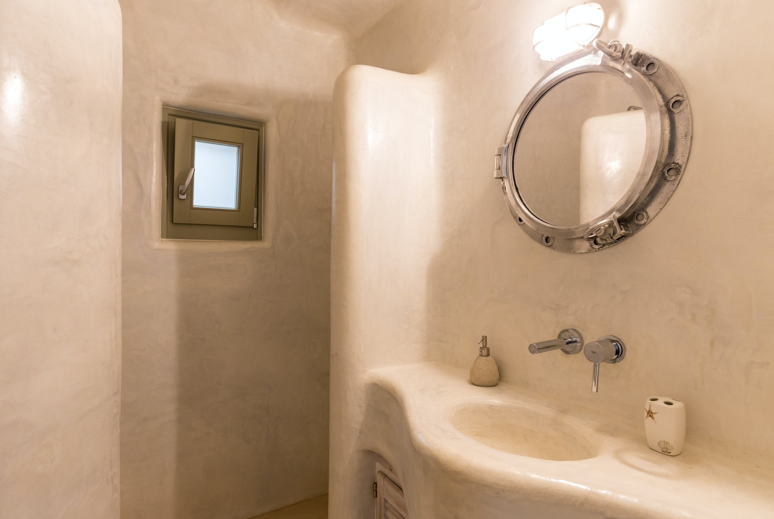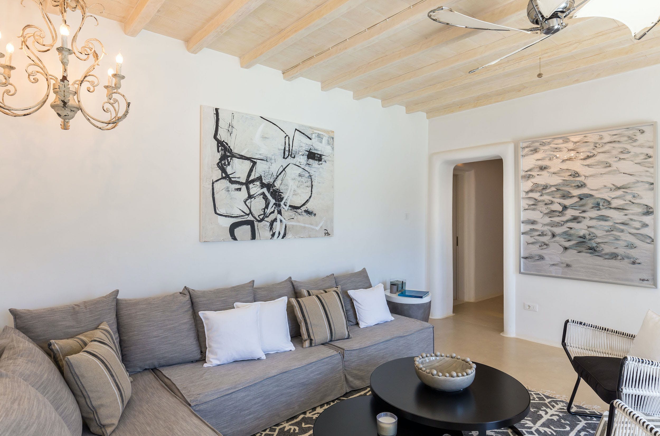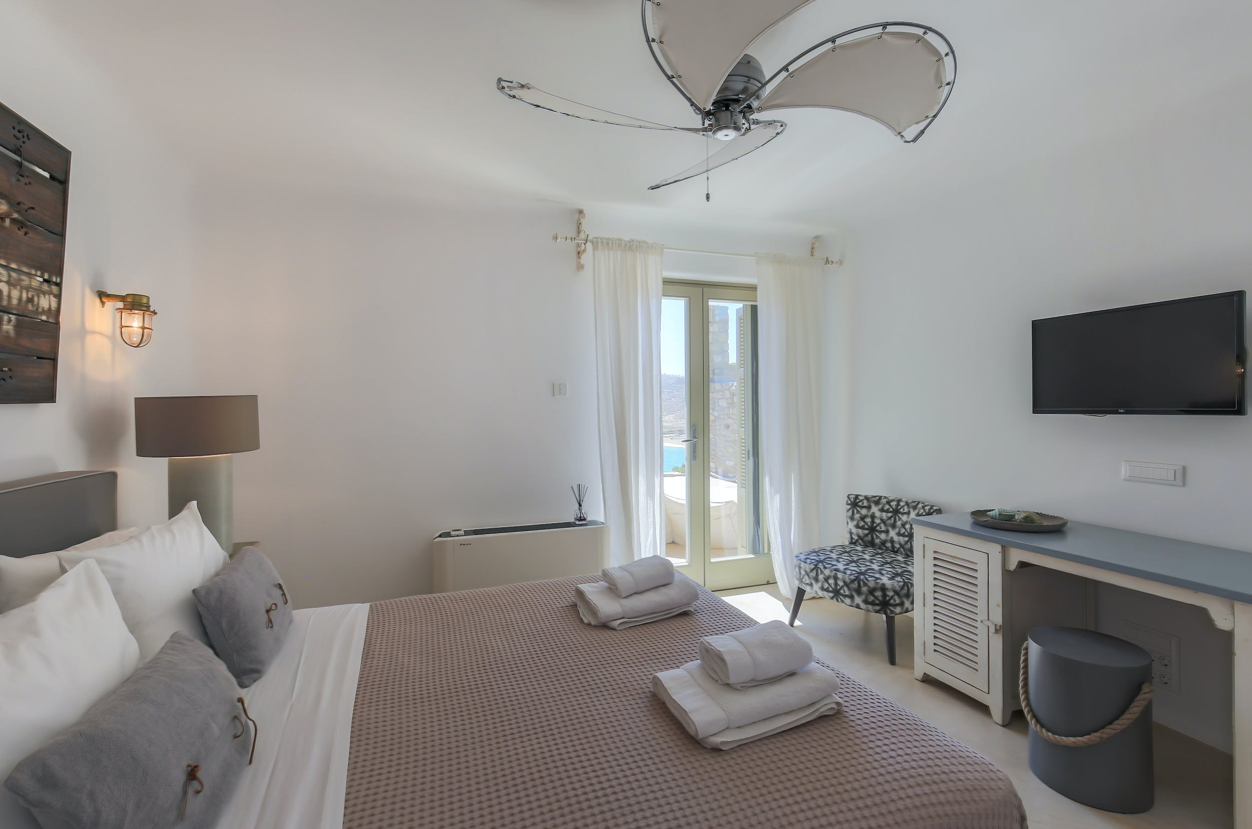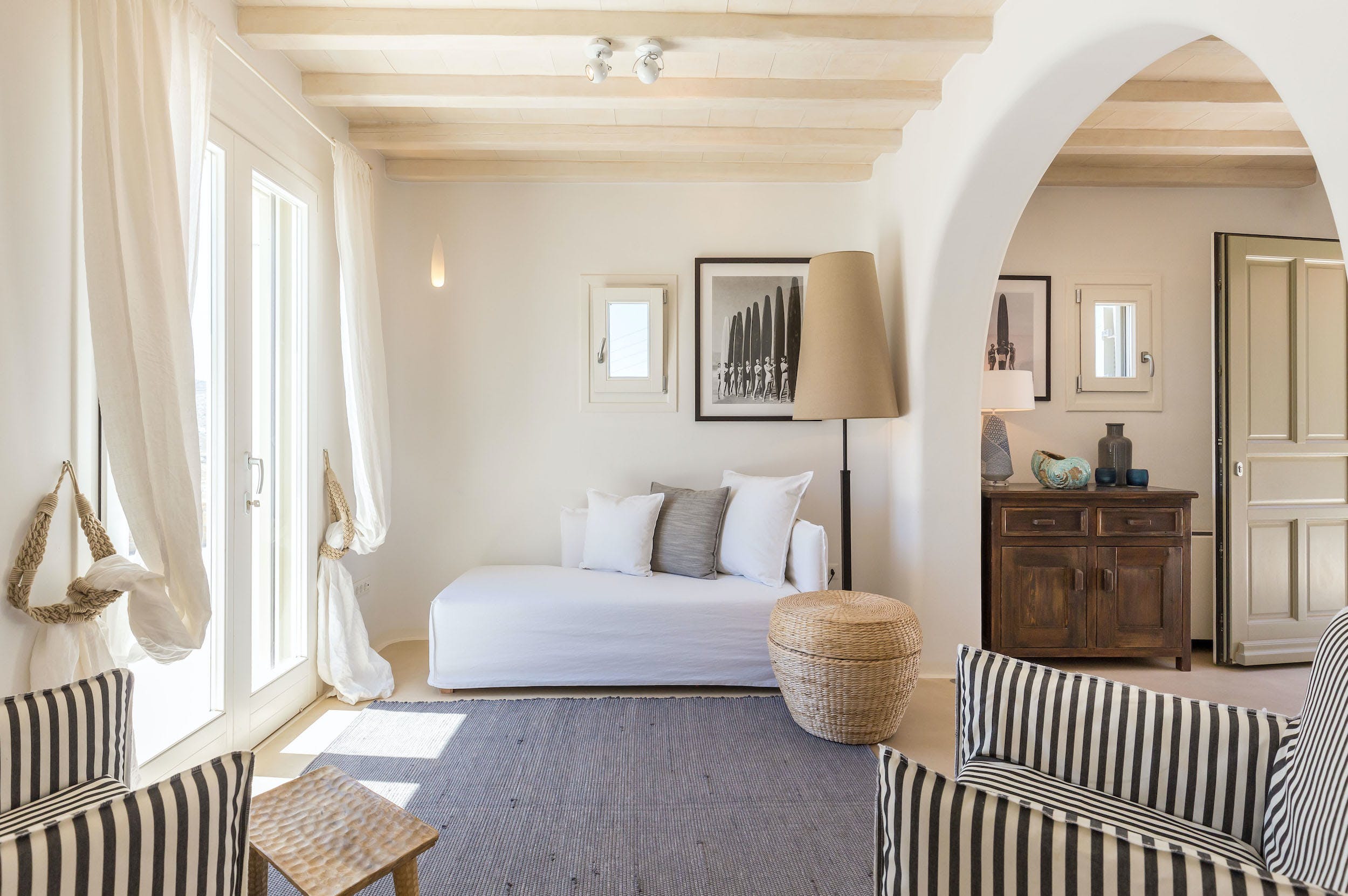 On this lower level of the property, there are further entertaining spaces: a cosy interior dining space, seating six; a bright, airy kitchen, all in white; and casual sofa seating overlooking the sparkling Aegean. Neutral shades of white, grey and taupe predominate.