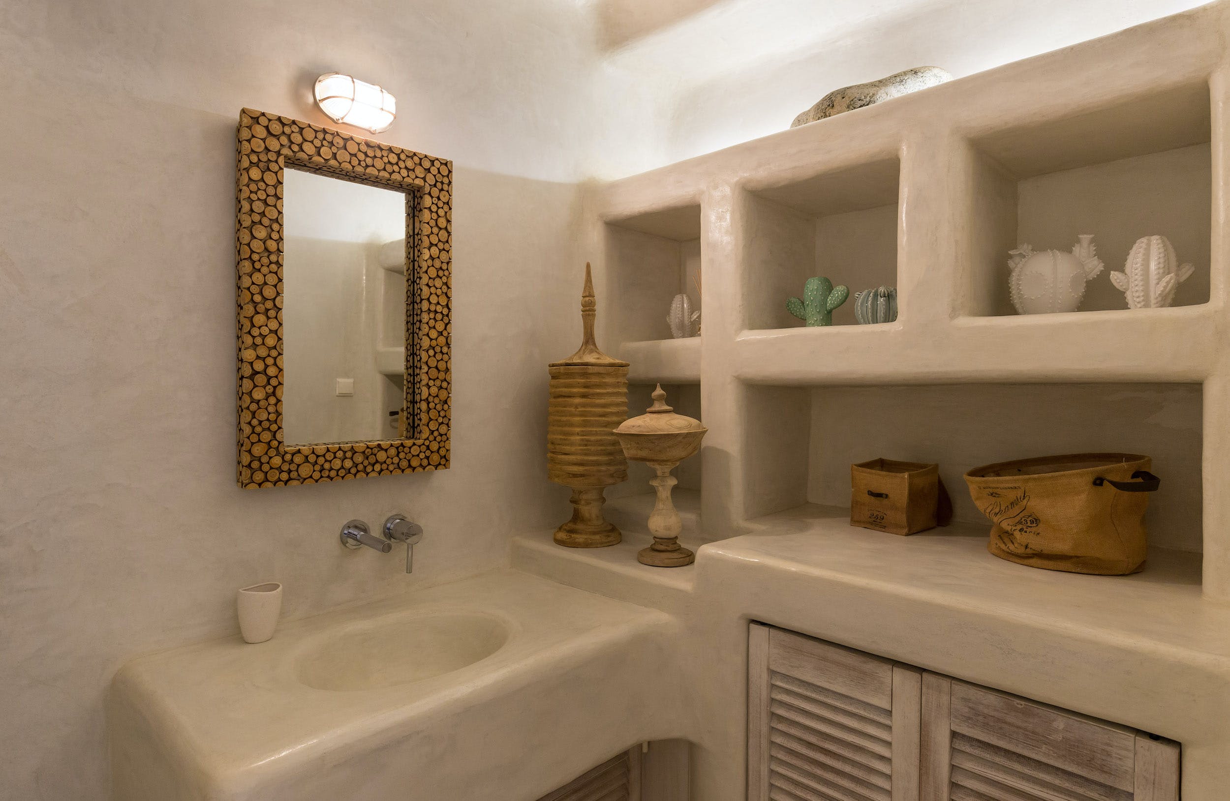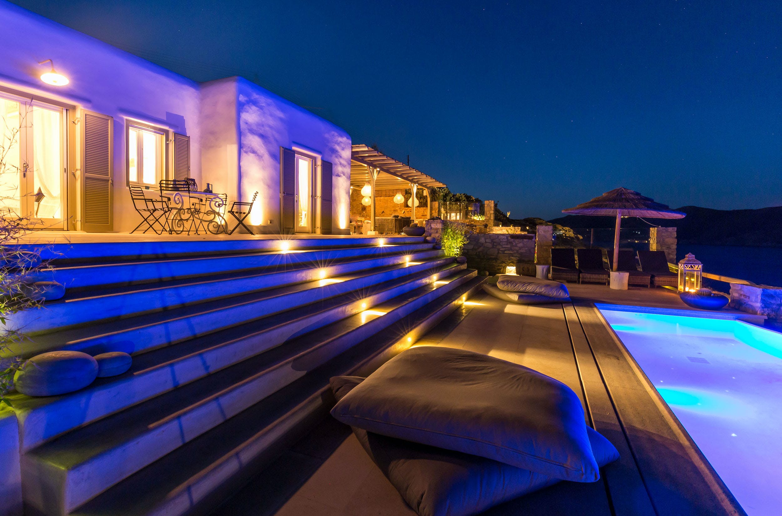 On the lower terrace, the sparkling infinity pool offers a breath-taking vista of Ftelia’s turquoise waters. Relax poolside on one of the sun-drenched loungers and you may mistake this quiet spot for a private haven.