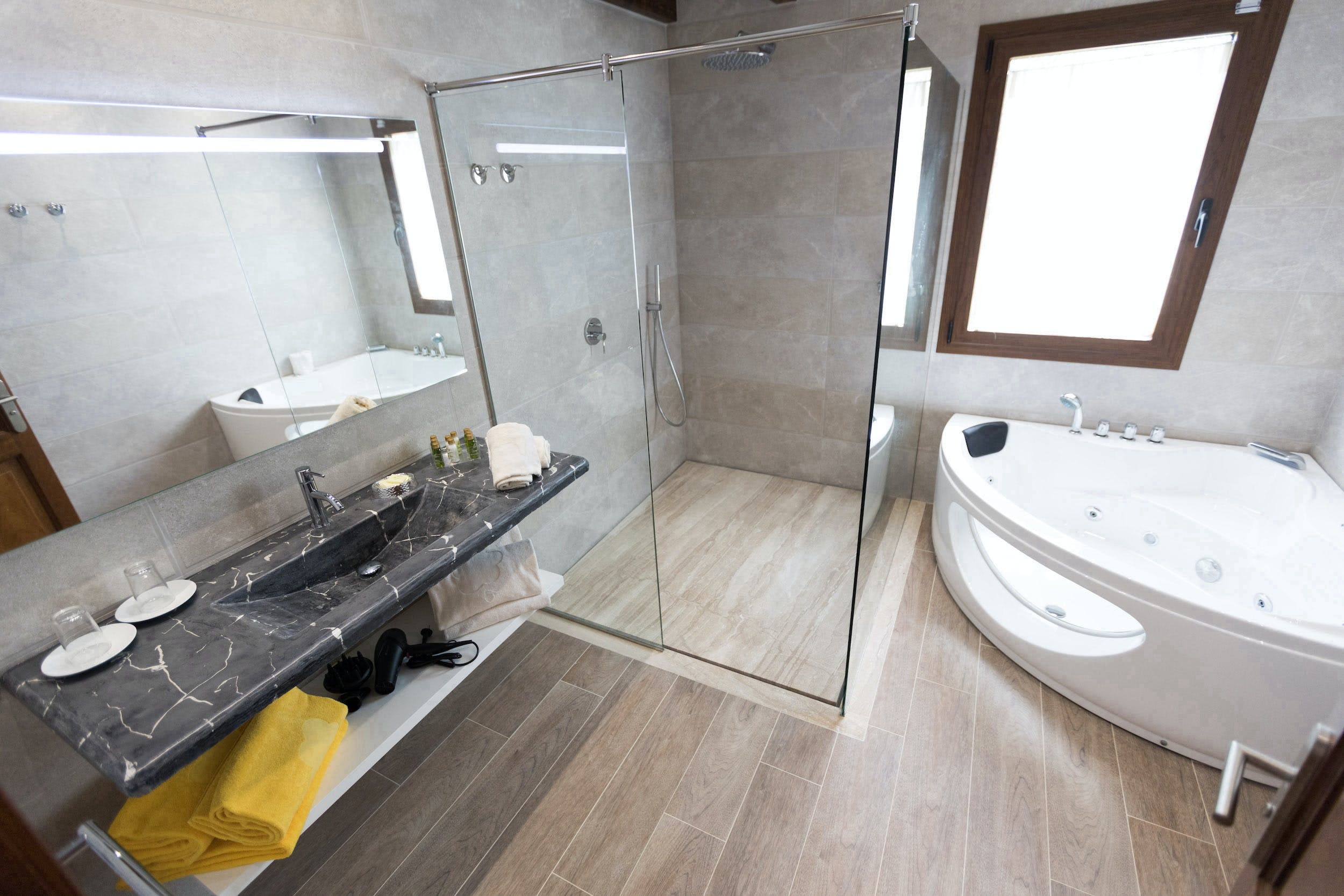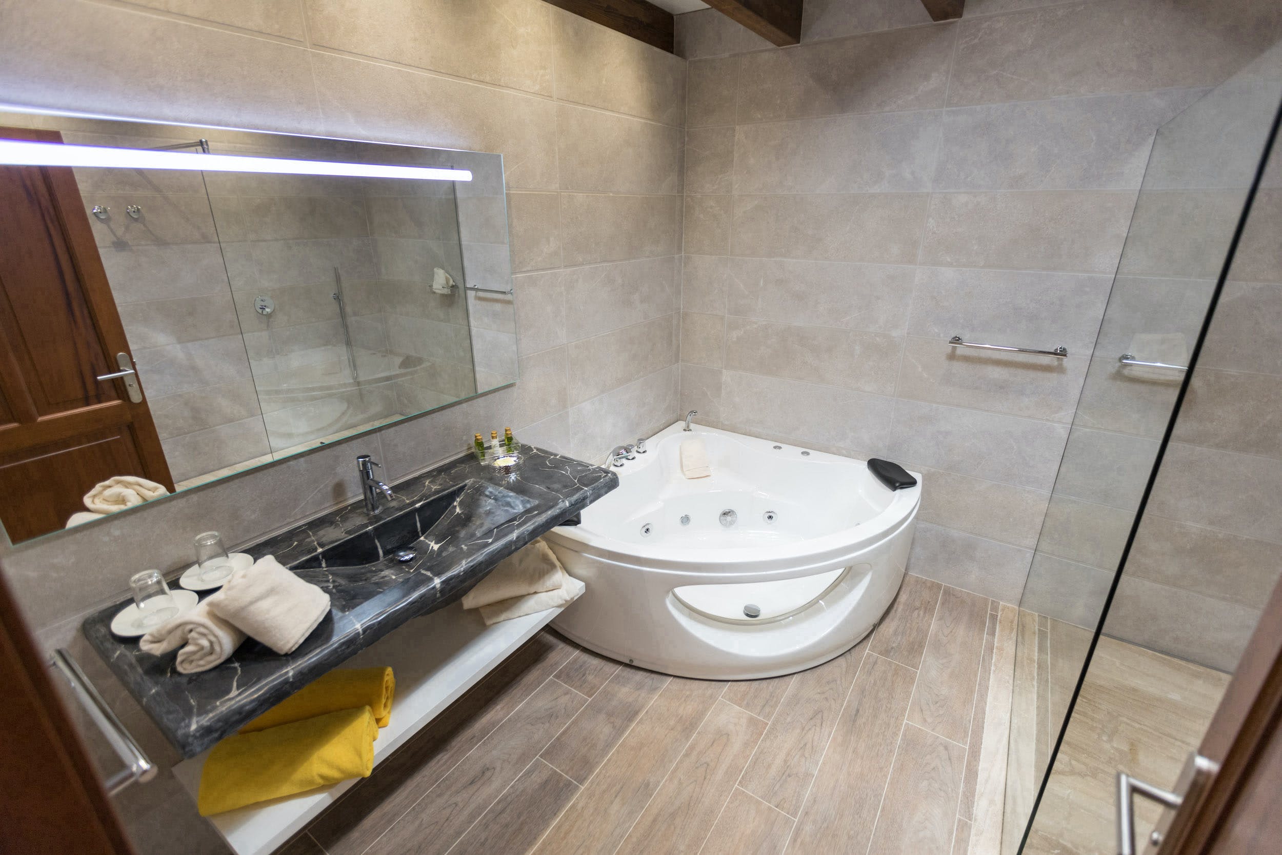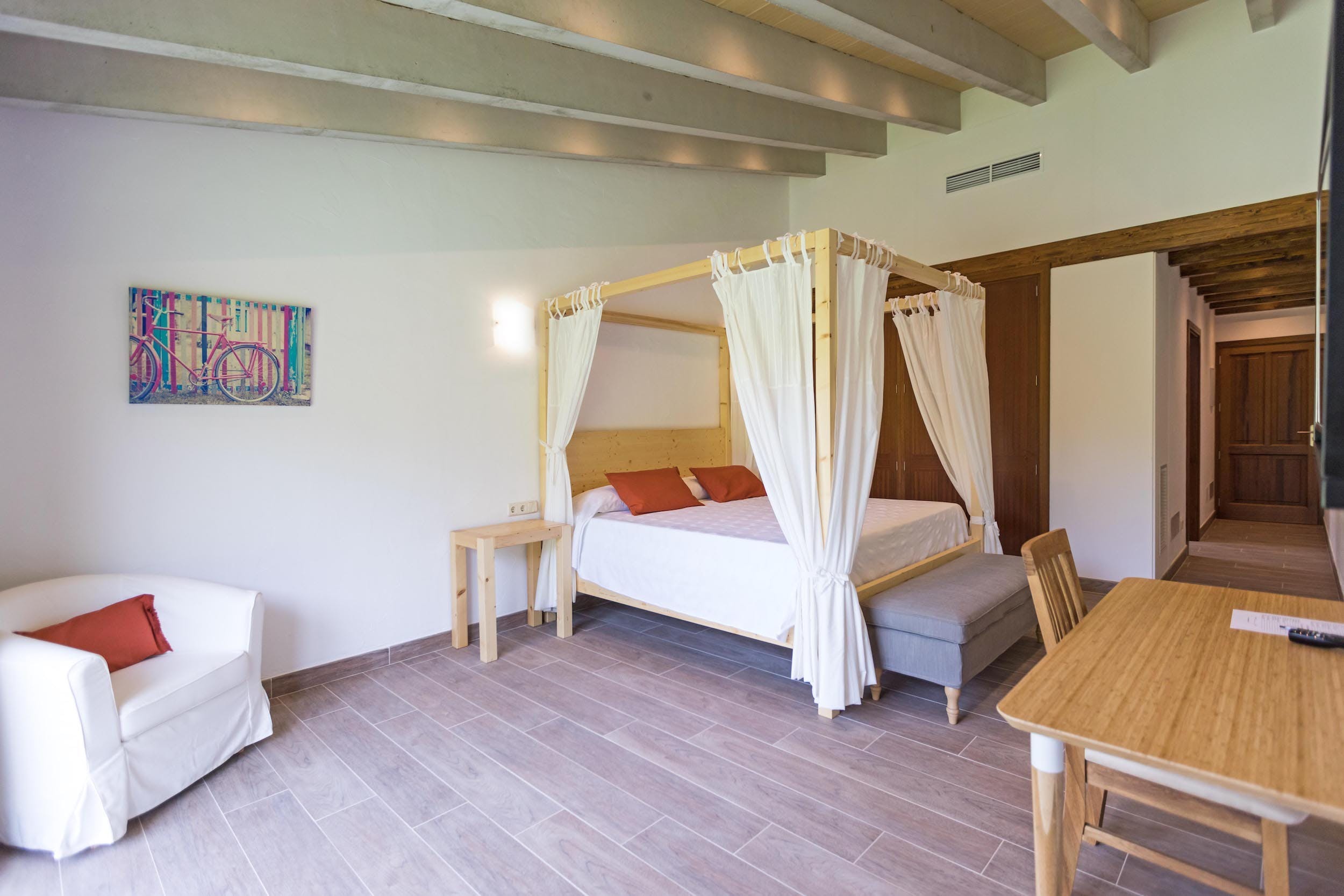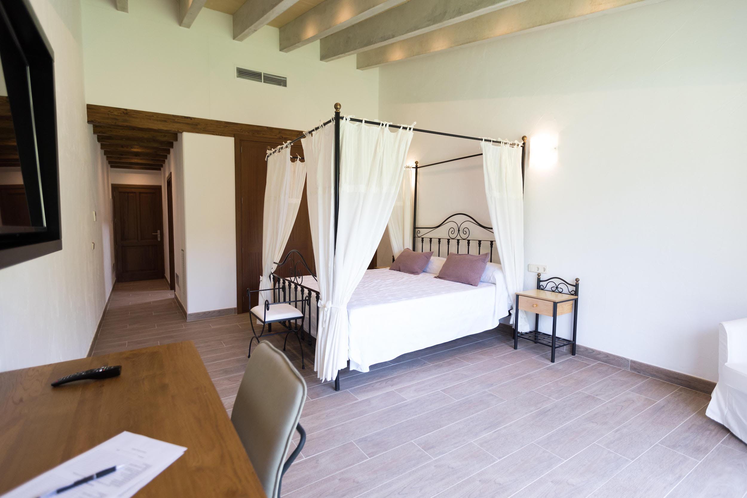 King size bed, TV and air conditioning. En-suite bathroom with hydro-massage bath, shower, WC and hairdryer.