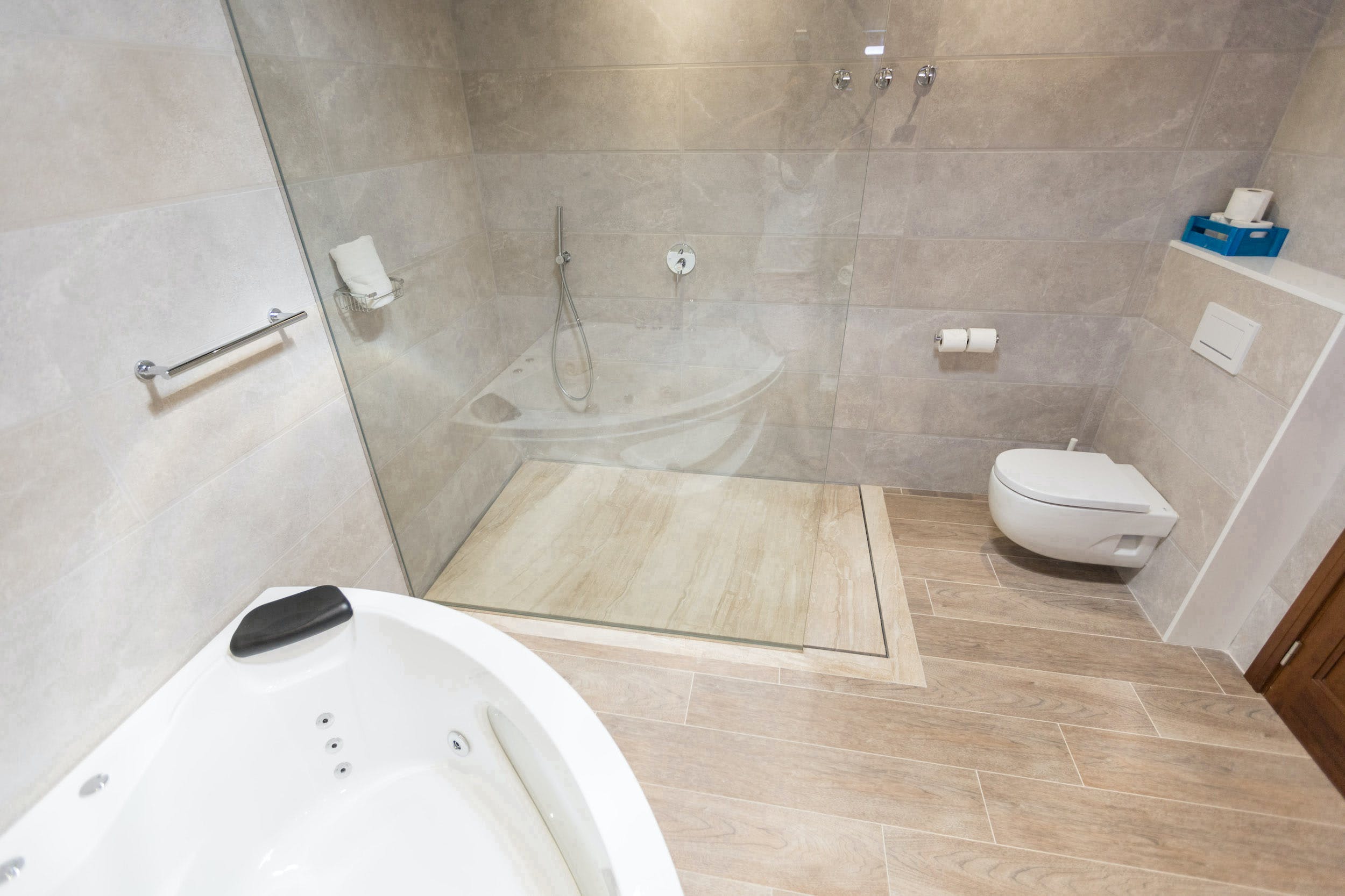 King size bed, double sofa bed, air conditioning. En-suite bathroom with hydro-massage bath, shower, WC and hairdryer.