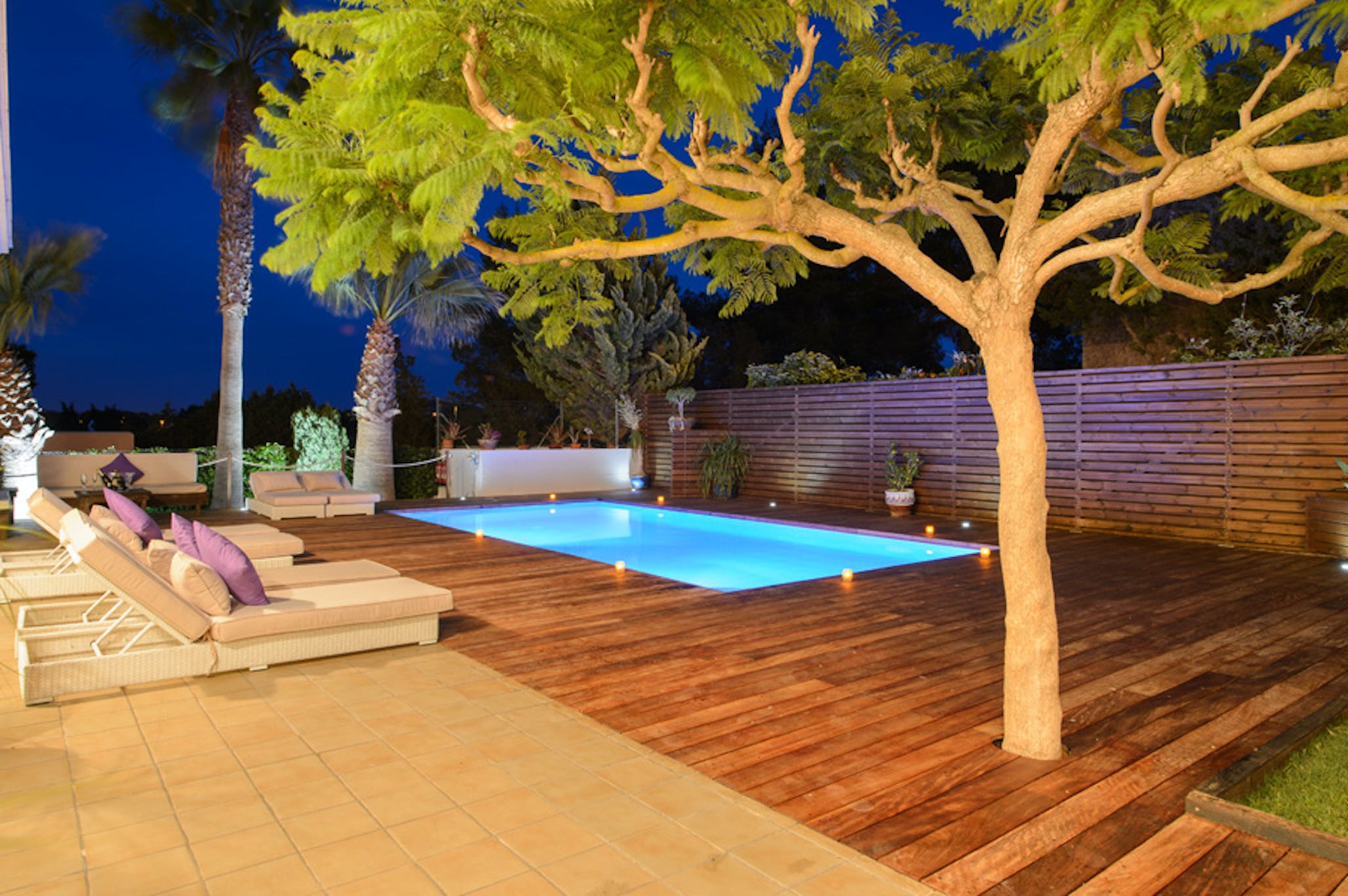 The pool is surrounded by an elegant wooden terrace and a row of sun loungers where you can enjoy the Ibizan sun. Tall palm trees frame the view of rooftops and distant hills from poolside seating, while at the far end of the garden, a tall, craggy pine tree shields the sun.