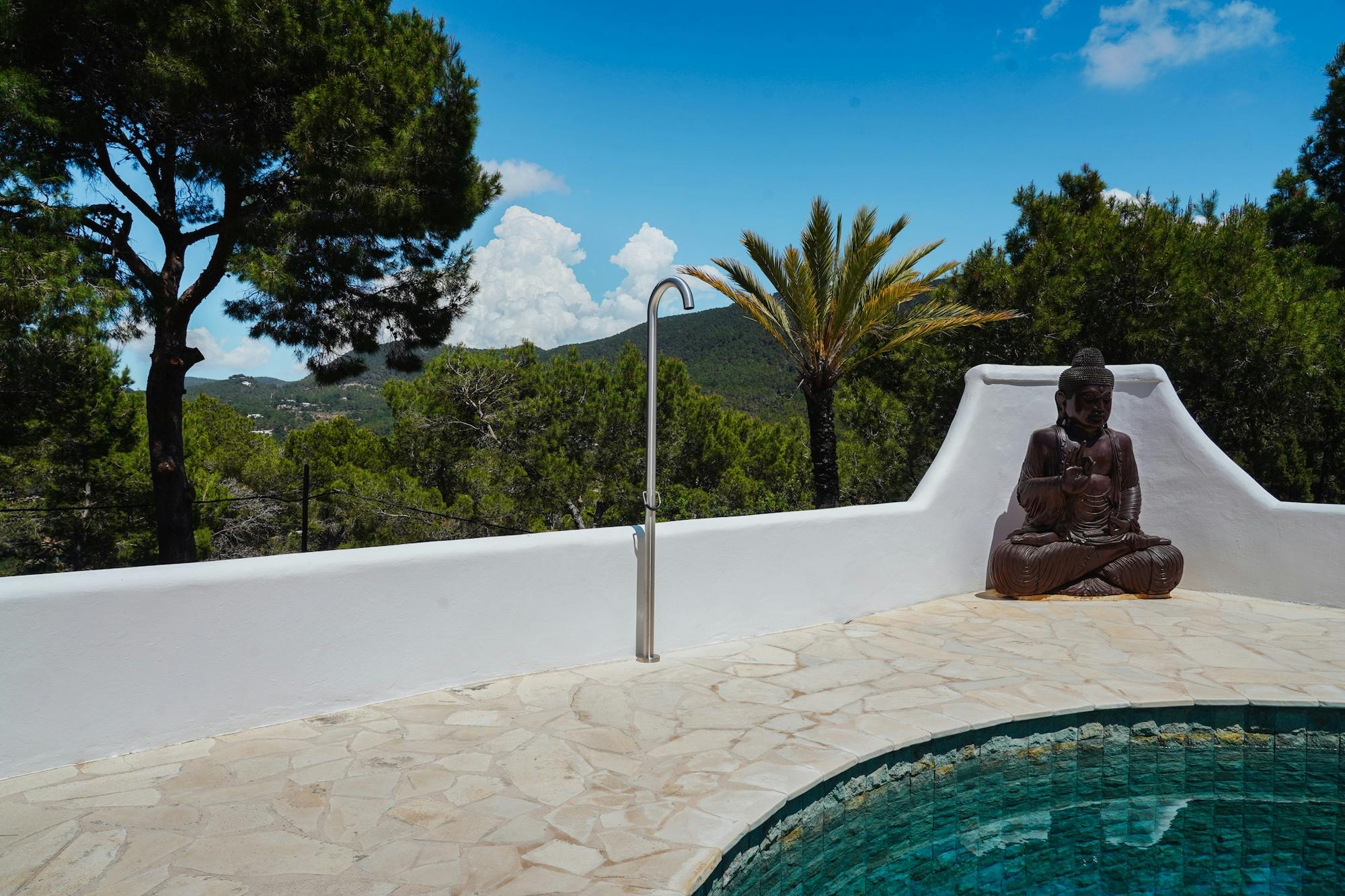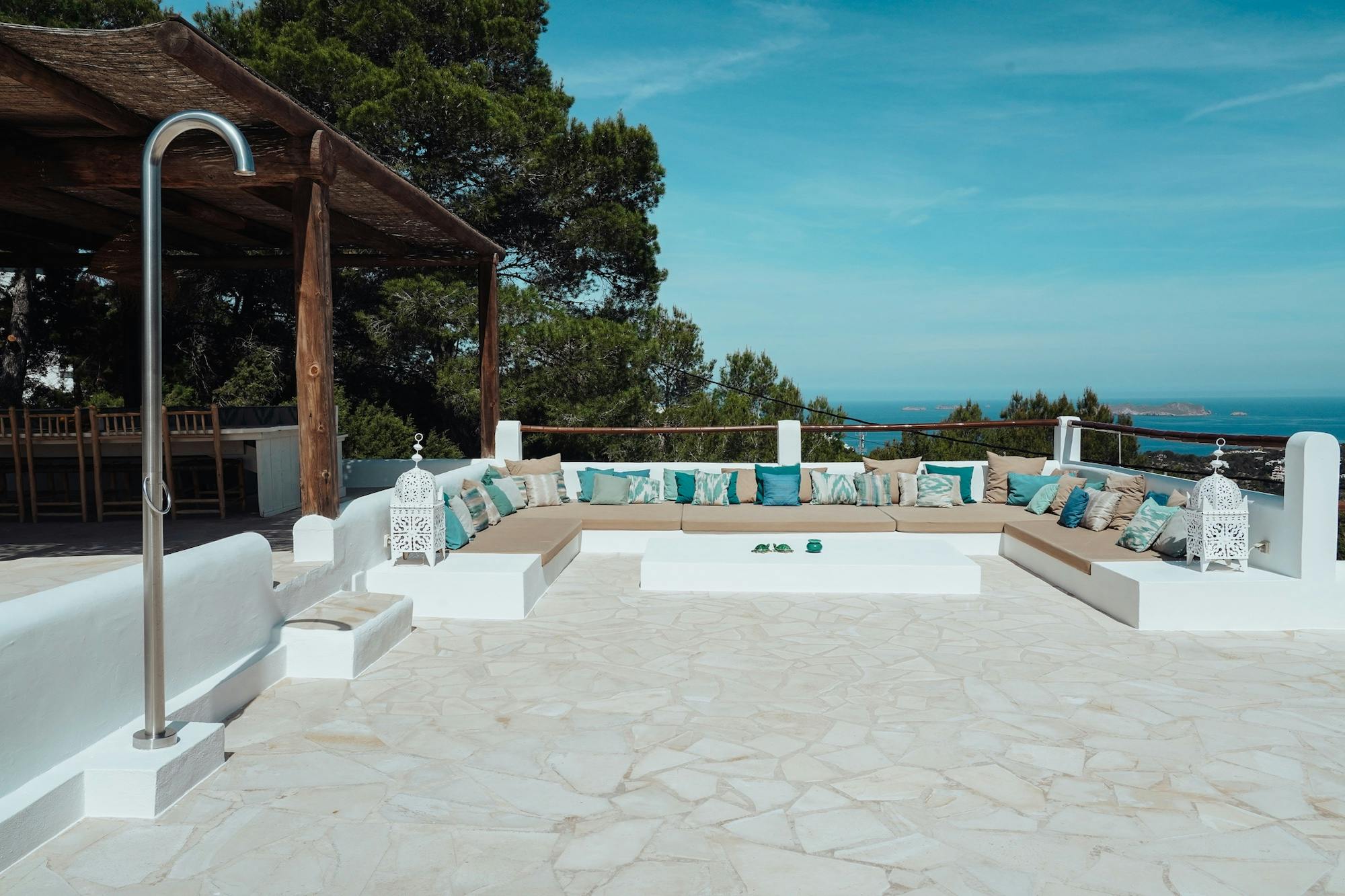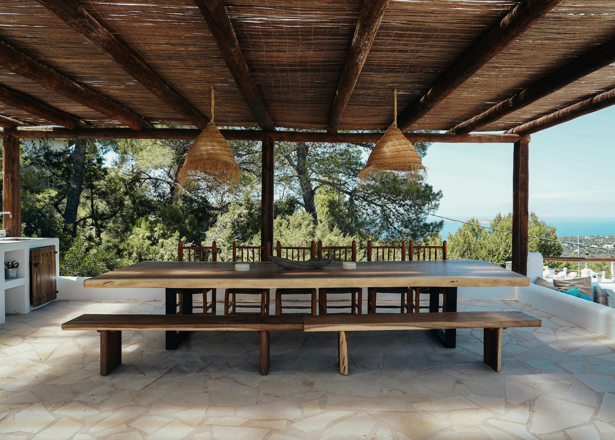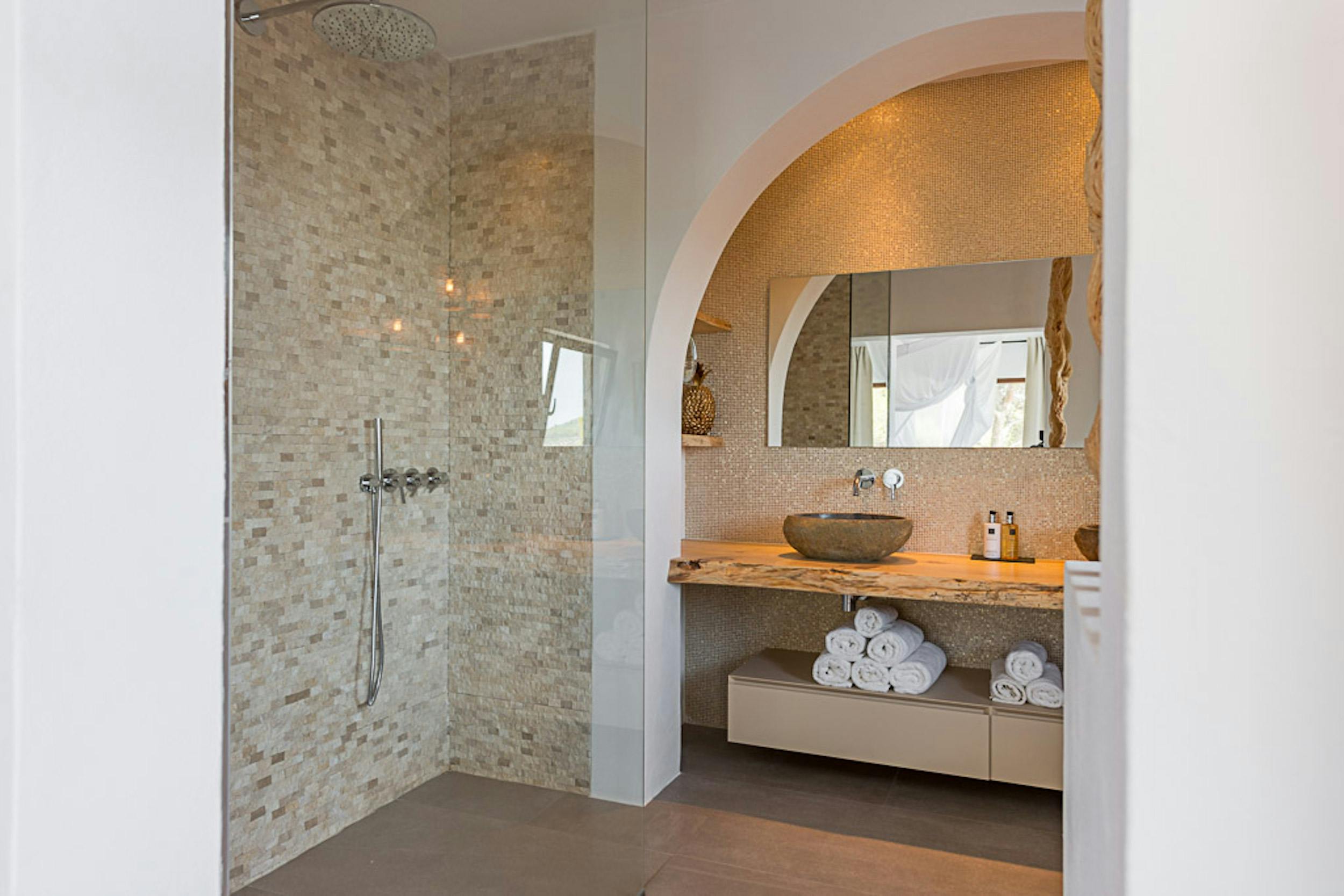 Zarza Dorada has three luxury bathrooms with wonderful rain showers. The sabina wooden bathroom furniture, including Balinese washbasins, provide the mix of Bali and Ibiza that you will find throughout the whole house. The master bedroom also offers its guests a double rain shower and an outdoor bath. Take a bath or shower in the outdoors and enjoy the wonderful warm water with a phenomenal view.