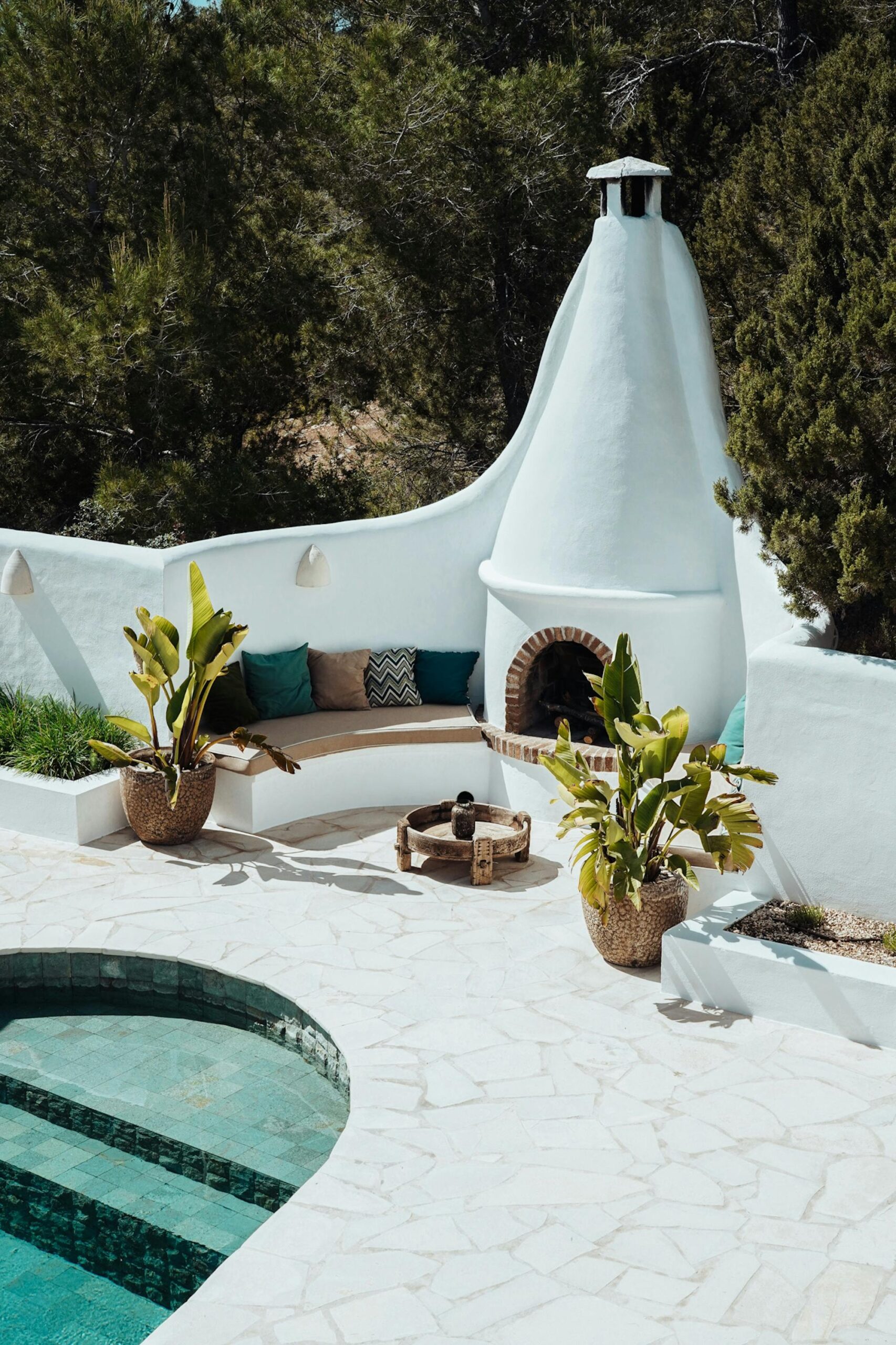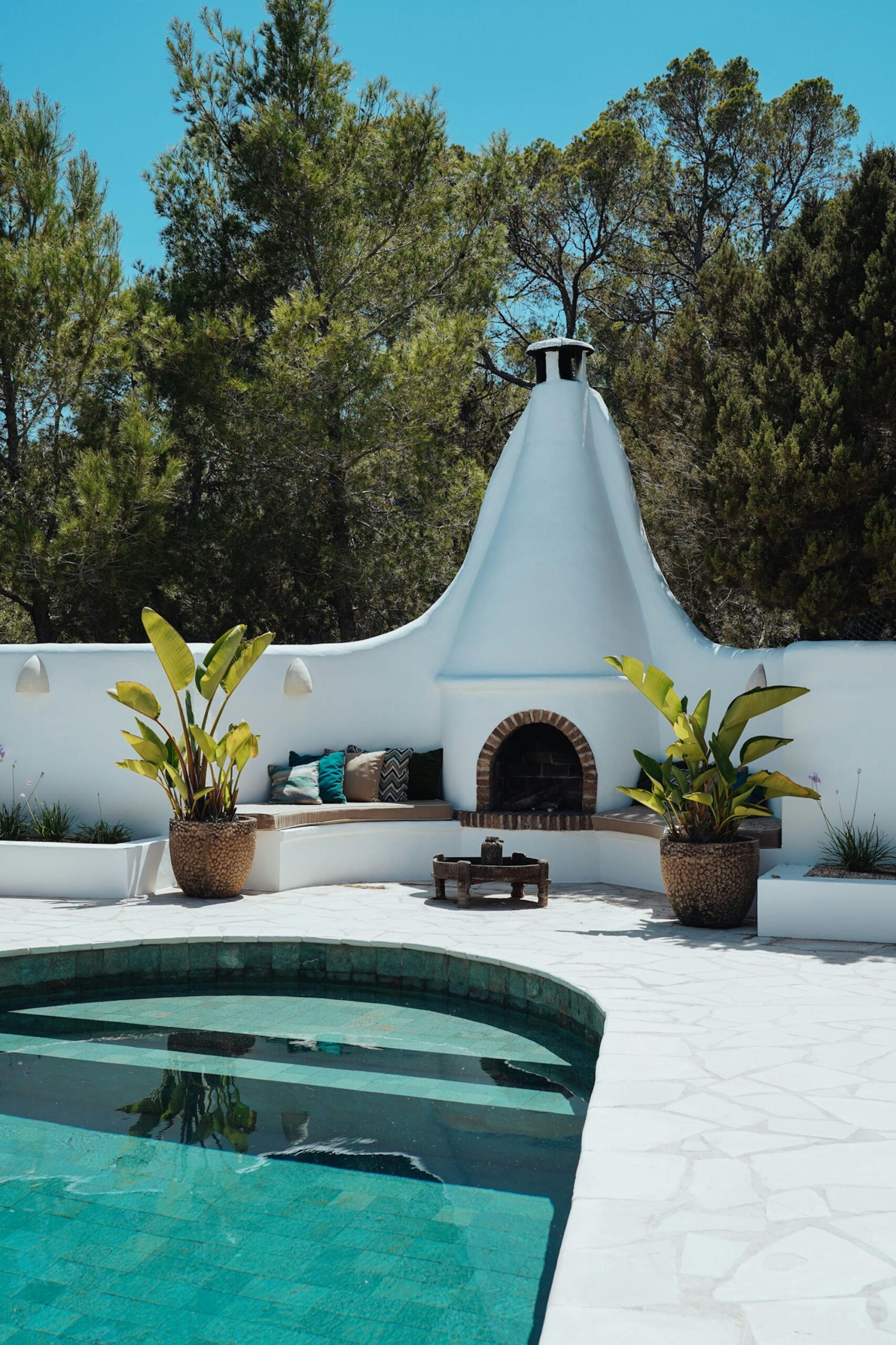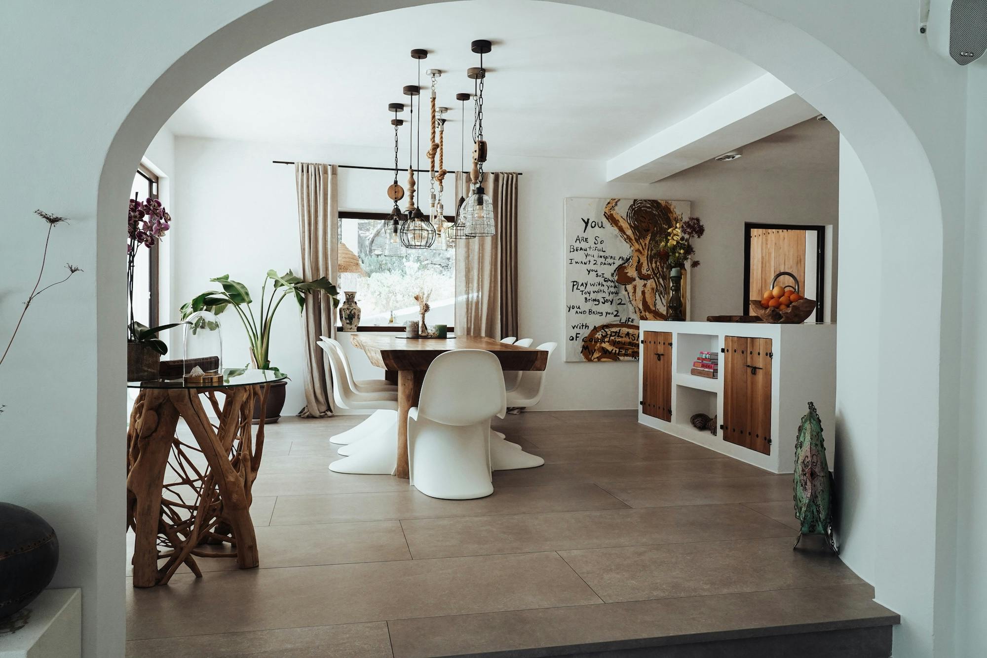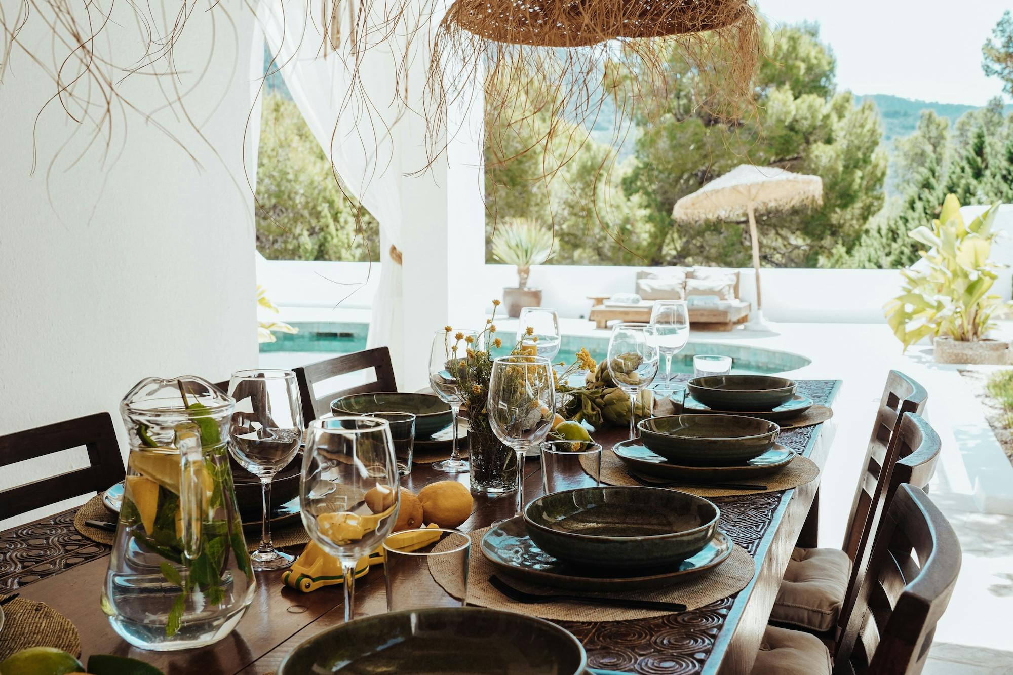 The interior of this villa can best be described as a tasteful mix of Ibicenco and Balinese influences. As a guest, you really have everything here! In the living room you will find a wonderful lounge sofa and a 62-inch television, including a satellite receiver and DVD player. The professional dolby surround system completes the cinema feeling – all you need for a wonderful evening at home. Light the fireplace, pour a glass of wine, turn on a movie and just relax!