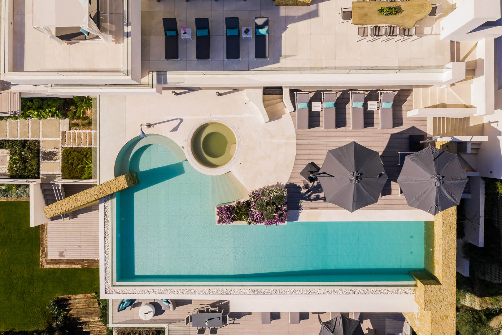 100 m² infinity pool, outdoor jacuzzi, BBQ zones, and alfresco dining areas.